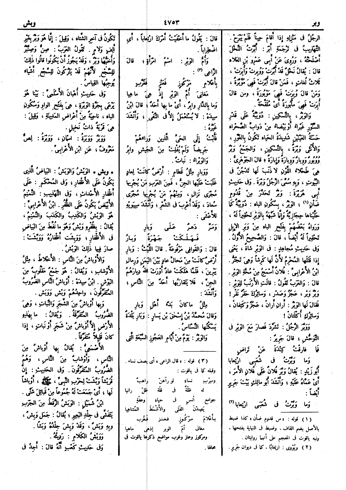 قال يقول ما أَخفيت أَمرك ارتعاباً أَي اضطراباً وأُمُّ الوَبْرِ اسم امرأَة قال الراعي بأَعلامِ مَرْكُوزٍ فَعَنْزٍ فَغُرَّبٍ مَغاني أُمِّ الوَبْرِ إِذ هي ما هيا وما بالدار وابِرٌ أَي ما بها أَحد قال ابن سيده لا يستعمل إِلا في النفي وأَنشد غيره فَأُبْتُ إِلى الحيّ الذين وراءَهمْ جَرِيضاً ولم يُفْلِتْ من الجيشِ وابِرُ والوَبْراءُ نبات ووَبارِ مثل قَطام أَرض كانت لعاد غلبت عليها الجن فمن العرب من يجريها مجرى نَزالِ ومنهم من يجريها مجرى سُعادَ وقد أُعرب في الشعر وأَنشد سيبويه للأَعشى ومَرَّ دَهرٌ على وَبارِ فَهَلَكَتْ جَهْرَةً وبارُ قال والقوافي موفوعة قال الليث وَبارِ أَرضٌ كانت من مَحالِّ عادٍ بين اليمن ورمال يَبْرِينَ فلما هلكت عاد أَورث الله ديارهم الجنَّ فلا يتقاربها أَحد من الناس وأَنشد مِثْل ما كان بَدْءُ أَهلِ وَبارِ وقال محمد بن إِسحق بن يسار وبَارِ بلدة يسكنها النَّسْنَاسُ والوَبْرُ يوم من أَيام العجوز السبعة التي تكون في آخر الشتاء وقيل إِنما هو وَبْر بغير أَلف ولام تقول العرب صِنٌّ وصِنَّبْر وأُخَيُّهما وَبْر وقد يجوز أَن يكونوا قالوا ذلك للسجع لأَنهم قد يتركون للسجع أَشياء يوجبها القياس وفي حديث أُهبانَ الأَسْلَمِيّ بينا هو يَرْعَى بِحرَّةِ الوَبْرَةِ هي بفتح الواو وسكون الباء ناحية من أَعراض المدينة وقيل هي قرية ذات نخيل ووَبَرٌ ووَبَرَةُ اسمان ووَبْرَةٌ لصٌّ معروف عن ابن الأَعرابي ( وبش ) الوَبْشُ والوَبَشُ البياضُ الذي يكون على الأَظفار وفي المحكم على أَظفار الأَحْداثِ وفي التهذيب النَّمْنِمُ الأَبيض يكون على الظُّفُرِ ابن الأَعرابي هو الوَبْشُ والكَدِبُ والكَدَبُ والنِّمْنِمُ يقال بظُفْرِه وبْشٌ وهو ما نُقِّط من البياض في الأَظفار ووَبِشَت أَظفارُه ووَبَّشَت صار فيها ذلك الوَبْش والأَوْباشُ من الناس الأَخْلاطُ مثل الأَوْشابِ ويقال هو جمع مقلوب من البَوْش ابن سيده أَوْباشُ الناسِ الضُّروبُ المُتفرِّقون واحدُهم وَبْشٌ ووَبَشٌ وبها أَوْباشٌ من الشجر والنبات وهي الضُّروب المتفرّقة ويقال ما بهذه الأَرض إِلاَّ أَوْباشٌ من شجر أَو نبات إِذا كان قليلاً متفرقاً الأَصمعي يقال بها أَوْباشٌ من الناس وأَوْشابٌ من الناس وهم الضُّروب المتفرقون وفي الحَديث إِن قُريْشاً وَبَّشَت لِحَرْب النبي صلى اللَّه عليه وسلم أَوْباشاً لها أَي جمعت له جموعاً من قبائلَ شتّى ابن شميل الوَبَش الرَّقَطُ من الجَرب يَتَفَشَّى في جِلْد البَعير يقال جمَلٌ وَبِشٌ وبه وَبَشٌ وقد وَبِشَ جلْدُه وبَشاً ووَبْشُ الكلامِ رَديئُه وفي حديث كعب أَنه قال أَجِدُ في