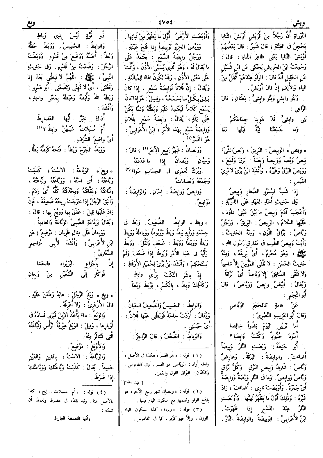 التوراة أَن رجُلاً من قُرَيشٍ أَوْبَشَ الثَّنايا يَحْجِلُ في الفتنة قال شمر قال بعضهم أَوْبَشَ الثنايا يعني ظاهرَ الثنايا قال وسمعت ابن الحريش يحكي عن ابن شميل عن الخليل أَنه قال الواوُ عندهم أَثْقلُ من الياء والأَلف إِذ قال أَوْيَش وبَنُو وابِشٍ وبنو وابِشِيّ بَطْنانِ قال الراعي بَني وابِشِيٍّ قد هَوِينا جِمَاعَكم وما جَمَعَتْنا نِيّةٌ قبلها مَعَا