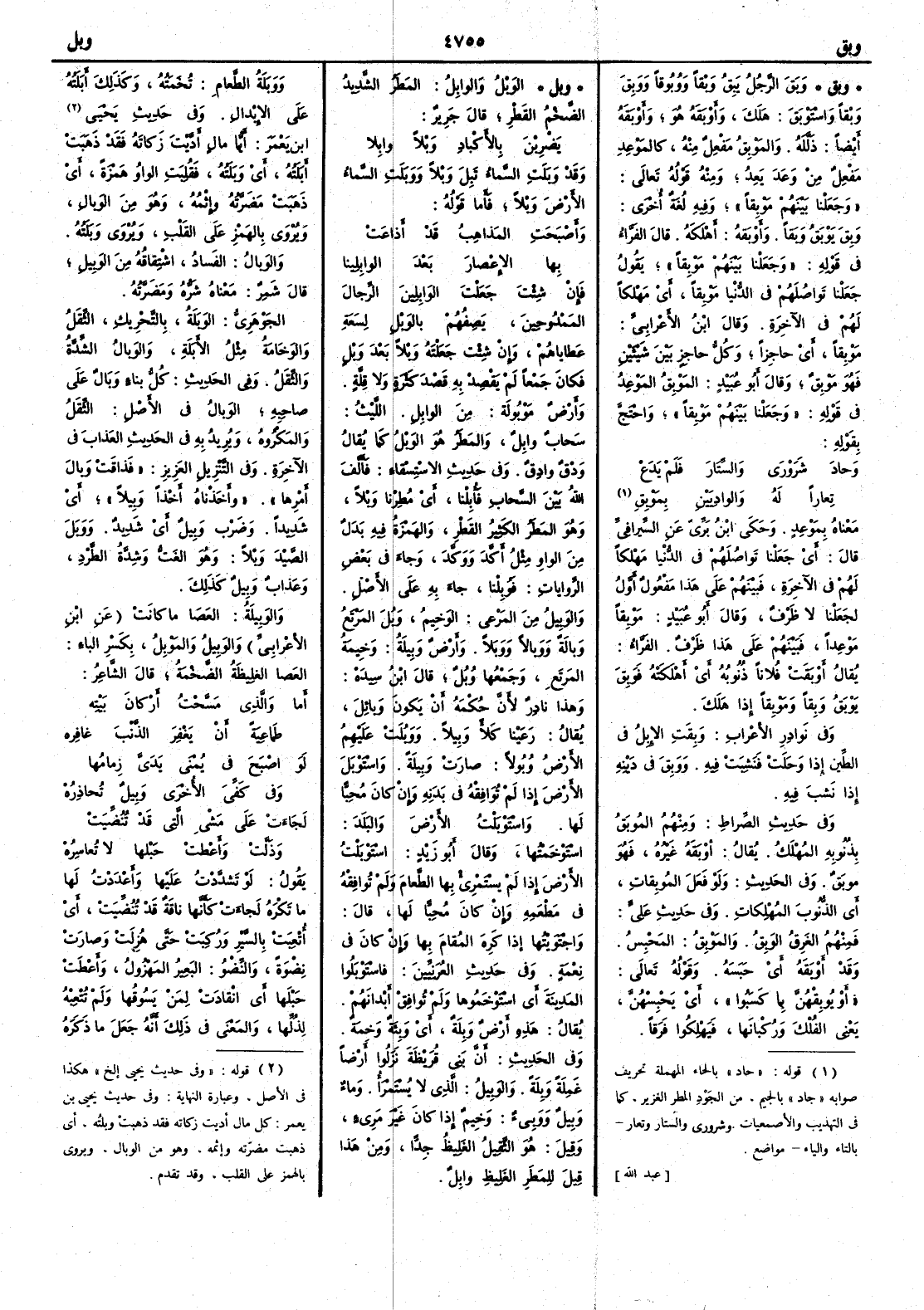 ( وبل ) الوَبْلُ والوابِلُ المطر الشديد الضَّخْم القطْرِ قال جرير يَضْرِبْنَ بالأَكْبادِ وَبْلاً وابِلا وقد وَبَلَتِ السماءُ تَبِل وَبْلاً ووَبَلتِ السماءُ الأَرضَ وَبْلاً فأَما قوله وأَصْبَحَتِ المَذاهِبُ قد أَذاعَتْ بها الإِعْصار بعدَ الوابِلِينا فإِن شئت جعلت الوَابِلِين الرجالَ المَمْدُوحينَ يصفهم بالوَبْل لسَعةِ عَطاياهم وإِن شئت جعلته وَبْلاً بعدَ وَبْل فكان جمعاً لم يقصد به قصد كَثْرةٍ ولا قِلَّة وأَرض مَوْبُولةٌ من الوابِل الليث سَحاب وابِل والمطر هو الوَبْلُ كما يقال وَدْقٌ وادِق وفي حديث الاستسقاء فأَلَّفَ اللهُ بين السحابِ فأُبِلْنا أَي مُطِرْنا وَبْلاً وهو المطر الكثير القطر والهمزة فيه بدَل من الواو مثل أَكَّد ووَكَّدَ وجاء في بعض الروايات فَوُبِلْنا جاء به على الأَصل والوَبِيلُ من المَرعَى الوخيم وَبُلَ المَرْتَع وَبالةً ووَبالاً ووَبَلاً وأَرض وَبِيلةٌ وَخيمةُ المَرتَع وجمعها وُبُلٌ قال ابن سيده وهذا نادر لأَن حكمه أَن يكون وَبائل يقال رعينا كلأً وَبِيلاً ووَبُلَت عليهم الأَرضُ وُبُولاً صارت وَبِيلةً واسْتَوْبَل الأَرضَ إِذا لم تُوَافِقْه في بدَنه وإِن كان مُحِبّاً لها واسْتَوْبَلْت الأَرضَ والبلدَ اسْتَوْخَمْتها وقال أَبو زيد اسْتَوْبَلْت الأَرض إِذا لم يسْتَمْرِئْ بها الطعامَ ولم تُوافِقْه في مَطْعَمه وإِن كان مُحِبًّا لها قال واجْتَوَيْتُها إِذا كره المُقامَ بها وإِن كان في نِعمة وفي حديث العُرَنِيِّين فاسْتَوْبَلوا المدينة أَي استوخَموها ولم توافق أَبدانَهم يقال هذه أَرض وَبِلَةٌ أَي وبِئة وخِمة وفي الحديث أَنَّ بني قُرَيظة نزلوا أَرضاً غَمِلةً وَبِلةً والوَبِيلُ الذي لا يُسْتَمْرَأُ وماءٌ وَبِيلٌ ووبيءٌ وَخِيم إِذا كان غير مَرِيءٍ وقيل هو الثقيلُ الغليظُ جدًّا ومن هذا قيل للمطر الغليظ وابِل ووَبَلةُ الطعامِ تُخَمَتُه وكذلك أَبَلَتُه على الإِبْدال وفي حديث يحيى