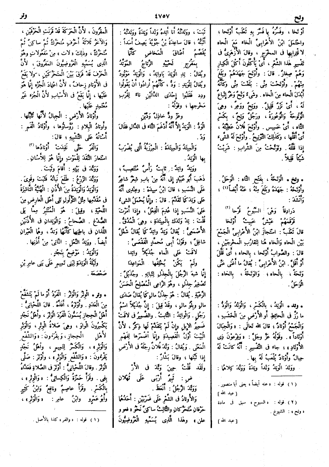 أَوْتَخا وفسره بما فسر به ثعلب أَوْتَحا واحتمل ابن الأَعرابي الخاء مع الحاء لاقترابهما في المخرج وقال الأَزهري في تفسير هذا الشعر أَي يأْكلون أَكل الكبار وهم صغار قال وأَوْتَحَ جَهَدَهُمْ وبَلَغَ منهم وأَوتَحْتَ مني بَلَغْتَ مني وكأَنه أَبدل الحاء من الخاء وشيء وَتْحٌ وَعْرٌ إِتباعٌ له أَي نَزْرٌ قليل ووَتِحٌ ووَعِرٌ وهي الوُتُوحةُ والوُعُورةُ ورجل وَتِحٌ بكسر التاء أَي خسيس وأَوْتَحَ فلانٌ عطيَّته أَي أَقَلَّها وكذلك التَّوْتِيحُ وأَوْتَحَ له الشيءَ إِذا قلله وتَوَتَّحْتُ من الشراب شربت شيئاً قليلاً ( وتخ ) الوَتَخَة بفتح التاء الوحل وأَوتخه جَهَدَهُ وبلغ منه عنه أَيضاً وأَنشد دَرادقاً وهْي السَّبوحُ قُرَّحا قَرْقَمَهُمْ عَيْشٌ خَبيثٌ أَوْتَخا قال ثعلب استجاز ابن الأَعرابي الجمع بين الحاءِ والخاءِ هنا لتقارب المخرجين قال والصواب أَوتحا بالحاءِ أَي قلل أَو أَقلّ ابن الأَعرابي يقال ما أَغنى عني وَتَحَة بالحاءِ والوَتَخَة بالخاءِ الوحل ( وتد ) الوتِدُ بالكسر والوَتْدُ والوَدُّ ما رُزَّ في الحائِط أَو الأَرض من الخشب والجمع أَوتادٌ قال الله تعالى والجِبالَ أَوتاداً وقوله عز وجل وفرعون ذي الأَوتاد جاء في التفسير أَنه كانت له حبالٌ وأَوتاد يُلْعب له بها ووَتَدَ الوَتِدُ وَتْداً وتِدَةً وَوَتَّدَ كلاهما ثَبَتَ ووَتَدْتُه أَنا أَتِدُه وَتْداً وتِدَةً وَوَتَدْتُه أَثْبَتُّه قال ساعدة بن جؤية يصف أَسداً يُقَصِّمُ أَعْناقَ المَخاضِ كأَنَّما بِمَفْرَجِ لَحْيَيْهِ الرِّتاجُ المُوَتَّدُ ويقال تِدِ الوَتِدَ يا واتِدُ والوَتِدُ مَوْتُود ويقال للوتِد وَدٌّ كأَنهم أَرادوا أَن يقولوا ودِدٌ فقلبوا إِحدى الدالين تاء لقرب مخرجِهما وقوله وعَز ودٌّ خاذل وَدَّيْنِ الوَدُّ الوتِدُ إِلا أَنه أَدغم التاء في الدال فقال وَدّ والمِيتَدُ والمِيتَدةُ المِرْزَبَّةُ التي يُضْرَبُ بها الوتِدُ ووَتِدٌ واتِدٌ ثابت رأْس منتصب ذهب أَبو عبيد إِلى أَنه من باب شِعْرٌ شاعِرٌ على النسب قال ابن سيده وعندي أَنه على وَتِدَ كما تقدم قال وإِنما يحمل الشيء على النسب إِذا عُدِمَ الفعل وإِذا أَمرت قلت تِدْ وَتَدَك بالميتَدةِ وهي المُدُقُّ الأَصمعي يقال وَتِدٌ واتِد كما يقال شُغْلٌ شاغِلٌ وقول أَبي محمد الفقعسي لاقَتْ على الماءِ جُذَيلاً واتِدا ولم يَكُنْ يُحُلِفُها المَواعِدَا إِنما شبه الرجل بالجِذْل لثباته وجُذَيْل تصغير جِذْل وهو الراعي المُصْلِحُ الحَسَنُ الرِّعْية يقال هو جذْلُ مالٍ كما يقال صَدَى مالٍ وبِلْو مالٍ وقد قيل إِن جُذَيلاً اسم رجل والواتِد الثابتُ والضمير في لاقت ضمير الإِبل وإِن لم يتقدم لها ذكر لأَن البيت أَول القصيدة وإِنما أَضمرها لفهم المعنى ويقال وَتَّدَ فلان رِجلَه في الأَرض إِذا ثَبَّتَها وقال بشار ولَقَد قُلْتُ حِينَ وَتَّدَ في الأَرْ ضِ ثَبِيرٌ أَرْبي على ثَهلانِ وَوَتَّدَ الرجلُ أَنعَظَ والأَوتادُ في الشعر على ضربين أَحدهما حرفان متحركان والثالث ساكن نحو « فعو و علن » وهذا الذي يسميه العروضِيون المقرون لأَن الحركة قد قرنت الحرفين والآخر ثلاثة أَحرف متحرك ثم ساكن ثم متحرك وذلك « لات » من مفعولات وهو الذي يسميه العروضيون المفروق لأَن الحرف قد فرق بين المتحركين ولا يقع في الأَوتاد زحاف لأَنَّ اعتماد الجزء إِنما هو عليها إِنما يقع في الأَسْباب لأَن الجزء غير معتمد عليها وأَوتادُ الأَرض الجبال لأَنها تثبتها وأَوتاد البلاد رُؤساؤها وأَوتادُ الفَمِ أَسنانه على التشبيه قال والفَرّ حتى نَقِدَتْ أَوتادُها