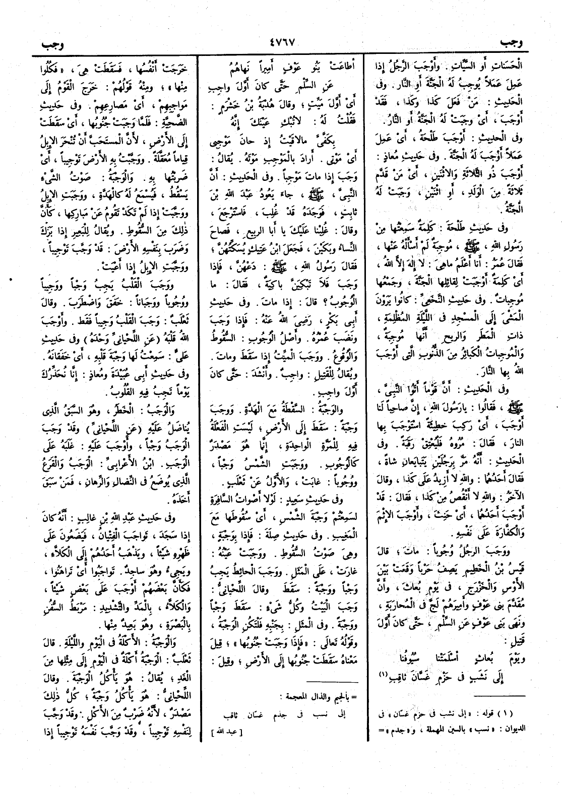 الحَسناتِ أَو السيئات وأَوْجَبَ الرجلُ إِذا عَمِلَ عَمَلاً يُوجِبُ له الجَنَّةَ أَو النارَ وفي الحديث مَنْ فعل كذا وكذا فقد أَوْجَبَ أَي وَجَبَتْ له الجنةُ أَو النارُ وفي الحديث أَوْجَبَ طَلْحَةُ أَي عَمِل عَمَلاً أَوْجَبَ له الجنةَ وفي حديث مُعاذٍ أَوْجَبَ ذو الثلاثة والاثنين أَي من قَدَّم ثلاثةً من الولد أَو اثنين وَجَبَت له الجنةُ وفي حديث طَلحة كلمة سَمِعتُها من رسول اللّه صلى اللّه عليه وسلم مُوجِبةٌ لم أَسأَله عنها فقال عمر أَنا أَعلم ما هي لا إِله إِلا اللّه أَي كلمة أَوْجَبَتْ لقائلها الجنة وجمعُها مُوجِباتٌ وفي حديث النَّخَعِيِّ كانوا يَرَوْنَ المشيَ إِلى المسجدِ في الليلة المظلمة ذاتِ المَطَر والريح أَنها مُوجِبةٌ والمُوجِباتُ الكبائِرُ من الذُّنُوب التي أَوْجَبَ اللّهُ بها النارَ وفي الحديث أَن قوماً أَتَوا النبي صلى اللّه عليه وسلم فقالوا يا رسول اللّه إِن صاحِباً لنا أَوْجَبَ أَي رَكِبَ خطيئةً اسْتَوْجَبَ بها النارَ فقال مُرُوه فلْيُعْتِقْ رَقَبَةً وفي الحديث أَنه مَرَّ برجلين يَتَبايعانِ شاةً فقال أَحدُهما واللّه لا أَزِيدُ على كذا وقال الآخر واللّه لا أَنقُصُ من كذا فقال [ ص 794 ] قد أَوْجَبَ أَحدُهما أَي حَنِثَ وأَوْجَبَ الإِثم والكَفَّارةَ على نفسه ووَجَبَ الرجلُ وُجُوباً ماتَ قال قَيْسُ بن الخَطِيم يصف حَرْباً وَقَعَتْ بين الأَوْسِ والخَزْرَج في يوم بُعاثَ وأَن مُقَدَّم بني