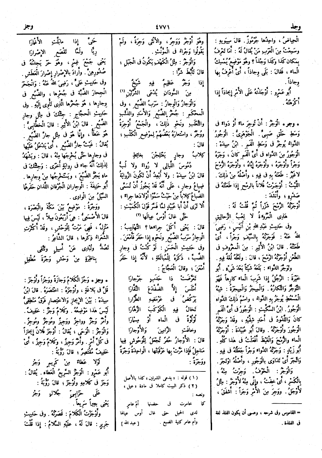 والوَجارُ والوِجارُ سَرَبُ الضَّبُعِ وفي المحكم جُحْرُ الضبع والأَسد والذئب والثعلب ونحو ذلك والجمع أَوْجِرَةٌ ووُجُرٌ واستعاره بعضهم لموضع الكلب قال كِلابُ وِجارٍ يَعْتَلِجْنَ بغائِطٍ دُمُوسَ اللَّيالي لا رُواءٌ ولا لُبُّ قال ابن سيده ولا أبعد أن تكون الرواية ضِباعُ وِجارٍ على أَنه قد يجوز أَن تسمى الضباع كلاباً من حيث سَمَّوْا أَولادها جِراءً أَلا ترى أَن أَبا عبيد لما فسر قول الكميت حتى غال أَوسٌ عِيالَها قال يعني أَكل جِراءَها ؟ التهذيب الوِجارُ سَرَبُ الضبع ونحوه إِذا حفر فأَمْعَنَ وفي حديث الحسن لو كنت في وِجار الضَّبِّ ذكره للمبالغة لأَنه إِذا حفر أَمعن وقال العجاج تَعَرَّضَتْ ذا حَدَبٍ جَرْجارَا أَمْلَسَ إِلا الضِّفْدَعَ النَّقَّارَا يَرْكُضُ في عَرْمَضِه الطَّرَّارا تَخالُ فيه الكواكبَ الزَّهَّارَا لُؤْلُؤَةً في الماءِ أَو مِسْمارَا وخافَت الرامِينَ والأَوْجارَا قال الأَوجار حفر يجعل للوحوش فيها مناجل فإِذا مرت بها عرقبتها الواحدة وَجْرَةٌ ووَجَرَةٌ حتى إِذا ما بَلَّتِ الأَغْمارَا رِيًّا ولَمَّا تَقْصَعِ الإِصْرارَا يعني جمع غِمْرٍ وهو حَرٌّ يَجِدْنَهُ في صدورهن وأَراد بالأِصرارِ إِصْرارَ العطش وفي حديث عليّ رضي الله عنه وانْجَحر انْجِحارَ الضَّبَّةِ في جُحْرِها والضَّبُعِ في وِجارِها هو جُحْرُها الذي تأْوي إِليه وفي حديث الحجاج جِئْتُكَ في مِثْلِ وِجارِ الضَّبُعِ قال ابن الأَثير قال الخطابي هو خطأٌ وإِنما هو في مثل جارِ الضبع يقال غَيْثٌ جارُ الضبع أَي يدخل عليها في وِجارِها حتى يخرجها منه قال ويشهد لذلك أَنه جاء في رواية أُخرى وجئتك في ماءٍ يَجُرُّ الضَّبُعَ ويستخرجُها من وِجارِها أَبو حنيفة الوِجارانِ الجُرْفانِ اللذان حفرهما السيل من الوادي ووَجْرَةُ موضع بين مكة والبصرة قال الأَصمعي هي أَربعون ميلاً ليس فيها منزل فهي مَرْتٌ للوَحْشِ وقد أَكثرت الشعراء ذكرها قال الشاعر تَصُدُّ وتُبْدي عن أَسِيلٍ وتَتَّقي بناظِرَةٍ من وَحْشِ وَجْرَةَ مُطْفِلِ ( وجز ) وَجُزَ الكلامُ وَجازَةً ووَجْزاً وأَوْجَزَ قَلَّ في بلاغة وأَوْجَزَه اختصره قال ابن سيده بين الإِيجاز والاختصار فرق مَنْطِقِيٌّ ليس هذا موضعه وكلامٌ وَجْزٌ خفيف وأَمر وَجْزٌ وواجِزٌ ووَجِيزٌ ومُوجَزٌ ومُوجِزٌ والوَجْزُ الوَحَى يقال أَوْجَزَ فلانٌ إِيجازاً في كل أَمر وأَمرٌ وَجِيزٌ وكلام وَجِيز أَي خفيف مقتصر قال رؤبة لولا عَطاءٌ من كَريمٍ وَجْز أَبو عمرو الوَجْزُ السريع العطاء يقال وَجَزَ في كلامه وأَوْجَزَ قال رؤبة على جَزَابِيٍّ جُلالٍ وَجْز يعني بعيراً سريعاً وأَوْجَزْتُ الكلام قَصَرْتُه وفي حديث جَرِيرٍ قال له عليه السلام إِذا قُلْتَ