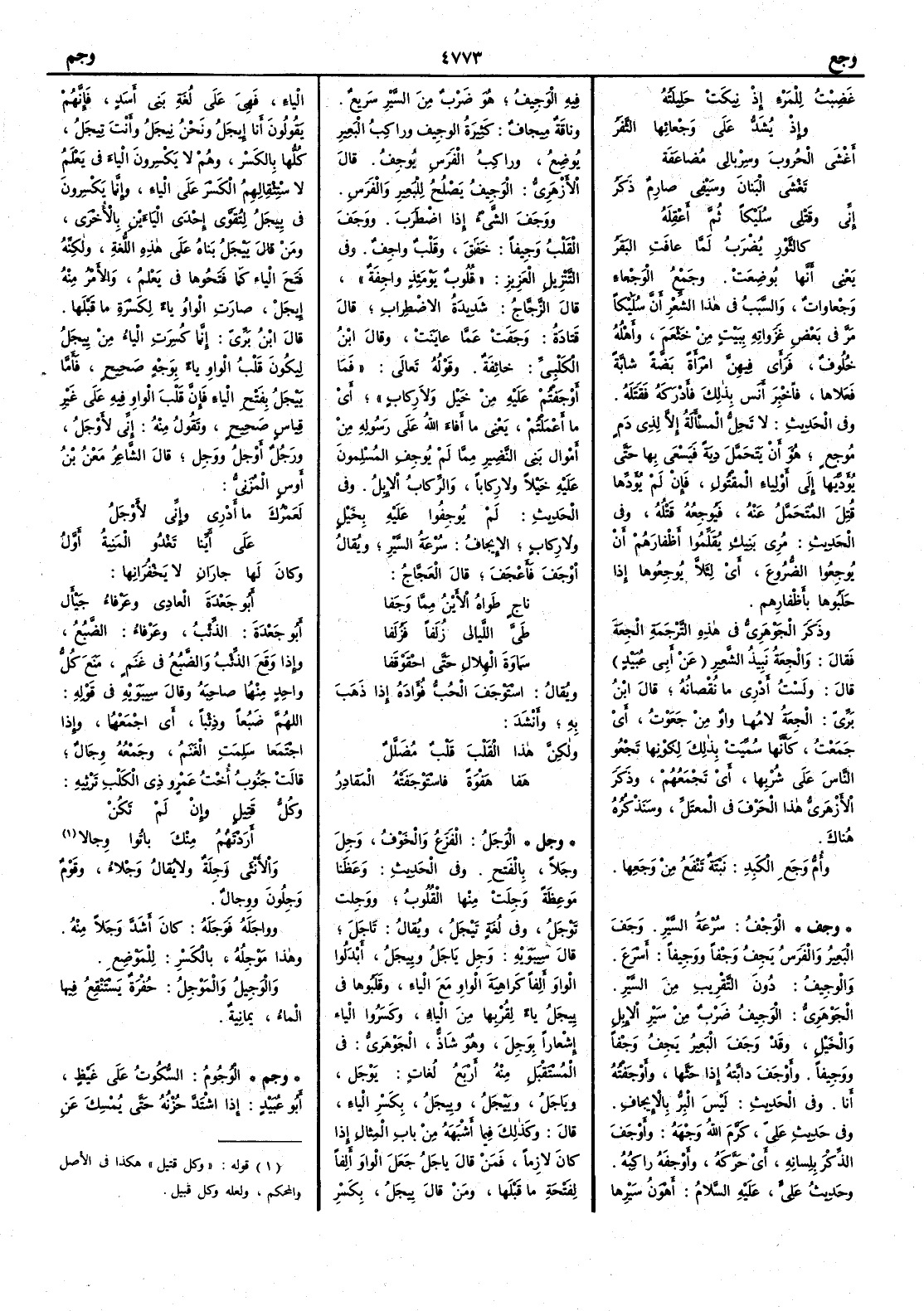 غَضِبتُ للمَرْءِ إِذْ نِيكَتْ حَلِيلَتُه وإِذْ يُشَدُّ على وَجْعائِها الثَّفَرُ أَغْشَى الحُزوبَ وسِرْبالي مُضاعَفةٌ تَغْشَى البَنانَ وسَيْفي صارِمٌ ذَكَرُ إِني وقَتْلي سُلَيْكاً ثم أَعْقِلَه كالثَّوْرِ يُضْرَبُ لَمَّا عافَتِ البَقَرُ يعني أَنها بُوضِعَتْ وجمعُ الوَجْعاءِ وَجْعاواتٌ والسبب في هذا الشعْرِ أَنَّ سُلَيْكاً مَرَّ في بعض غَزَواتِه ببيت من خَثْعَمَ وأَهله خُلوفٌ فَرأَى فيهنَّ امرأَة بَضَّةً شابةً فَعلاها فأُخْبر أَنس بذلك فأَدْركه فقتله وفي الحديث لا تَحِلُّ المسأَلةُ إِلا لذي دَمٍ مُوجِعٍ هو أَنْ يتحمل دِيةً فيسعى بها حتى يُؤَدِّيَها إِلى أَولياءِ المقتول فإِن لم يؤدِّها قُتِل المُتَحَمَّلُ عنه فَيُوجِعُه قَتْلُه وفي الحديث مُري بَنِيكِ يقلموا أَظْفارَهم أَن يُوجِعُوا الضُّرُوعَ أَي لئلا يُوجِعُوها إِذا حَلَبُوها بأَظْفارِهم وذكر الجوهري في هذه الترجمة الجِعةَ فقال والجِعةُ نَبِيذُ الشعير عن أَبي عبيد قال ولست أَدري ما نُقْصانُه قال ابن بري الجِعةُ لامها واو من جَعَوْت أَي جَمَعْتُ كأَنها سميت بذلك لكونها تَجْعُو الناسَ على شُرْبِها أَي تجمعهم وذكر الأَزهري هذا الحرف في المعتل وسنذكره هناك وأُمُّ وجَعِ الكَبدِ نبتة تنفع من وجَعِها ( وجف ) الوَجْفُ سُرْعة السير وجَفَ البعيرُ والفرس يَجِف وجْفاً ووجِيفاً أَسْرعَ والوجِيف دون التقريب من السير الجوهري الوجِيفُ ضرب من سير الإبل والخيل وقد وجف البعير يجف وجفاً ووجيفاً وأَوجف دابته إذا حثَّها وأَوجفْته أَنا وفي الحديث ليس البِرُّ بالإيجاف وفي حديث عليّ كرم اللّه وجهه وأَوجَفَ الذِّكْرَ بلسانه أَي حرَّكه وأَوجفَه راكبُه وحديث علي عليه السلام أَهونُ سيرِها فيه الوَجِيف هو ضرب من السير سريع و ناقة مِيجاف كثيرة الوجيف وراكب البعير يُوضِع وراكب الفرس يُوجِف قال الأَزهري الوجيف يصلح للبعير والفرس ووَجَف الشيءُ إذا اضطرب ووجَف القلب وجِيفاً خَفَق وقلب واجِف وفي التنزيل العزيز قلوبٌ يومئذ واجفة قال الزجاج شديدة الاضطراب قال قتادة وجفَت عما عاينت وقال ابن الكلبي خائفة وقوله تعالى فما أَوجفتم عليه من خيل ولا رِكاب أَي ما أَعملتم يعني ما أَفاء اللّه على رسوله من أَموال بني النضير مما لم يُوجف المسلمون عليه خيلاً ولا رِكاباً والرِّكاب الإبل وفي الحديث لم يُوجِفوا عليه بخيل ولا ركاب الإيجاف سُرعة السير ويقال أَوجف فأَعجَف قال العجاج ناجٍ طَواه الأَيْنُ مما وَجَفا طَيَّ اللَّيالي زُلَفاً فَزُلَفا سَماوَةَ الهِلالِ حتى احْقَوْقَفا ويقال استوْجَف الحُبُّ فُؤاده إذا ذهب به وأَنشد ولكنّ هذا القلبَ قلبٌ مُضَلَّلٌ هَفا هَفْوةً فاسْتَوْجَفَته المَقادِرُ