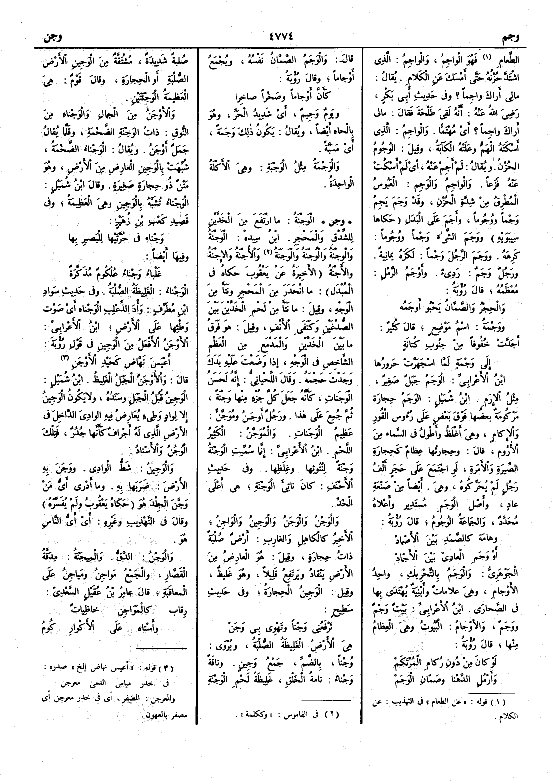 ( * قوله « الوجم حجارة » هو بالفتح والتحريك ) مركومةٌ بعضُها فوق بعض على رؤوس القُورِ والأِكام وهي أَغلظُ وأَطولُ في السماء من الأُرومِ قال وحجارتُها عظامٌ كحجارة الصِّيرة والأَمَرَة لو اجتمع على حجرٍ أَلفُ رجل لم يُحَرِّكوه وهي أَيضاً من صَنْعة عاد وأَصلُ الوَجَمِ مُستدِيرٌ وأَعلاهُ مُحدَّد والجماعة الوُجوم قال رؤبة وهامة كالصَّمْدِ بين الأَصْمادْ أَو وَجَمِ العادِيّ بين الأَجْمادْ الجوهري والوجَمُ بالتحريك واحد الأَوْجامِ وهي علاماتٌ وأَبْنِيةٌ يُهْتَدى بها في الصَّحارَى ابن الأَعرابي بيتٌ وَجْمٌ ووَجَمٌ والأَوْجامُ البيوتُ وهي العِظامُ منها قال رؤبة لو كان مِنْ دُونِ رُكامِ المُرْتَكَمْ وأَرْمُلِ الدَّهْنا وصَمّانِ الوَجَمْ قال والوَجَمُ الصَّمّانُ نفْسُه ويُجمع أَوْجاماً وقال رؤبة كأَنَّ أَوْجاماً وصَخْراً صاخِرا ويومٌ وَجِيمٌ أَي شديدُ الحرِّ وهو بالحاء أَيضاً ويقال يكون ذلك وَجَمة أَي مَسَبَّةً والوَجْمةُ مثل الوَجْبة وهي الأَكْلة الواحدة ( وجن ) الوَجْنَةُ ما ارتفع من الخَدَّيْنِ للشِّدْق والمَحْجِرِ ابن سيده الوَجْنةُ والوِجْنَةُ والوُجْنةُ والوَجَنةُ والأُجْنة والأَجْنةُ الأَخيرة عن يعقوب حكاه في المبدل ما انحدر من المَحْجِرِ ونتأَ من الوجه وقيل ما نتأَ من لحم الخدين بين الصُّدْغين وكَنَفَي الأَنف وقيل هو فَرَقُ ما بين الخَدَّيْنِ والمَدْمَعِ من العظم الشاخص في الوجه إِذا وَضَعْتَ عليه يَدَك وجدت حَجْمَه وحكى اللحياني إِنه لَحَسَن الوَجَناتِ كأَنه جعل كل جزء منها وَجْنةً ثم جمع على هذا ورجل أَوْجَنُ ومُوَجَّنٌ عظيم الوَجَنات والمُوَجَّنُ الكثير اللحم ابن الأَعرابي إِنما سميت الوَجْنَةُ وَجْنَةً لنُتُوئها وغلظها وفي حديث الأَحْنَفِ كان ناتئَ الوَجْنةِ هي أَعلى الخدّ والوَجْنُ والوَجَنُ والوَجين والوَاجِنُ الأَخير كالكاهِل والغارِبِ أَرض صُلْبةٌ ذات حجارة وقيل هو العارض من الأَرض ينقاد ويرتفع قليلاً وهو غليظ وقيل الوَجِين الحجارة وفي حديث سَطِيحٍ تَرْفَعُني وَجْناً وتَهْوِي بي وَجَنْ هي الأَرض الغليظة الصُّلْبة ويروى وُجْناً بالضم جمع وَجِينٍ وناقة وَجْناءُ تامة الخَلْق غليظة لحم الوَجْنةِ صُلْبة شديدة مشتقة من الوَجِين الي هي الأَرض الصلبة أَو الحجارة وقال قوم هي العظيمة الوَجْنَتَين والأَوْجَنُ من الجمال والوَجْناء من النُّوق ذات الوَجْنةِ الضخمة وقلما يقال جَمَلٌ أَوْجَنُ ويقال الوَجْناء الضخمة شبهت بالوَجِين العارض من الأَرض وهو مَتْنٌ ذو حجارة صغيرة وقال ابن شميل الوَجْناءُ تشبه بالوجين وهي العظيمةُ وفي قصيد كَعْب بن زُهَيْر وَجْناء في حُرَّتَيْها للبَصِير بها وفيها أَيضاً غَلْباء وَجْناء عُلكوم مُذَكَّرَة الوَجْناءُ الغليظة الصُّلْبة وفي حديث سَواد بن مُطَرِّف وَأْدَ الذِّعْلِب الوَجْناءِ أَي صوت وطئها على الأَرض ابن الأَعرابي الأَوْجَنُ الأَفْعَلُ من الوَجِين في قول رؤبة أَعْيَسَ نَهَّاضٍَ كحَيْدِ الأَوْجَنِ