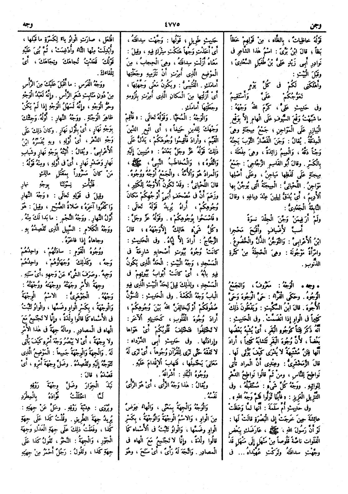 قوله خاظيات بالظاء من قولهم خَظاً بَظاً قال ابن بري اسم هذا الشاعر في نوادر أَبي زيد عليُّ بن طُفيل السعدي وقبل البيت وأَهْلَكَني لكُمْ في كل يومٍ تَعَوُّجُكُمْ عَلَيَّ وأَسْتَقِيمُ وفي حديث عليّ كرم الله وجهه ما شَبَّهْتُ وَقْعَ السيوف على الهامِ إِلا بوَقْعِ البَيازِرِ على المَوَاجِنِ جمع مِيجَنةٍ وهي المِدَقَّةُ يقال وَجَنَ القصّارُ الثوب يَجِنُه وَجْناً دَقَّه والميم زائدة وهي مِفْعَلةٌ بالكسر وقال أَبو القاسم الزجاجي جمع مِيجَنةٍ على لفظها مَياجن وعلى أَصلها مَوَاجن اللحياني المِيجَنةُ التي يُوجَّنُ بها الأَديمُ أَي يُدَقُّ ليلين عند دباغه وقال النابغة الجعدي ولم أَرَ فيمَنْ وَجَّنَ الجِلدَ نِسْوةً أَسَبَّ لأَضْيافٍ وأَقْبَحَ مَحْجِرا ابن الأَعرابي والتَّوَجُّنُ الذل والخضوع وامرأَة مَوْجُونةٌ وهي الخَجِلَةُ من كثرة الذنوب ( وجه ) الوَجْهُ معروف والجمع الوُجُوه وحكى الفراء حَيِّ الأُجُوهَ وحَيِّ الوُجُوه قال ابن السكيت ويفعلون ذلك كثيراً في الواو إذا انضمت وفي الحديث أَنه ذكر فِتَناً كوُجُوهِ البَقَرِ أَي يُشْبِه بَعْضُها بعضاً لأَن وُجُوهَ البقر تتشابه كثيراً أَراد أَنها فِتَنٌ مُشْتَبِهَةٌ لا يُدْرَى كيف يُؤْتَى لها قال الزمخشري وعندي أَن المراد تأْتي نواطِحَ للناس ومن ثم قالوا نَواطِحُ الدَّهْرِ لنوائبه ووَجْهُ كُلِّ شيء مُسْتَقْبَلُه وفي التنزيل العزيز فأَيْنَما تُوَلُّوا فثَمَّ وَجْهُ اللهِ وفي حديث أُمّ سلمة أَنها لما وَعَظَتْ عائشة حين خرجت إلى البصرة قالت لها لو أَن رسول الله صلى الله عليه وسلم عَارَضَكِ ببعض الفَلَواتِ ناصَّةً قَلُوصاً من مَنْهَلٍ إلى مَنْهَلٍ قد وَجِّهْتِ سدافَتَه وتَرَكْتِ عُهَّيْداهُ في حديث طويل قولها وَجَّهْتِ سِدافَتَه أَي أَخذتِ وَجْهاً هَتَكْتِ سِتْرَك فيه وقيل معناه أَزَلْتِ سِدافَتَهُ وهي الحجابُ من الموضع الذي أُمِرْتِ أَن تَلْزَمِيه وجَعَلْتِها أَمامَكِ القتيبي ويكون معنى وَجَّهْتِهَا أَي أَزَلْتِهَا من المكان الذي أُمِرْتِ بلزومه وجَعَلْتِهَا أَمامَكِ والوَجْهُ المُحَيَّا وقوله تعالى فأَقِمْ وَجْهَكَ للدِّين حَنِيفاً أَي اتَّبِع الدِّينَ القَيِّمَ وأَراد فأَقيموا وجوهكم يدل على ذلك قوله عز وجل بعده مُنِيبِينَ إليه واتَّقُوهُ والمخاطَبُ النبيُّ صلى الله عليه وسلم والمراد هو والأُمَّةُ والجمع أَوْجُهٌ ووُجُوهٌ قال اللحياني وقد تكون الأَوْجُهُ للكثير وزعم أَن في مصحف أُبَيٍّ أَوْجُهِكُمْ مكان وُجُوهِكُمْ أُراه يريد قوله تعالى فامسحوا بوُجُوهِكُمْ وقوله عز وجل كلُّ شيءٍ هالكٌ إلا وَجْهَهُ قال الزجاج أَراد إلا إيَّاهُ وفي الحديث كانَتْ وُجُوهُ بُيُوت أَصحابِهِ شارعةً في المسجد وَجْهُ البيتِ الخَدُّ الذي يكون فيه بابه أَي كانت أَبواب بيوتهم في المسجد ولذلك قيل لَخَدِّ البيت الذي فيه الباب وَجْهُ الكَعْبةِ وفي الحديث لتُسَوُّنَّ صُفُوفَكُمْ أَو لَيُخالِفَنَّ الله بين وُجُوهكم أَراد وُجوهَ القلوب كحديثه الآخر لا تَخْتَلِفُوا فتَخْتَلِفَ قُلُوبكم أَي هَوَاها وإرادَتُها وفي حديث أَبي الدَّرْداءِ لا تَفْقَهُ حتى تَرَى للقرآن وُجُوهاً أَي تَرَى له مَعَانيَ يحتملها فتَهابَ الإقْدامَ عليه ووُجُوهُ البلد أَشرافُه ويقال هذا وَجْهُ الرأْيِ أَي هو الرأْيُ نَفْسُه والوَجْه والجِهَةُ بمعنىً والهاء عوض من الواو والاسم الوِجْهَةُ والوُجْهَةُ بكسر الواو وضمها والواو تثبت في الأَسماء كما قالوا وِلْدَةٌ وإنما لا تجتمع مع الهاء في المصادر واتَّجَهَ له رأْيٌ أَي سَنَحَ وهو افْتَعَلَ صارت الواو ياء لكسرة ما قبلها وأُبدلت منها التاء وأُدغمت ثم بُنِيَ عليه قولك قعدت تُجاهَكَ وتِجَاهَكَ أَي تِلْقاءَك ووَجْهُ الفَرَسِ ما أَقبل عليك من الرأْس من دون مَنَابت شعر الرأْس وإنه لعَبْدُ الوَجْهِ وحُرُّ الوَجْهِ وإنه لسَهْلُ الوَجْهِ إذا لم يكن ظاهر الوَجْنَةِ ووَجْهُ النهار أَوَّلُهُ