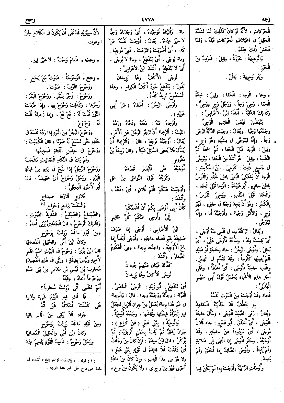 ( وجا ) الوَجا الحَفا وقيل شِدَّة الحفا وَجِيَ وَجاً ورجل وَجٍ ووَجِيٌّ وكذلك الدابة أَنشد ابن الأَعرابي يَنْهَضْنَ نَهْضَ الغائِبِ الوَجِيِّ وجَمْعُها وَجْيَا ويقال وجِيَتِ الدابةُ تَوْجَى وَجاً وإِنه ليَتَوَجَّى في مشْيته وهو وَجٍ وقيل الوَجَا قبل الحَفا ثم النَّقَبُ وقيل هو أَشدّ من الحَفا وتَوَجَّى في جميع ذلك كَوَجِيَ ابن السكيت الوَجا أَن يَشْتَكِيَ البعيرُ باطِنَ خُفه والفرسُ باطن حافِره أَبو عبيدة الوَجا قَبلَ الحفا والحفا قبل النَّقَبِ ووَجِيَ الفرس بالكسر وهو أَن يَجِد وجَعاً في حافره فهو وَجٍ والأُنثى وَجْياء وأَوْجَيْته أَنا وإِنه ليَتَوَجَّى ويقال تَرَكْتُه وما في قَلْبي منه أَوْجَى أَي يَئِست منه وسأَلته فأَوْجَى عليّ أَي بَخِل وأَوْجَى الرجلُ جاء لحاجةٍ أَو صَيْد فلم يُصِبها كأَوْجاً وقد تقدَّم في الهمز وطَلَبَ حاجة فأَوْجَى أَي أَخطأَ وعلى أَحد هذه الأَشياء يحمل قول أَبي سَهْم الهُذَلي فَجاء وقَدْ أَوْجَتْ مِنَ المَوْتِ نَفْسُه به خُطَّفٌ قد حذَّرَتْه المَقاعِدُ ويقال رَمَى الصيدَ فأَوْجَى وسأَلَ حاجةً فأَوْجى أَي أَخْفَقَ أَبو عمرو جاء فلان مُوجًى أَي مردوداً عن حاجته وقد أَوْجَيْتُه وحَفَرَ فأَوْجَى إِذا انْتَهى إِلى صلابةٍ ولم يُنْبِطْ وأَوْجَى الصائدُ إِذا أَخْفَقَ ولم يَصد وأَوْجَأَتِ الرَّكِيَّةُ وأَوْجَتْ إِذا لم يكن فيها ماء وأَتيْناه فَوَجَيْناه أَي وَجَدْناه وَجِيًّا لا خَيْرَ عنده يقال أَوْجَتْ نَفْسُه عن كذا أَي أَضْرَبَتْ وانتَزَعَت فهي مُوجِيةٌ وماء يُوجَى أَي ينقطع وماء لا يُوجَى أَي لا يَنْقَطِعُ أَنشد ابن الأَعرابي تُوجَى الأَكُفُّ وهُما يَزِيدانْ يقول ينقطع جُودُ أَكُفِّ الكِرام وهذا الممدوح تَزِيدُ كَفَّاه وأَوجى الرجلَ أَعطاه عن أَبي عبيد وأَوْجاهُ عنه دَفَعَه ونَحّاه ورَدَّه الليث الإِيجاء أَن تَزْجُرَ الرجل عن الأَمر يقال أَوْجَيْتُه فرَجَع قال والإِيجاء أَن يُسْأَلَ فلا يُعْطي السائل شيئاً وقال ربيعة بن مقروم أَوْجَيْتُه عَنِّي فأَبْصَرَ قَصْدَهُ وكَوَيْتُه فوْقَ النَّواظِرِ مِنْ عَلِ وأَوْجَيْتُ عنكم ظُلْمَ فلان أَي دفَعْته وأَنشد كأَنَّ أَبي أَوْصَى بِكُمْ أَنْ أَضُمَّكمْ إِليَّ وأُوجي عَنْكُمُ كلَّ ظالم ابن الأَعرابي أَوْجى إِذا صَرَفَ صَدِيقَه بغير قَضاء حاجته وأَوجى أَيضاً إِذا باعَ الأَوْجِيةَ واحدها وِجاء وهي العُكُومُ الصِّغار وأَنشد كَفَّاكَ غَيْثانِ عَليْهِمْ جُودانْ تُوجَى الأَكفُّ وهما يزيدانْ أَي تنقطع أَبو زيد الوَجْيُ الخَصْيُ الفراء وجَأْتُه ووَجَيْتُه وِجاء قال والوِجاءُ في غير هذا وِعاء يُعمل من جِران الإِبل تَجعل فيه المرأَةُ غسْلَتها وقُماشَها وجمعه أَوْجِيَةٌ والوَجِيَّةُ بغير همز عن كراع جَرادٌ يُدَقُّ ثم يُلَتُّ بسمن أَو زيت ثم يؤْكل قال ابن سيده فإِن كان من وجَأْت أَي دققت فلا فائدة في قوله بغير همز ولا هو من هذا الباب وإِن كان من مادة أُخرى فهو من و ج ي ولا يكون من و ج و لأَن سيبويه قد نفى أَن يكون في الكلام مثل وعوت ( وحت ) طعام وَحْتٌ لا خير فيه( وحح ) الوَحْوَحَة صوت مع بَحَحٍ ووَحْوَحَ الثوبُ صَوَّت ووَحْ وَحْ زجر للبقر ووَحْوَحَ البقرَ زَجَرها وكذلك وَحْوَحَ بها وإِذا طردت الثورَ قلت له قَعْ قَعْ وإِذا زجرته قلت له وَحْ وَحْ ووَحْوَحَ الرجلُ من البرد إِذا ردَّد نَفَسه في حَلْقه حتى تسمع له صوتاً قال الكُمَيْتُ ووَحْوَحَ في حِضْنِ الفَتاةِ ضَجِيعُها ولم يَكُ في النُّكْدِ المَقاليتِ مَشْخَبُ ووَحْوَحَ الرجلُ إِذا نفخ في يده من شدَّة البرد ورجل وَحْواحٌ أَي خفيف قال أَبو الأَسود العِجْلي مُلازٍمِ آثارَها صَيداحِ واتَّسَقَتْ لزاجِرٍ وَحْواحِ