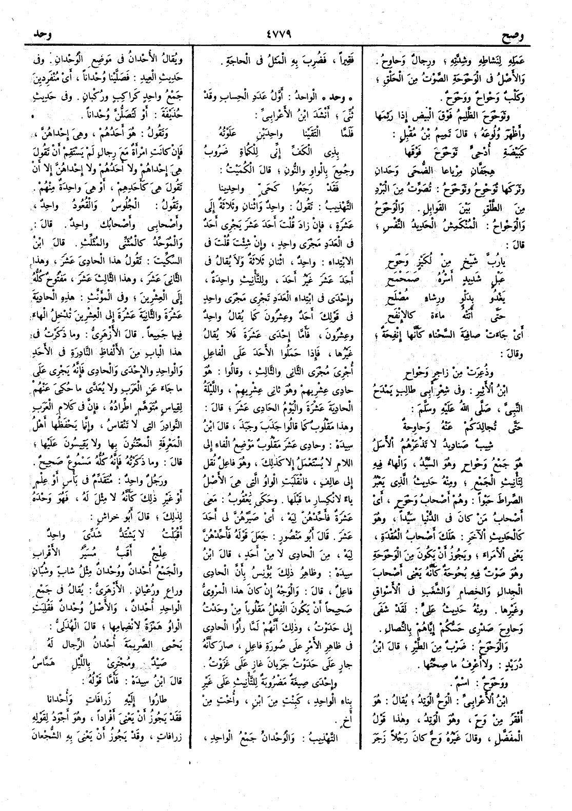 ( وحد ) الواحدُ أَول عدد الحساب وقد ثُنِّيَ أَنشد ابن الأَعرابي فلما التَقَيْنا واحِدَيْنِ عَلَوْتُه بِذي الكَفِّ إِني للكُماةِ ضَرُوبُ وجمع بالواو والنون قال الكميت فَقَدْ رَجَعُوا كَحَيٍّ واحدِدِينا التهذيب تقول واحد واثنان وثلاثة إِلى عشرة فإِن زاد قلت أَحد عشر يجري أَحد في العدد مجرى واحد وإِن شئت قلت في الابتداء واحد اثنان ثلاثة ولا يقال في أَحد عشر غير أَحد وللتأْنيث واحدة وإِحدى في ابتداء العدد تجري مجرى واحد في قولك أَحد وعشرون كما يقال واحد وعشرون فأَما إِحدى عشرة فلا يقال غيرها فإِذا حملوا الأَحد على الفاعل أُجري مجرى الثاني والثالث وقالوا هو حادي عِشْريهم وهو ثاني عشريهم والليلة الحاديةَ عشْرَةَ واليوم الحادي عشَر قال وهذا مقلوب كما قالوا جذب وجبذ قال ابن سيده وحادي عشر مقلوبٌ موضِع الفاء إِلى اللام لا يستعمل إِلا كذلك وهو فاعِل نقل إِلى عالف فانقلبت الواو التي هي الأَصل ياءً لانكسار ما قبلها وحكى يعقوب معي عشرة فأَحِّدْهُنَّ لِيَهْ أَي صَيِّرْهُنَّ لي أَحد عشر قال أَبو منصور جعل قوله فأَحِّدْهُنَّ ليه من الحادي لا من أَحد قال ابن سيده وظاهر ذلك يؤنس بأَن الحادي فاعل قال والوجه إِن كان هذا المروي صحيحاً أَن يكون الفعل مقلوباً من وحَدْت إِلى حَدَوْت وذلك أَنهم لما رأَوا الحادي في ظاهر الأَمر على صورة فاعل صار كأَنه جارٍ على حدوث جَرَيانَ غازٍ على غزوت وإِحدى صيغة مضروبة للتأْنيث على غير بناء الواحد كبنت من ابن وأُخت من أَخ التهذيب والوُحْدانُ جمع الواحِدِ ويقال الأُحْدانُ في موضع الوُحْدانِ وفي حديث العيد فصلينا وُحداناً أَي منفردين جمع واحد كراكب ورُكْبان وفي حديث حذيفة أَوْ لَتُصَلُّنّ وُحْداناً وتقول هو أَحدهم وهي إِحداهنّ فإِن كانت امرأَة مع رجال لم يستقم أَن تقول هي إِحداهم ولا أَحدهم ولا إِحداهنّ إِلاّ أَن تقول هي كأَحدهم أَو هي واحدة منهم وتقول الجُلوس والقُعود واحد وأَصحابي وأَصحابك واحد قال والمُوَحِّدُ كالمُثَنِّي والمُثَلِّث قال ابن السكيت تقول هذا الحاديَ عَشَرَ وهذا الثانيَ عَشَرَ وهذا الثالثَ عَشَرَ مفتوح كله إِلى العشرين وفي المؤَنث هذه الحاديةَ عَشْرة والثانيةَ عشرة إِلى العشرين تدخل الهاء فيها جميعاً قال الأَزهري وما ذكرت في هذا الباب من الأَلفاظ النادرة في الأَحد والواحد والإِحدى والحادي فإِنه يجري على ما جاء عن العرب ولا يعدّى ما حكي عنهم لقياس متوهّم اطراده فإِن في كلام العرب النوادر التي لا تنقاس وإِنما يحفظها أَهل المعرفة المعتنون بها ولا يقيسون عليها قال وما ذكرته فإِنه كله مسموع صحيح ورجل واحد مُتَقَدِّم في بَأْس أَو علم أَو غير ذلك كأَنه لا مثل له فهو وحده لذلك قال أَبو خراش أَقْبَلْتُ لا يَشْتَدُّ شَدِّيَ واحِدٌ عِلْجٌ أَقَبُّ مُسَيَّرُ الأَقْرابِ والجمع أُحْدانٌ ووُحْدانٌ مثل شابٍّ وشُبّانٍ وراع ورُعْيان الأَزهري يقال في جمع الواحد أُحْدانٌ والأَصل وُحْدان فقلبت الواو همزة لانضمامها قال الهذلي يَحْمِي الصَّريمةَ أُحْدانُ الرجالِ له صَيْدٌ ومُجْتَرِئٌ بالليلِ هَمّاسُ قال ابن سيده فأَما قوله طارُوا إِليه زَرافاتٍ وأُحْدانا فقد يجوز أَن يُعْنى أَفراداً وهو أَجود لقوله زرافات وقد يجوز أَن يعنى به الشجعان