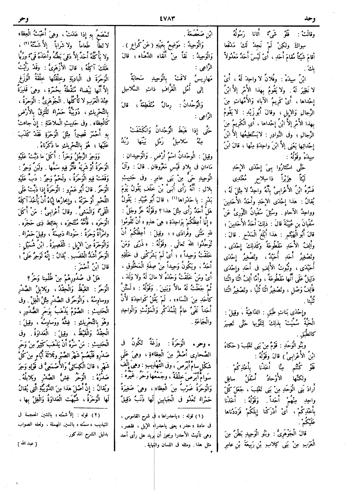 وقالتْ فلَوْ شَيءٌ أَتانا رَسُوله سِواكَ ولكنْ لم نَجِدْ لكَ مَدْفَعا أَقام شيئاً مقام أَحَدٍ أَي ليس أَحَدٌ مَعْدُولاً بك ابن سيده وفلان لا واحد له أَي لا نظير له ولا يقوم بهذا الأَمرِ إِلا ابن إِحداها أَي كريم الآباءِ والأُمهاتِ من الرجال والإِبل وقال أَبو زيد لا يقوم بهذا الأَمرِ إِلا ابن إِحداها أَي الكريم من الرجال وفي النوادر لا يستطيعها إِلا ابن إِحْداتها يعني إِلا ابن واحدة منها قال ابن سيده وقوله حتى اسْتثارُوا بيَ إِحْدَى الإِحَدِ لَيْثاً هِزَبْراً ذا سِلاحٍ مُعْتَدِي فسره ابن الأَعرابي بأَنه واحد لا مثل له يقال هذا إِحْدَى الإِحَدِ وأَحَدُ الأَحَدِين وواحِدُ الآحادِ وسئل سفيان الثوري عن سفيان بن عيينة قال ذلك أَحَدُ الأَحَدِين قال أَبو الهيثم هذا أَبلغ المدح قال وأَلف الأَحَد مقطوعة وكذلك إِحدى وتصغير أَحَد أُحَيْدٌ وتصغير إِحْدَى أُحَيدَى وثبوت الأَلِف في أَحَد وإِحْدى دليل على أَنها مقطوعة وأَما أَلِف اثْنا واثْنَتا فأَلِف وصل وتصغير اثْنا ثُنَيَّا وتصغير اثْنَتا ثُنَيَّتا وإِحْدَى بناتِ طَبَقٍ الدّاهِيةُ وقيل الحَيَّةُ سميت بذلك لِتَلَوِّيها حتى تصير كالطَّبَق وبَنُو الوَحَدِ قوم من بني تَغْلِب حكاه ابن الأَعرابي قال وقوله فَلَوْ كُنتُمُ مِنَّا أَخَذْنا بأَخْذِكم ولكِنَّها الأَوْحادُ أَسْفَلُ سافِلِ أَراد بني الوَحَد من بني تَغْلِبَ جعل كل واحد منهم أَحَداً وقوله أَخَذْنا بأَخْذِكم أَي أَدْرَكْنا إِبلكم فرددناها عليكم قال الجوهري وبَنُو الوَحِيدِ بطْنٌ من العرب من بني كلاب بن ربيعة بن عامر بن صَعْصَعةَ والوَحِيدُ موضع بعينه عن كراع والوحيد نَقاً من أَنْقاء الدَّهْناءِ قال الراعي مَهارِيسُ لاقَتْ بالوَحِيدِ سَحابةً إِلى أُمُلِ الغَرّافِ ذاتِ السَّلاسِلِ والوُحْدانُ رِمال منقطعة قال الراعي حتى إِذا هَبَطَ الوُحْدانُ وانْكَشَفَتْ مِنْه سَلاسِلُ رَمْلٍ بَيْنَها رُبَدُ وقيل الوُحْدانُ اسم أَرض والوَحِيدانِ ماءانِ في بلاد قَيْس معروفان قال وآلُ الوَحِيدِ حيٌّ من بني عامر وفي حديث بلال أَنه رَأَى أُبَيَّ بنَ خَلَفٍ يقول يوم بدر يا حَدْراها قال أَبو عبيد يقول هل أَحد رأَى مثل هذا ؟ وقوله عز وجل إِنما أَعظُكم بواحدة هي هذه أَنْ تقوموا لله مَثْنَى وفُرادَى وقيل أَعظُكم أَنْ تُوَحِّدُوا الله تعالى وقوله ذَرْني ومَن خَلَقْتُ وحِيداً أَي لم يَشْرَكْني في خلقه أَحَدٌ ويكون وحيداً من صفة المخلوق أَي ومَنْ خَلَقْتُ وحْدَه لا مال له ولا وَلد ثم جَعَلْت له مالاً وبنين وقوله لَسْتُنَّ كأَحَد من النساءِ لم يقل كَواحِدة لأَن أَحداً نفي عام للمذكر والمؤنث والواحد والجماعة