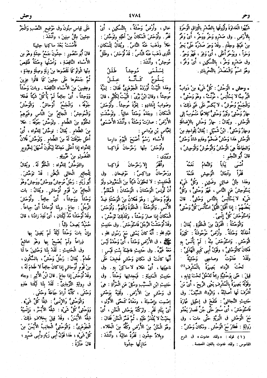 قيل عَنى بوَحْشِيّة رِيحاً تدخل تحت ثيابه وقوله بَصِيرة بالمُشْرف يعني الرِّيحَ أَي من أَشْرَفَ لها أَصابته والرِّداءُ السَّيفُ وفي حديث النجاشي فنَفَخَ في إِحْلِيل عُمارَةَ فاسْتَوْحَشَ أَي سُحِرَ حتى جُنَّ فصار يَعْدُو مَع الوَحْشِ في البَرِّية حتى مات وفي رواية فطارَ مع الوَحْشِ ومكانٌ وَحْشٌ خالٍ وأَرض وَحْشةٌ بالتسكين أَي قَفْرٌ وأَوْحَشَ المكانُ من أَهله وتوَحّشَ خَلا وذهبَ عنه الناسُ ويقال للمكان الذي ذهب عنه الناسُ قد أَوْحَشَ وطَلَلٌ مُوحِشٌ وأَنشد لِسَلْمى مُوحِشاً طَلَلُ يَلُوح كأَنه خِلَلُ وهذا البيت أَورده الجوهري فقال لِمَيّةَ موحشاً وقال ابن بري البيت لكُيَيّر قال وصواب إِنشاده لِعَزَّةَ موحشاً وأَوْحَشَ المكانَ وجَدَه وحْشاً خالياً وتوَحَّشَت الأَرضُ صارت وحْشةً وأَنشد الأَصمعي لعبّاس بن مِرْداس لأَسْماءَ رَسْمٌ أَصْبَحَ اليومَ دارِسا وأَوْحَشَ منها رَحْرَحانَ فراكِسا ويروى وأَقْفَر إِلاَّ رَحْرَحانَ فراكِسا ورَحْرَحانُ وراكِس موضعان وفي الحديث لا تَحْقِرَنَّ شيئاً من المعروف ولو أَن تُؤْنِسَ الوَحْشانَ الوَحْشانُ المُغْتَمُّ وقومٌ وَحاشَى وهو فَعْلانُ من الوَحْشة ضدّ الأُنْس والوَحْشةُ الخَلْوة والهَمُّ وأَوْحَشَ المكانُ إِذا صارَ وَحْشاً وكذلك توحّشَ وقد أَوْحَشْت الرجلَ فاسْتَوْحَشَ وفي حديث عبد اللَّه أَنه كان يَمْشِي مع رسول اللَّه صلى اللَّه عليه وسلم في الأَرضِ وَحْشاً أَي وحْدَه ليس معه غيره وفي حديث فاطمة بنت قيس أَنها كانت في مكانٍ وحْشٍ فخِيفَ على ناحِيتها أَي خَلاءٍ لا ساكنَ به وفي حديث المدينة فيَجدانه وَحْشاً وفي حديث ابن المسيب وسئل عن المرأَة هي في وَحْشٍ من الأَرض ولَقِيَه بوَحْشِ إِصْمِتَ وإِصْمِتَةَ ومعناه كمعنى الأَول أَي ببلد قَفْر وتركته بوَحْشِ المَتْنِ أَي بحيث لا يُقْدر عليه ثم فسّر المَتْنَ فقال وهو المتنُ من الأَرض وكلُّه من الخَلاء وبلادٌ حِشُون قَفْرةٌ خالية وأَنشد منازلُها حِشُونا على قياس سِنُونَ وفي موضع النصب والجرّ حِشِينَ مثل سِنِينَ وأَنشد فأَمْسَتْ بَعْدَ ساكِنها حِشِينَا قال أَبو منصور حِشُون جمعُ حِشَةٍ وهو من الأَسماء الناقصة وأَصلُها وِحْشةٌ فنُقِصَ منها الواوُ كما نَقَصُوها من زِنَةٍ وصِلَةٍ وعِدَة ثم جَمَعُوها على حِشِينَ كما قالوا عِزِينَ وعِضِينَ من الأَسماء الناقصة وباتَ وَحْشاً ووَحِشاً أَي جائعاً لم يأْكل شيئاً فخلا جَوفُه والجمع أَوْحاشٌ والوَحْشُ والمُوحِشُ الجائعُ من الناس وغيرهم لخُلُوِّهِ من الطعام وتوَحَّشَ جوفُه خَلا من الطعام ويقال تَوَحَّشْ للدَّواء أَي أَخْل جوفَك له من الطعام وتوَحَّشَ فلان للدَّواء إِذا أَخلى مَعِدَتَه ليكون أَسْهَلَ لخروج الفُضول من عُروقه والتوَحُّشُ للدواء الخُلُوُّ له ويقال للجائع الخالي البطن قد توَحَّشَ أَبو زيد رجل مُوحِشٌ ووحْشٌ ووحِشٌ وهو الجائع من قوم أَوْحاشٍ ويقال بات وَحْشاً ووَحِشاً أَي جائعاً وأَوْحَشَ الرجلُ جاعَ وبِتْنا أَوْحاشاً أَي جِياعاً وقد أَوْحَشْنا مُذْ لَيْلَتانِ أَي نِفِدَ زادُنا قال حُمَيد يصف ذئباً وإِن بات وحْشاً لَيْلةً لم يَضِقْ بها ذِراعاً ولم يُصْبِحْ بها وهو خاشِعُ وفي الحديث لقد بِتْنا وَحْشِينَ ما لنا طعام يقال رجل وَحْشٌ بالسكون من قوم أَوْحاشٍ إِذا كان جائعاً لا طعام له وقد أَوْحَشَ إِذا جاع قال ابن الأَثير وجاء في رواية الترمذي لقد بِتْنا لَيْلتَنا هذه وَحْشى كأَنه أَراد جماعةَ وحْشِيٍّ والوَحْشِيُّ والإِنْسِيُّ شِقَّا كلِّ شيء ووَحْشِيُّ كلِّ شيء شِقُّه الأَيْسَرُ وإِنْسِيُّه شِقُّه الأََيْمنُ وقد قيل بخلاف ذلك الجوهري والوَحْشِيُّ الجانبُ الأَيْمن من كل شيء هذا قول أَبي زيد وأَبي عمرو قال عنترة
