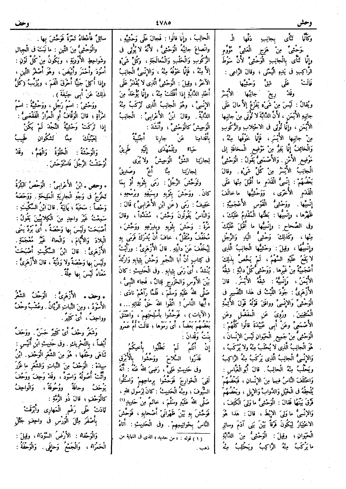 ( * قوله « من حديد » الذي في النهاية من ذهب ) فَوَحَّشَ به بين ظَهْرانَيْ أَصحابهِ فَوحّشَ الناسُ بخواتيمهم وفي الحديث أَتاه سائلٌ فأَعطاه تمرةً َوَحَّشَ بها والوحشي من التِّين ما نَبَت في الجبال وشَواحِط الأَوْدية ويكون من كل لون أَسود وأَحمر وأَبيض وهو أَصغر التين وإِذا أَكل جَنِيّاً أَحْرق الفم ويُزَبَّبُ كل ذلك عن أَبي حنيفة ووَحْشِيٌّ اسم رجل ووَحْشِيَّةُ اسم امرأَة قال الوَقَّافُ أَو المرّار الفقعسي إِذا تَرَكَتْ وَحْشِيَةُ النَّجْدَ لم يكن لِعَيْنَيك مما تَشْكُوانِ طَبِيبُ والوَحْشةُ الخَلْوةُ والهَمُّ وقد أَوْحَشْت الرجلَ فاسْتَوْحَشَ ( وحص ) ابن الأَعرابي الوَحْصُ البَثْرةُ تخرج في وجه الجارية المَلِيحة ووَحَصَه وَحْصاً سَحَبَه يمانية قال ابن السكيت سمعت غير واحد من الكلابيين يقول أَصْبَحَت وليس بها وَحْصَة أَي بَرْدٌ يعني البلاد والأَيامَ والحاء غير معجمة الأَزهري قال ابن السكيت أَصْبَحَتْ وليس بها وَحْصَة ولا وَذْية قال الأَزهري معناه ليس بها عِلَّة ( وحف ) الأَزهري الوحْف الشعر الأَسود ومن النبات الرَّيّان وعُشب وحْف وواحِف أَي كثير وشعر وحْف أَي كثير حسَن ووحَفٌ أَيضاً بالتحريك وفي حديث ابن أُنَيْس تَناهى وحْفُها هو من الشعر الوحف ابن سيده الوحف من النبات والشعر ما غَزُر وأَثَّتْ أُصوله واسودّ وقد وحِفَ ووَحُف يَوْحَف وَحافة ووُحُوفة والواحِفُ كالوحْف قال ذو الرمة تَمادَتْ على رَغْمِ المَهاري وأَبْرَقَتْ بأَصْفَرَ مثل الوَرْسِ في واحِفِ جَثْلِ والوَحْفاء الأَرض السَّوداء وقيل الحَمراء والجمع وَحافى والوَحْفةُ