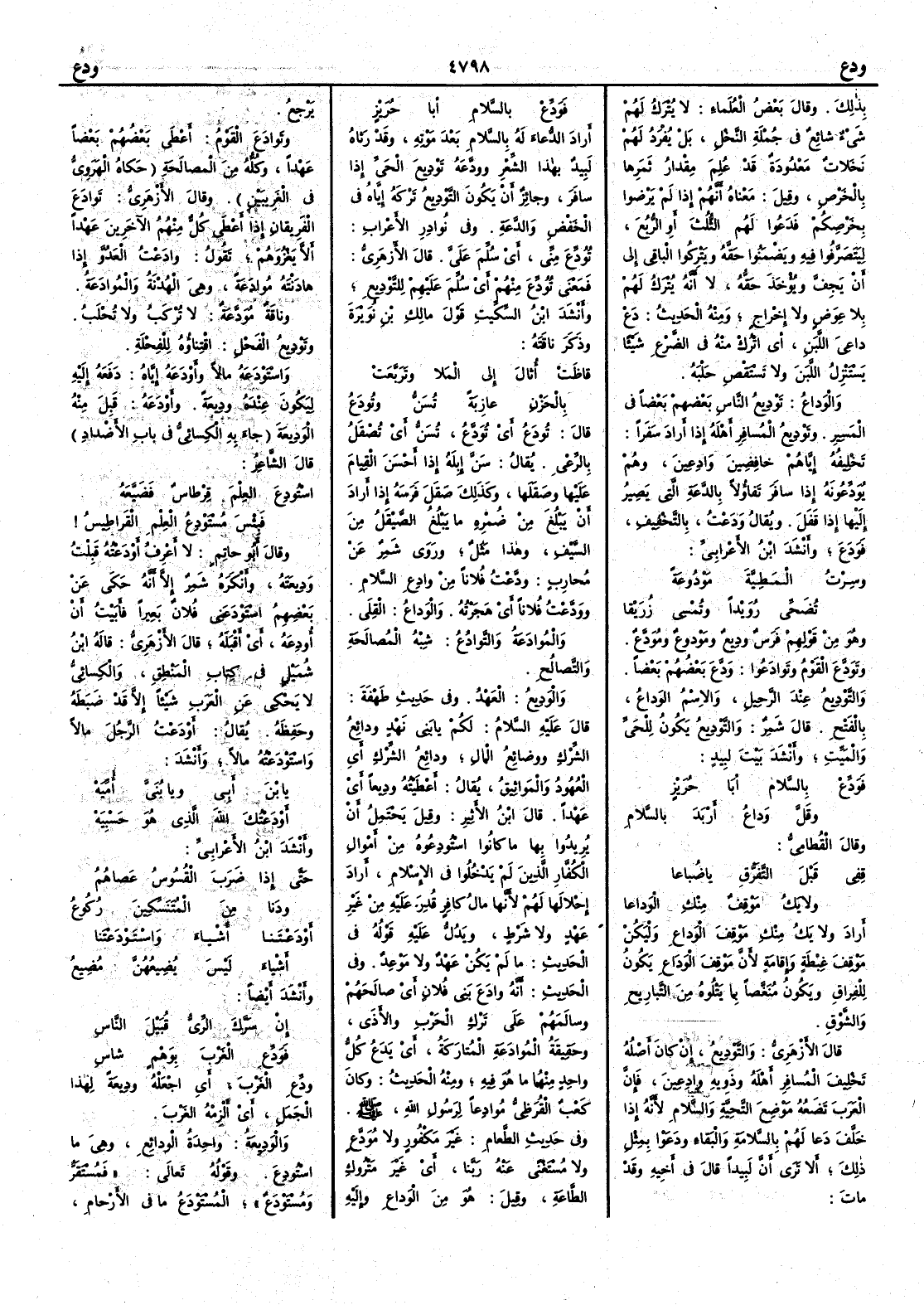 بذلك وقال بعض العلماء لا يُترك لهم شيءٌ شائِعٌ في جملة النخل بل يُفْرَدُ لهم نَخلاتٌ مَعْدودةٌ قد عُلِمَ مِقْدارُ ثمرها بالخَرْصِ وقيل معناه أَنهم إِذا لم يرضوا بِخَرْصِكُم فدَعوا لهم الثلث أَو الربع ليتصرفوا فيه ويضمنوا حقّه ويتركوا الباقي إِلى أَن يَجِفَّ ويُؤخذ حَقُّه لا أَنه يترك لهم بلا عوض ولا اخراج ومنه الحديث دَعْ داعِيَ اللَّبنِ أَي اتْرُكْ منه في الضَّرْع شيئاً يَسْتَنْزِلُ اللَّبَنَ ولا تَسْتَقْصِ حَلْبَه والوَداعُ تَوْدِيعُ الناس بعضهم بعضاً في المَسِيرِ وتَوْدِيعُ المُسافِرِ أَهلَه إِذا أَراد سفراً تخليفُه إِيّاهم خافِضِينَ وادِعِينَ وهم يُوَدِّعُونه إِذا سافر تفاؤُلاً بالدَّعةِ التي يصير إِليها إِذا قَفَلَ ويقال ودَعْتُ بالتخفيف فَوَوَدَعَ وأَنشد ابن الأَعرابي وسِرْتُ المَطِيّةَ مَوْدُوعةً تُضَحّي رُوَيْداً وتُمْسي زُرَيْقا وهو من قولهم فرَسٌ ودِيعٌ ومَوْدُوعٌ وموَدَّعٌ وتَوَدَّعَ القومُ وتَوادَعُوا وَدَّعَ بعضهم بعضاً والتوْدِيعُ عند الرَّحِيل والاسم الوَادع بالفتح قال شمر والتوْدِيعُ يكون للحيّ والميت وأَنشد بيت لبيد فَوَدِّعْ بالسَّلام أَبا حُرَيْزٍ وقَلَّ وداعُ أَرْبَدَ بالسلامِ وقال القطامي قِفي قَبْلَ التَّفَرُّقِ يا ضُباعا ولا يَكُ مَوْقِفٌ مِنْك الوَداعا أَراد ولا يَكُ مِنْكِ مَوْقِفَ الوَداعِ وليكن موقف غِبْطةٍ وإِقامة لأَنَّ موقف الوداع يكون لِلفِراقِ ويكون مُنَغَّصاً بما يتلوه من التبارِيحِ والشوْقِ قال الأَزهريّ والتوْدِيعُ وإِن كان أَصلُه تَخْليفَ المُسافِرِ أَهْله وذَوِيه وادِعينَ فإِنّ العرب تضعه موضع التحيةِ والسلام لأَنه إِذا خَلَّفَ دعا لهم بالسلامة والبقاء ودَعوْا بمثْلِ ذلك أَلا ترى أَن لبيداً قال في أخيه وقد مات فَوَدِّعْ بالسلام أَبا حُرَيْزٍ أَراد الدعاء له بالسلام بعد موته وقد رثاه لبيد بهذا الشعر وودَّعَه تَوْدِيعَ الحيّ إِذا سافر وجائز أَن يكون التوْدِيعُ تَرْكَه إِياه في الخفْضِ والدَّعةِ وفي نوادر الأَعراب تُوُدِّعَ مِنِّي أَي سُلِّمَ عَلَيَّ قال الأَزهري فمعنى تُوُدِّعَ منهم أَي سُلِّمَ عليهم للتوديع وأَنشد ابن السكيت قول مالك بن نويرة وذكر ناقته قاظَتْ أُثالَ إِلى المَلا وتَرَبَّعَتْ بالحَزْنِ عازِبةً تُسَنُّ وتُودَعُ قال تُودَعُ أَي تُوَدَّعُ تُسَنُّ أَي تُصْقَلُ بالرَّعْي يقال سَنَّ إِبلَه إِذا أَحْسَنَ القِيامَ عليها وصَقَلَها وكذلك صَقَلَ فَرَسَه إِذا أَراد أَن يَبْلُغَ من ضُمْرِه ما يبلغ الصَّيْقَلُ من السيف وهذا مثل وروى شمر عن محارب ودَّعْتُ فلاناً من وادِع السلام ووَدَّعْتُ فلاناً أَي هَجَرْتُه والوَداعُ القِلى والمُوادَعةُ والتَّوادُعُ شِبْهُ المُصالحةِ والتَّصالُحِ والوَدِيعُ العَهْدُ وفي حديث طَهْفةَ قال عليه السلام لكم يا بني نهْدٍ ودائِعُ الشِّرْكِ ووضائعُ المال ودائِعُ الشرْكِ أَي العُهودُ والمَواثِيقُ يقال أَعْطَيْتُه وَدِيعاً أَي عَهْداً قال ابن الأَثير وقيل يحتمل أَن يريدوا بها ما كانوا اسْتُودِعُوه من أَمْوالِ الكفار الذين لم يدخلوا في الإِسلام أَراد إِحْلالَها لهم لأَنها مال كافر قُدِرَ عليه من غير عَهْدٍ ولا شرْطٍ ويدل عليه قوله في الحديث ما لم يكن عَهْدٌ ولا مَوْعِدٌ وفي الحديث أَنه وادَعَ بَني فلان أَي صالَحَهم وسالَمَهم على ترك الحرب والأَذى وحقيقة المُوادعةِ المُتاركةُ أَي يَدَعُ كل واحد منهما ما هو فيه ومنه الحديث وكان كعب القُرَظِيُّ مُوادِعاً لرسول الله صلى الله عليه وسلم وفي حديث الطعام غَيْرَ مَكْفُورٍ ولا مُوَدَّعٍ لا مُسْتَغْنًى عنه رَبّنا أَي غير مَتْرُوكِ الطاعةِ وقيل هو من الوَداعِ وإِليه يَرْجِعُ وتَوادَعَ القوم أَعْطى بعضُهم بعضاً عَهْداً وكله من المصالحة حكاه الهرويّ في الغريبين وقال الأَزهري تَوادَعَ الفَريقانِ إِذا أَعْطى كل منهم الآخرِينَ عهداً أَن لا يَغْزُوَهُم تقول وادَعْتُ العَدُوَّ إِذا هادَنْتَه مُ