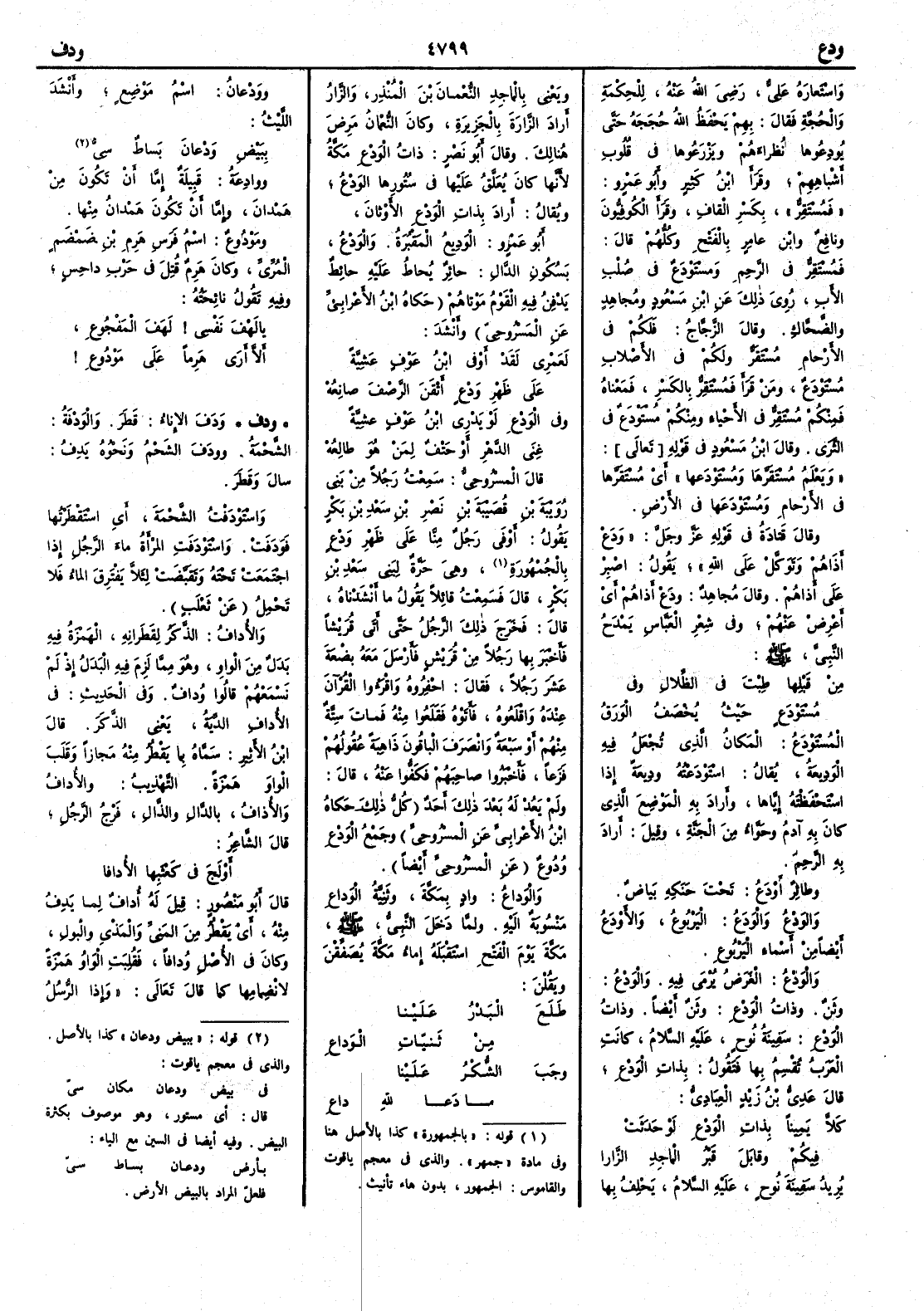 واسْتَعاره علي رضي الله عنه للحِكْمة والحُجّة فقال بهم يَحفظ اللهُ حُجَجَه حتى يودِعوها نُظراءَهُم ويَزرَعُوها في قُلوبِ أَشباهِهِم وقرأَ ابن كثير وأَبو عمرو فمستقِرّ بكسر القاف وقرأَ الكوفيون ونافع وابن عامر بالفتح وكلهم قال فَمُسْتَقِرّ في الرحم ومستودع في صلب الأَب روي ذلك عن ابن مسعود ومجاهد والضحاك وقال الزجاج فَلَكُم في الأَرْحامِ مُسْتَقَرٌّ ولكم في الأَصْلاب مُسْتَوْدَعٌ ومن قرأَ فمستقِرّ بالكسر فمعناه فمنكم مُسْتَقِرٌّ في الأَحياء ومنكم مُسْتَوْدَعٌ في الثَّرى وقال ابن مسعود في قوله ويعلم مُسْتَقَرَّها ومُسْتَوْدَعها أَي مُستَقَرَّها في الأَرحام ومُسْتَوْدَعَها في الأَرض وقال قتادة في قوله عز وجل ودَعْ أَذاهُم وتَوَكَّلْ على الله يقول اصْبِرْ على أَذاهم وقال مجاهد ودع أَذاهم أَي أَعْرِضْ عنهم وفي شعر العباس يمدح النبي صلى الله عليه وسلم مِنْ قَبْلِها طِبْتَ في الظِّلالِ وفي مُسْتَوْدَعٍ حيثُ يُخْصَفُ الوَرَقُ المُسْتَوْدَعُ المَكانُ الذي تجعل فيه الوديعة يقال اسْتَوْدَعْتُه ودِيعةً إِذا اسْتَحْفَظْتَه إَيّاها وأَراد به الموضع الذي كان به آدمُ وحوّاء من الجنة وقيل أَراد به الرَّحِمَ وطائِرٌ أَوْدَعُ تحتَ حنَكِه بياض والوَدْعُ والوَدَعُ اليَرْبُوعُ والأَوْدَع أَيضاً من أَسماء اليربوع والوَدْعُ الغَرَضُ يُرْمَى فيه والوَدْعُ وثَنٌ وذاتُ الوَدْعِ وثَنٌ أَيضاً وذات الوَدْعِ سفينة نوح عليه السلام كانت العرب تُقْسِمُ بها فتقول بِذاتِ الودْع قال عَدِيّ بن زيد العبّادِي كَلاّ يَمِيناً بذاتِ الوَدْعِ لَوْ حَدَثَتْ فيكم وقابَلَ قَبْرُ الماجِدِ الزّارا يريد سفينةَ نوح عليه السلام يَحْلِفُ بها ويعني بالماجِدِ النُّعمانَ بنَ المنذِرِ والزَّارُ أَراد الزارة بالجزيرة وكان النعمان مَرِضَ هنالك وقال أَبو نصر ذاتُ الودْعِ مكةُ لأَنها كان يعلق عليها في سُتُورِها الوَدْعُ ويقال أَراد بذات الوَدْعِ الأَوْثانَ أَبو عمرو الوَدِيعُ المَقْبُرةُ والودْعُ بسكون الدال جائِرٌ يُحاطُ عليه حائطٌ يَدْفِنُ فيه القومُ موتاهم حكاه ابن الأَعرابي عن المَسْرُوحِيّ وأَنشد لَعَمْرِي لقد أَوْفى ابنُ عَوْفٍ عشِيّةً على ظَهْرِ وَدْعٍ أَتْقَنَ الرَّصْفَ صانِعُهْ وفي الوَدْعِ لو يَدْري ابنُ عَوْفٍ عشِيّةً غِنى الدهْرِ أَو حَتْفٌ لِمَنْ هو طالِعُهْ قال المسروحيّ سمعت رجلاً من بني رويبة بن قُصَيْبةَ بن نصر بن سعد بن بكر يقول أَوْفَى رجل منا على ظهر وَدْعٍ بالجُمْهُورةِ وهي حرة لبني سعد بن بكر قال فسمعت قائلاً يقول ما أَنْشَدْناه قال فخرج ذلك الرجل حتى أَتى قريشاً فأَخبر بها رجلاً من قريش فأَرسل معه بضعة عشر رجلاً فقال احْفِرُوه واقرؤوا القرآن عنده واقْلَعُوه فأَتوه فقلعوا منه فمات ستة منهم أَو سبعة وانصرف الباقون ذاهبة عقولهم فَزَعاً فأَخبروا صاحبهم فكَفُّوا عنه قال ولم يَعُدْ له بعد ذلك أَحد كلّ ذلك حكاه ابن الأَعرابي عن المسروحيّ وجمع الوَدْعِ وُدُوعٌ عن المسروحي أَيضاً والوَداعُ وادٍ بمكةَ وثَنِيّةُ الوَداعِ منسوبة إِليه ولما دخل النبي صلى الله عليه وسلم مكة يوم الفتح استقبله إِماءُ مكةَ يُصَفِّقْنَ ويَقُلْن طَلَعَ البَدْرُ علينا من ثَنيّاتِ الوداعِ وجَبَ الشكْرُ علينا ما دَعا للهِ داعِ ووَدْعانُ اسم موضع وأَنشد الليث ببيْض وَدْعانَ بِساطٌ سِيُّ ووادِعةُ قبيلة إِما أَن تكون من هَمْدانَ وإِمّا أَن تكون هَمْدانُ منها وموْدُوعٌ اسم فرس هَرِمِ بن ضَمْضَمٍ المُرّي وكان هَرِمٌ قُتِلَ في حَرْبِ داحِسٍ وفيه تقول نائحتُه يا لَهْفَ نَفْسِي لَهَفَ المَفْجُوعِ أَنْ لا أَرَى هَرِماً على مَوْدُوعِ ( ودف ) وَدَف الإناءُ قطَر والوَدْفةُ الشحمة ودَفَ الشحْمُ ونحوه يَدِف سالَ وقطَر واسْتَوْدَفْت الشحمة أي اسْتَقْطرْتها فَوَدفت واسْتَوْدفَت المرأَةُ ماء الرجل إذا اجتمعت تحته وتقبَّضت لئلاَّ يفترق الماء فلا تحمل عن ثعلب والأُدافُ الذكر لقَطَرانه الهم