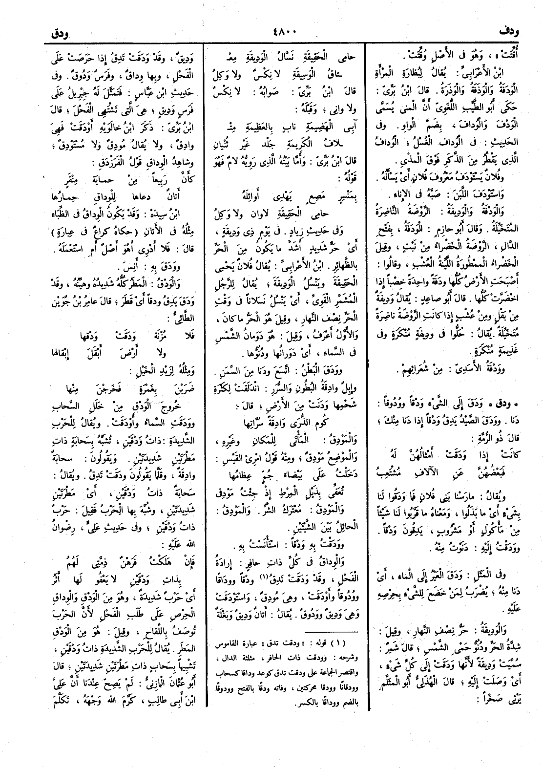 أُقِّتت وهو في الأَصل وُقِّتت ابن الأَعرابي يقال لبُظارة المرأَة الوَدَفَةُ والوَذَفَةُ والوَذَرَة قال ابن بري حكى أَبو الطيب اللغوي أَن المني يسمى الوَدْف والوُداف بضم الواو وفي الحديث في الوداف الغُسل الوُداف الذي يقطر من الذكر فوق المذي وفلان يَسْتوْدِف معروف فلان أَي يسأَله واستودفَ اللَّبَن صبّه في الإناء والوَدْفة والوَدِيفة الرَّوْضة الناضرة المُتَخيِّلة وقال أَبو حازم الودَفة بفتح الدال الروضة الخضراء من نبت وقيل الخضراء الممطورة اللينة العُشبِ وقالوا أَصبحت الأَرض كلها ودَفة واحدة خِصْباً إذا اخضرت كلها قال أَبو صاعد يقال ودِيفة من بقل ومن عُشب إذا كانت الروضة ناضرة متخيّلة يقال حَلُّوا في ودِيفة مُنْكَرة وفي غَذِيمة منكرة ووَدْفةُ الأَسدي من شُعرائهم ( ودق ) ودَقَ إلى الشيء وَدْقاً ووُدُوقاً دنا ووَدَق الصيدُ يَدِقُ وَدْقاً إذا دنا منك قال ذو الرمة كانَتْ إذا وَدَقَتْ أَمثالُهُنَّ لَهُ فبَعْضُهُنَّ عن الآلاف مُشْتَعِبُ ويقال مارَسْنا بني فلان فما وَدَقُوا لنا بشيء أي ما بذلوا ومعناه ما قَرَّبوا لنا شيئاً من مأْكول أو مشروب يَدِقُون وَدْقاً ووَدَقْتُ إليه دنوت منه وفي المثل وَدَق العَيْرُ إلى الماء أي دنا منه يضرب لمن خضع للشيء بحِرْصه عليه والوَدِيقةُ حَرُّ نصف النهار وقيل شدة الحر ودُنُوّ حَمْيِ الشمس قال شمر سميت وَدِيقة لأنها وَدَقَتْ إلى كل شيء أي وصلت إليه قال الهذلي أبو المثلم يَرْثي صَخْراً حامي الحَقِيقةِ نَسَّال الوَدِيقة مِعْ تاق الوَسِيقة لا نِكْس ولا وَكِل قال ابن بري صوابه لا نِكْس ولا واني وقبله آبي الهَضِيمة نابٍ بالعَظِيمة مِتْ لاف الكَرِيمة جَلْد غير ثُنْيانِ قال ابن بري وأما بيته الذي رَوِيُّه لام فهو قوله بمَنْسِرٍ مَصِعٍ يَهْدي أَوائِلَه حامِي الحَقيقةِ لا وانٍ ولا وَكِل وفي حديث زياد في يومٍ ذي وَدِيقةٍ أي حر شديد أشد ما يكون من الحر بالظهائر ابن الأَعرابي يقال فلان يَحْمي الحقيقة ويَنْسُل الوَدِيقةَ يقال للرجل المُشَمِّر القويّ أي يَنْسُل نَسَلاناً في وقت الحر نصف النهار وقيل هو الحَرُّ ما كان والأول أَعْرَفُ وقيل هو دَوَمان الشمس في السماء أَي دَورَانها ودنوّها وودَقَ البطنُ اتسع ودنا من السِّمَنِ وإبل وادِقةُ البُطون والسُّرَر انْدَلَقَتْ لكثرة شحمها ودنت من الأَرض قال كُوم الذُّرَى وَادِقة سُرَّاتُها والمَوْدِقُ المَأْتَى للمكان وغيره والموضع مَوْدِقٌ ومنه قول امرئ القيس دَخَلْتُ على بَيْضاءَ جَمٍّ عِظامُها تُعَفِّي بذَيْلِ المِرْطِ إذ جِئْتُ مَوْدقي والمَوْدِقُ مُعْتَرَكُ الشر والمَوْدِق الحائل بين الشيئين ووَدَقْت به وَدْقاً استأْنست به والوِداقُ في كل ذات حافر إرادة الفحل وقد وَدَقَتْ تَدِقُ وَدْقاً وودَاقاً ووُدُوقاً وأَوْدَقَتْ وهي مُودِق واسْتَوْدَقت وهي وَدِيق ووَدُوق يقال أتان وَدِيقٌ وبغلة ودِيقٌ وقد وَدَقَتْ تَدِقُ إذا حَرَصت على الفحل وبها وِداقٌ وفرس وَدُوق وفي حديث ابن عباس فتمثل له جبريل على فرس وَدِيقٍ هي التي تشتهي الفحل قال ابن بري ذكر ابن خالويه أوْدَقَتْ فهي وادِقٌ ولا يقال مُودِق ولا مُسْتَوْدِق وشاهد الوِداقِ قول الفرزدق كأَن رَبيعاً من حِماية مِنْقَرٍ أَتانٌ دعاها للوِداقِ حِمارُها ابن سيده وقد يكون الوِداقُ في الظِّباء مثله في الأَتان حكاه كراع في عبارة قال فلا أَدري أَهو أَصل أم استعمله ووَدَقَ به أَنِسَ والوَدْقُ المطر كله شديدهُ وهيّنُه وقد وَدَقَ يَدِقُ وَدْقاً أي قَطَر قال عامر بن جُوَيْن الطائي فلا مُزْنة ودَقَتْ وَدْقَها ولا أَرْضَ أَبْقَلَ إبْقالها ومثله لزيد الخيل ضَرَبْنَ بِغَمْرةٍ فخَرجْنَ منها خُروجَ الوَدْقِ من خَلَلِ السَّحاب ووَدَقَت السماء وأَوْدَقَت ويقال للحَرْب الشديدة ذاتُ وَدْقَيْنِ تُشَبَّهُ بسحابة ذات مطرتين شديدتين ويقولون سحابة وادِقةٌ وقلما يقولون ودَقَتْ تَدِقُ ويقال سحابة ذات وَدْقَيْن أي مطرتين شديدتين وشبه بها الحرب فق