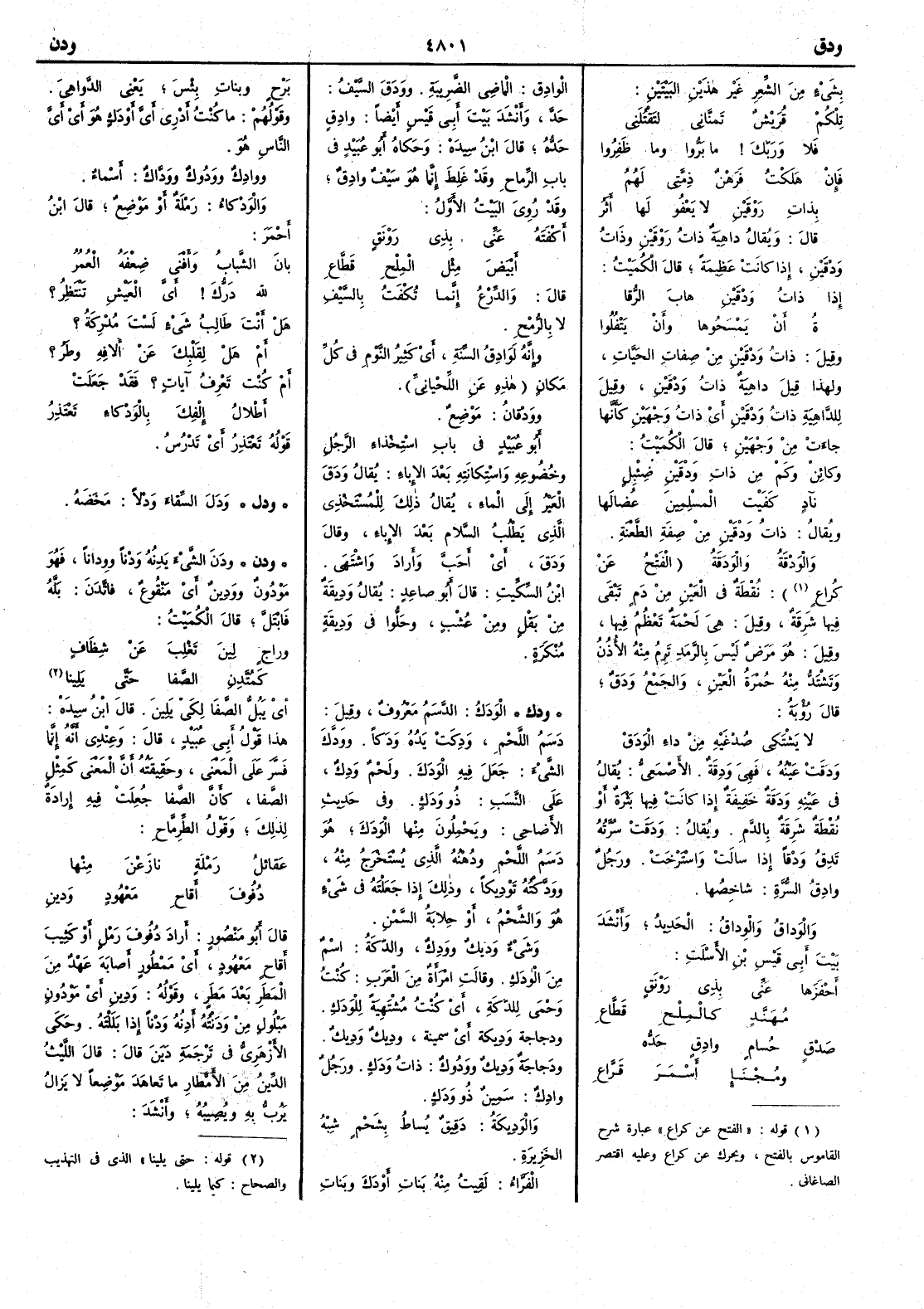 ( * قوله « الفتح عن كراع » عبارة شرح القاموس بالفتح ويحرك عن كراع وعليه اقتصر الصاغاني ) نقطة في العين من دم تبقى فيها شَرقة وقيل هي لحمة تعظُم فيها وقيل مرض ليس بالرَّمَد تَرِمُ منه الأُذن وتشتد منه حمرة العين والجمع وَدَق قال رؤبة لا يشْتَكي صُدْغَيْهِ من داء الوَدَقْ وَدِقَتْ عينه فهي وَدِقةٌ الأصمعي يقال في عينه وَدَقة خفيفةٌ إذا كانت فيها بَثْرَةٌ أو نقطة شَرِقة بالدم ويقال وَدَقَتْ سُرّته تَدِقُ وَدْقاً إذا سالت واسترخت ورجل وادِقُ السُّرَّةِ شاخصها والوَداقُ والوِدَاقُ الحديد وأَنشد بيت أَبي قيس بن الأَسْلَت أَحْفَزَها عَنِّي بِذِي رَوْنَقٍ مُهَنَّدٍ كالمِلْح قَطَّاعِ صَدْقٍ حُسَامٍ وادِقٍ حَدُّه ومُجْنَإِ أَسْمَرَ قَرَّاعِ الوادِق الماضي الضريبة ووَدَقَ السيفُ حَدَّ وأَنشد بيت أبي قيس أَيضاً وادِقٍ حدُّه قال ابن سيده وحكاه أبو عبيد في باب الرماح وقد غلط إنما هو سيف وادِقٌ وقد روي البيت الأَول أَكْفَتهُ عَنّي بذي رَوْنَقٍ أَبيضَ مثل المِلْح قَطّاع قال والدِّرْعُ إنما تُكْفَتُ بالسيف لا بالرمح وإنه لوَادِقُ السِّنَةِ أي كثير النوم في كل مكان هذه عن اللحياني ووَدْقانُ موضع أبو عبيد في باب اسْتِخْذاء الرجل وخضوعه واستكانته بعد الإباء يقال وَدَقَ العَيْرُ إلى الماء يقال ذلك للمُسْتَخذي الذي يطلب السَّلام بعد الإباء وقال وَدَقَ أي أَحَبَّ وأَراد واشتهى ابن السكيت قال أَبو صاعد يقال وَدِيقةٌ من بَقْل ومن عُشْب وحَلُّوا في وَديقةٍ منكَرة