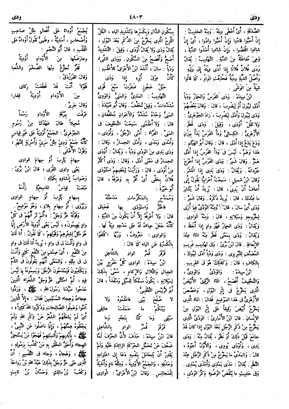 الصدقة أَي أَعطى دِيَته ومنه الحديث إِن أَحَبُّوا قادُوا وإِن أَحَبُّوا وادُوا أَي إِن شاؤوا اقتَصُّوا وإِن شاؤوا أَخَذوا الدِّية وهي مفاعلة من الدية التهذيب يقال ودى فلان فلاناً إِذا أَدَّى ديته إِلى وليه وأَصل الدِّيَّة وِدْية فحذفت الواو كما قالوا شِيةٌ من الوَشْي ابن سيده ودى الفرسُ والحِمارُ وَدْياً أَدْلى ليَبُول أَو ليَضْرِبَ قال وقال بعضهم وَدَى ليبول وأَدْلى ليَضْرب زاد الجوهري ولا تقل أَوْدى وقيل وَدَى قطرَ الأَزهري الكسائي وَدَأَ الفرسُ يَدَأْ بوزن وَدَعَ يَدَعُ إِذا أَدلى قال وقال أَبو الهيثم هذا وهَمٌ ليس في وَدَأَ الفرسُ إِذا أَدْلى همز وقال شمر وَدى الفَرسُ إِذا أَخرج جُرْدانَه ويقال وَدى يَدي إِذا انتشر وقال ابن شميل سمعت أَعرابيّاً يقول إني أَخاف أَن يَدي قال يريد أَن يَنْتَشِرَ ما عندك قال يريد ذكره وقال شمر وَدى أَي سال قال ومنه الوَدْيُ فيما أُرى لخُروجه وسَيَلانِه قال ومنه الوادي ويقال ودى الحِمارُ فهو وادٍ إذا أَنْعَظَ ويقال وَدَى بمعنى قَطَر منه الماء عند الإِنْعاظِ قال ابن بري وفي تهذيب غريب المصنف للتبريزي وَدَى وَدْياً أَدْلى ليَبُوكَ بالكاف قال وكذلك هو في الغريب ابن سيده والوَدْيُ والوَدِيُّ والتخفيف أَفصح الماءُ الرقيقُ الأَبيضُ الذي يَخرج في إِثْرِ البول وخصص الأَزهري في هذا الموضع فقال الماء الذي يخرج أَبيض رقيقاً على إِثر البول من الإِنسان قال ابن الأَنباري الوَدْيُ الذي يخرج من ذكر الرجل بعد البول إِذا كان قد جامع قبل ذلك أَو نَظَرَ يقال منه وَدى يَدي وأَوْدى يُودي والأَول أَجود قال والمَذْيُ ما يخرج من ذكر الرجل عند النظر يقال مَذى يَمْذي وأَمْذى يُمْذي وفي حديث ما ينقض الوضوءَ ذكر الودي بسكون الدال وبكسرها وتشديد الياء البلَل اللّزِجُ الذي يخرج من الذكر بعد البول يقال وَدى ولا يقال أَوْدى وقيل التشديد أَصح وأَفصح من السكون ووَدى الشيءُ وَدْياً سال أَنشد ابن الأَعرابي للأَغلب كأَنَّ عِرْقَ أَيْرِه إِذا ودى حَبْلُ عَجُوزٍ ضَفرَتْ سَبْع قُوى التهذيب المَذِيُّ والمَنِيُّ والوَدِيُّ مشدداتٌ وقيل تخفيف وقال أَبو عبيدة المَنِيُّ وحده مشدد والآخران مخففان قال ولا أَعلمني سمعت التخفيف في المَنِيّ الفراء أَمْنى الرجل وأَوْدى وأَمْذى ومَذى وأَدْلى الحِمارُ وقال وَدى يَدي من الوَدْيِ وَدْياً ويقال أَوْدى الحِمارُ في معنى أَدْلى وقال وَدى أَكثر من أَوْدى قال ورأَيت لبعضهم استَوْدى فلان بحَقِّي أَي أَقَرَّ به وعَرَفه قال أَبو خيرة ومُمَدَّحٍ بالمَكْرُوماتِ مَدَحْتُه فاهْتَزَّ واستَودى بها فحَباني قال ولا أَعرفه إِلا أَن يكون من الدِّية كأَنه جَعل حِباءَه له على مَدْحِه دِيةً لها والوادي معروف وربما اكتفوا بالكسرة عن الياء كما قال قَرْقَرَ قُمْرُ الوادِ بالشاهِقِ ابن سيده الوادي كل مَفْرَج بين الجبالِ والتِّلال والإِكام سمي بذلك لسَيَلانه يكون مَسْلَكاً للسيل ومَنْفَذاً قال أَبو الرُّبَيْس التغلَبيّ لا صُلْح بَيْنِي فاعْلَمُوه ولا بَيْنَكُم ما حَمَلَتْ عاتِقي سَيْفِي وما كُنَّا بِنَجْدٍ وما قَرْقَرَ قُمْرُ الوادِ بالشَّاهِقِ قال ابن سيده حذف لأَن الحرف لما ضعف عن تحمل الحركة الزائدة عليه ولم يقدر أَن يَتَحَامَلَ بنفسه دَعا إِلى اخترامه وحذفه والجمع الأَوْدِيةُ ومثله نادٍ وأَنْدِيةٌ للمَجالس وقال ابن الأَعرابي الوادِي يجمع أَوْداء على أَفْعالٍ مثل صاحبٍ وأَصْحابٍ أَسدية وطيء تقول أَوداهٌ على القلب قال أَبو النجم وعارَضَتْها مِنَ الأَوْداهِ أَوْدِيةٌ قَفْرٌ تُجَزِّعُ منها الضَّخْمَ والشعبا