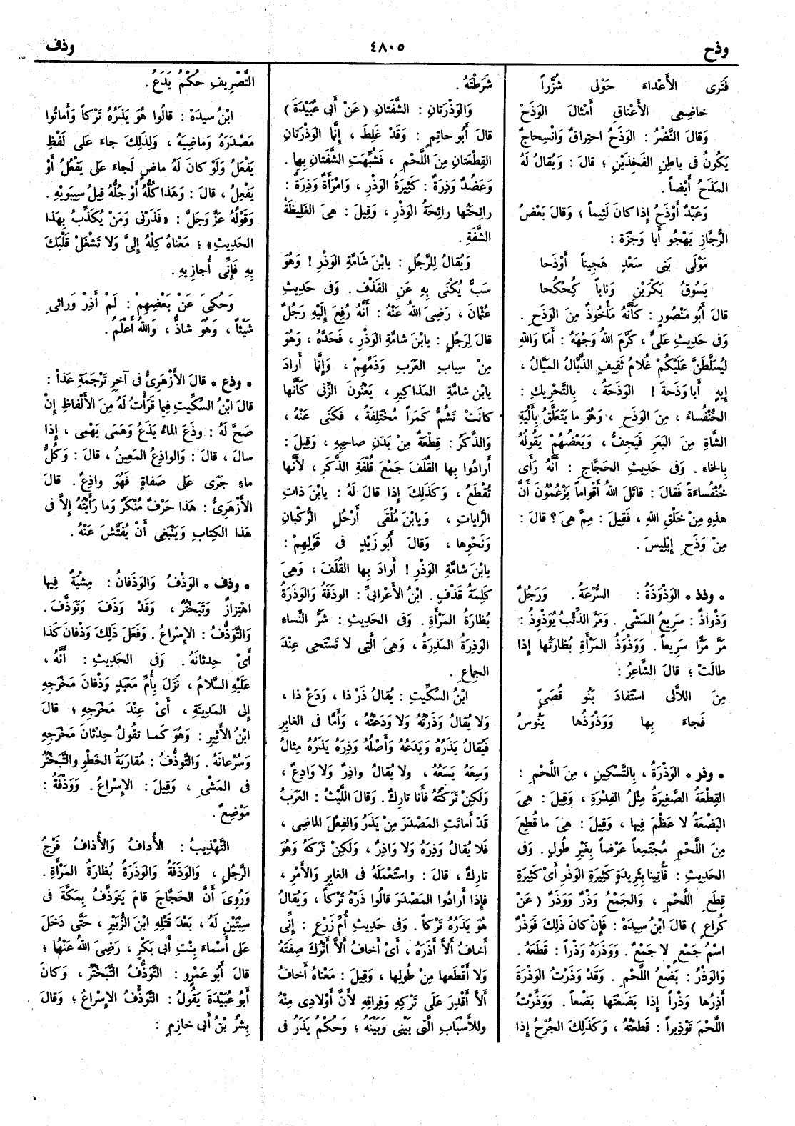 ( وذذ ) الوَذْوَذَة السرعة ورجل وَذْواذٌ سريع المشي ومر الذئب يُوَذْوِذُ مَرّ مَرّاً سريعاً وَوَذْوَذُ المرأَة بُظارتها إِذا طالت قال الشاعر من اللاَّئي اسْتَفاد بنو قُصَيٍّ فجاء بها وَوَذْوَذُها يَنُوس( وذر ) الوَذْرَةُ بالتسكين من اللحم القطعة الصغيرة مثل الفِدْرَةِ وقيل هي البَضْعَةُ لا عظم فيها وقيل هي ما قطع من اللحم مجتمعاً عَرْضاً بغير طُولٍ وفي الحديث فأَتينا بثريدة كثيرة الوَذْرِ أَي كثيرة قِطَعِ اللحم والجمع وَذْرٌ ووَذَرٌ عن كراع قال ابن سيده فإِن كان ذلك فوَذْرٌ اسم جمع لا جمع ووَذَرَه وَذْراً قَطَعَه والوَذْرُ بَضْعُ اللحم وقد وَذَرْتُ الوَذْرَةَ أَذِرُها وَذْراً إِذا بَضَعْتَها بَضْعاً ووَذَّرْتُ اللحم تَوْذِيراً قطعته وكذلك الجُرْح إِذا شرطته والوَذْرَتانِ الشَّفَتانِ عن أَبي عبيدة قال أَبو حاتم وقد غلط إِنما الوَذْرَتان القطعتان من اللحم فشبهت الشفتان بهما وعَضُدٌ وذِرَة كثيرة الوَذْرِ وامرأَة وَذِرَةٌ رائحتها رائحة الوَذْرِ وقيل هي الغليظة الشفة ويقال للرجل يا ابنَ شَامَّة الوَذْرِ وهو سَبٌّ يكنى به عن القذف وفي حديث عثمان رضي الله عنه أَنه رُفِعَ إِليه رجلٌ قال لرجل يا ابن شامَّة الوَذْرِ فحَدَّه وهو من سِبابِ العَرَبِ وذَمِّهم وإِنما أَراد يا ابن شامَّة المَذاكير يعنون الزنا كأَنها كانت تَشُمُّ كَمَراً مختلفة فكني عنه والذكر قطعة من بدن صاحبه وقيل أَرادوا بها القُلَفَ جمع قُلْفَةِ الذكر لأَنها تقطع وكذلك إِذا قال له يا ابن ذات الرايات ويا ابن مُلْقى أَرحُل الرُّكْبانِ ونحوها وقال أَبو زيد في قولهم يا ابن شامّة الوَذْرِ أَراد بها القُلَفَ وهي كلمة قذف ابن الأَعرابي الوَدَفَةُ والوَذَرَةُ بُظارةُ المرأَة وفي الحديث شر النساء الوَذِرَةُ المَذِرَةُ وهي التي لا تستحي عند الجماع ابن السكيت يقال ذَرْ ذا ودَعْ ذا ولا يقال وَذَرْتُه ولا وَدَعْتُه وأَما في الغابر فيقال يَذَرُه ويَدَعُه وأَصله وَذِرَهُ يَذَرُه مثال وَسِعَه يَسَعُه ولا يقال واذِرٌ لا واَدِعٌ ولكن تركته فأَنا تارك وقال الليث العرب قد أَماتت المصدر من يَذَرُ والفعلَ الماضي فلا يقال وَذِرَهُ ولا وَاذِرٌ ولكن تركه وهو تارك قال واستعمله في الغابر والأَمر فإِذا أَرادوا المصدر قالوا ذَرْهُ تَرْكاً ويقال هو يَذَرُه تركاً وفي حديث أُم زرع إِني أَخاف أَن لا أَذَرَه أَي أَخاف أَن لا أَترك صفته ولا أَقطعها من طولها وقيل معناه أَخاف أَن لا أَقدر على تركه وفراقه لأَن أَولادي منه والأَسباب التي بيني وبينه وحكم يَذَرُ في التصريف حكم يَدَعُ ابن سيده قالوا هو يَذَرُه تَرْكاً وأَماتوا مصدره وماضيه ولذلك جاء على لفظ يَفْعَلُ ولو كان له ماض لجاء على يَفْعُلُ أَو يَفْعِلُ قال وهذا كُلُّه أَو جُلُّه قِيلُ سيبويه وقوله عز وجل فَذَرْني ومن يكذب بهذا الحديث معناه كِلْه إِليّ ولا تَشْغَلْ قَلْبَكَ به فإِني أُجازيه وحكي عن بعضهم لم أَذِرْ وَرائي شيئاً وهو شاذ والله أَعلم