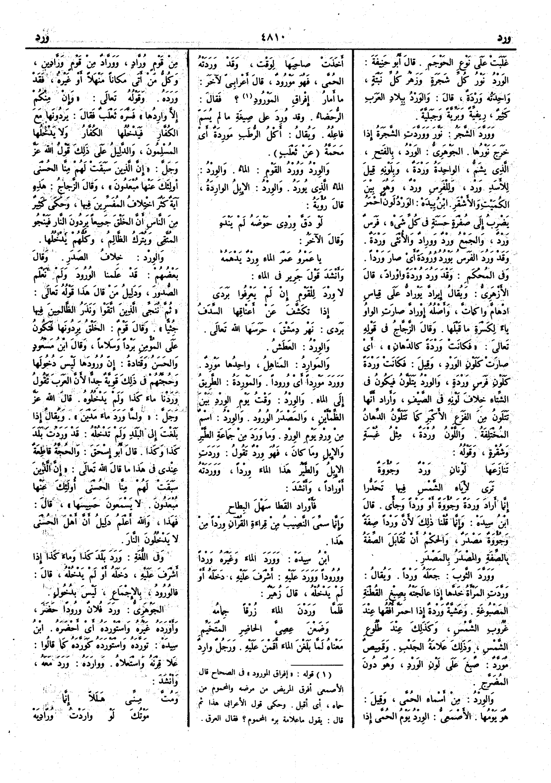 ( * قوله « إفراق المورود » في الصحاح قال الأَصمعي أفرق المريض من مرضه والمحموم من حماه أي أَقبل وحكى قول الأعرابي هذا ثم قال يقول ما علامة برء المحموم ؟ فقال العرق ) فقال الرُّحضاءُ وقد وُرِدَ على صيغة ما لم يُسَمّ فاعله ويقال أَكْلُ الرُّطَبه مَوْرِدةٌ أَي مَحَمَّةٌ عن ثعلب والوِرْدُ وُوردُ القوم الماء والوِرْدُ الماء الذي يُورَدُ والوِرْدُ الابل الوارِدة قال رؤبة لو دَقَّ وِرْدي حَوْضَه لم يَنْدَهِ وقال الآخر يا عَمْرُو عَمْرَ الماء وِرْدٌ يَدْهَمُهْ وأَنشد قول جرير في الماء لا وِرْدَ للقَوْمِ إِن لم يَعْرِفُوا بَرَدى إِذا تكَشَّفَ عن أَعْناقِها السَّدَفُ بَرَدى نهر دِمَشْقَ حرسها الله تعالى والوِرْدُ العَطَشُ والمَوارِدُ المَناهِلُ واحِدُها مَوْرِدٌ وَوَرَدَ مَوْرِداً أَي وُرُوداً والمَوْرِدةُ الطريق إِلى الماء والوِرْدُ وقتُ يومِ الوِرْدِ بين الظِّمْأَيْنِ والمَصْدَرُ الوُرُودُ والوِرْدُ اسم من وِرْدِ يومِ الوِرْدِ وما وَرَدَ من جماعة الطير والإِبل وما كان فهو وِرْدٌ تقول وَرَدَتِ الإِبل والطير هذا الماءَ وِرْداً وَوَرَدَتْهُ أَوْراداً وأَنشد فأَوْراد القَطا سَهْلَ البِطاحِ وإِنما سُمِّيَ النصيبُ من قراءَة القرآن وِرْداً من هذا ابن سيده ووَرَدَ الماءَ وغيره وَرْداً ووُرُوداً وَوَرَدَ عليه أَشرَفَ عليه دخله أَو لم يدخله قال زهير فَلَمَّا وَرَدْنَ الماءَ زُرْقاً جِمامُه وضَعْنَ عِصِيَّ الحاضِرِ المُتَخَيّمِ معناه لما بلغن الماء أَقَمْنَ عليه ورجل وارِدٌ من قوم وُرّادٌ وورَّادٌ من قومٍ وَرّادين وكل من أَتى مكاناً منهلاً أَو غيره فقد وَرَدَه وقوله تعالى وإِنْ منكم إِلاَّ واردُها فسره ثعلب فقال يردونها مع الكفار فيدخلها الكفار ولا يَدْخلُها المسلمون والدليل على ذلك قول الله عز وجل إِنَّ الذين سَبَقَتْ لهم منا الحُسْنى أُولئك عنها مُبْعَدون وقال الزجاج هذه آية كثر اختلاف المفسرين فيها وحكى كثير من الناس أَن الخلق جميعاً يردون النار فينجو المتقي ويُتْرَك الظالم وكلهم يدخلها والوِرْد خلاف الصَدَر وقال بعضهم قد علمنا الوُرُودَ ولم نعلم الصُّدور ودليل مَن قال هذا قوله تعالى ثم نُنَجِّي الذين اتَّقَوْا ونَذَرُ الظالمين فيها جُثِيّاً وقال قوم الخلق يَرِدُونها فتكون على المؤمن بَرْداً وسلاماً وقال ابن مسعود والحسن وقتادة إِنّ وُروُدَها ليس دُخولها وحجتهم في ذلك قوية جدّاً لأَن العرب تقول ورَدْنا ماء كذا ولم يَدْخُلوه قال الله عز وجل ولمَّا ورَدَ ماءَ مَدْيَنَ ويقال إِذا بَلَغْتَ إِلى البلد ولم تَدْخله قد وَرَدْتَ بلد كذا وكذا قال أَبو إِسحق والحجة قاطعة عندي في هذا ما قال الله تعالى إِنَّ الذين سبقت لهم منا الحسنى أُولئك عنها مبعدون لا يَسْمَعون حَسيسَها قال فهذا والله أَعلم دليل أَن أَهل الحسنى لا يدخلون النار وفي اللغة ورد بلد كذا وماء كذا إِذا أَشرف عليه دخله أَو لم يدخله قال فالوُرودُ بالإِجماع ليس بدخول الجوهري ورَدَ فلان وُروُداً حَضَر وأَورده غيره واسْتَوْرَده أَي أَحْضَره ابن سيده توَرَّدَه واسْتَوْرَدَه كَوَرَّده كما قالوا علا قِرْنَه واسْتَعْلاه ووارَدَه ورد معَهَ وأَنشد ومُتَّ مِنِّي هَلَلاً إِنَّما مَوْتُكَ لو وارَدْتُ وُرَّادِيَهْ