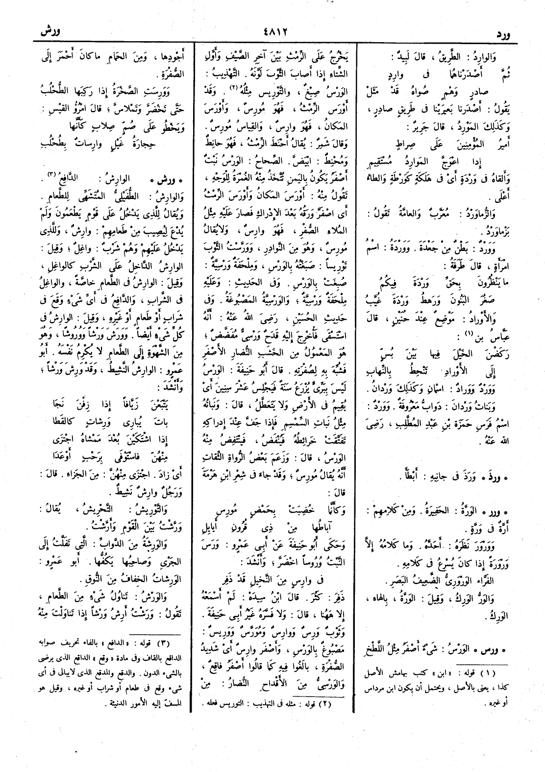 والوارِدُ الطريق قال لبيد ثم أَصْدَرْناهُما في وارِدٍ صادِرٍ وهَمٍ صُواهُ قد مَثَلْ يقول أَصْدَرْنا بَعِيرَيْنا في طريق صادِرٍ وكذلك المَوْرِدُ قال جرير أَمِيرُ المؤمِنينَ على صِراطٍ إِذا اعْوَجَّ المَوارِدُ مُسْتَقِيمُ وأَلقاهُ في وَرْدةٍ أَي في هَلَكَةٍ كَوَرْطَةٍ والطاء أَعلى والزُّماوَرْدُ معرَّب والعامة تقول بَزْماوَرْد ووَرْد بطن من جَعْدَة ووَرْدَةُ اسم امرأَة قال طرفة ما يَنْظُرون بِحَقِّ وَرْدةَ فِيكُمُ صَغُرَ البَنُونَ وَرَهطُ وَرْدَةَ غُيَّبُ والأَورادُ موضعٌ عند حُنَيْن قال عباس بن