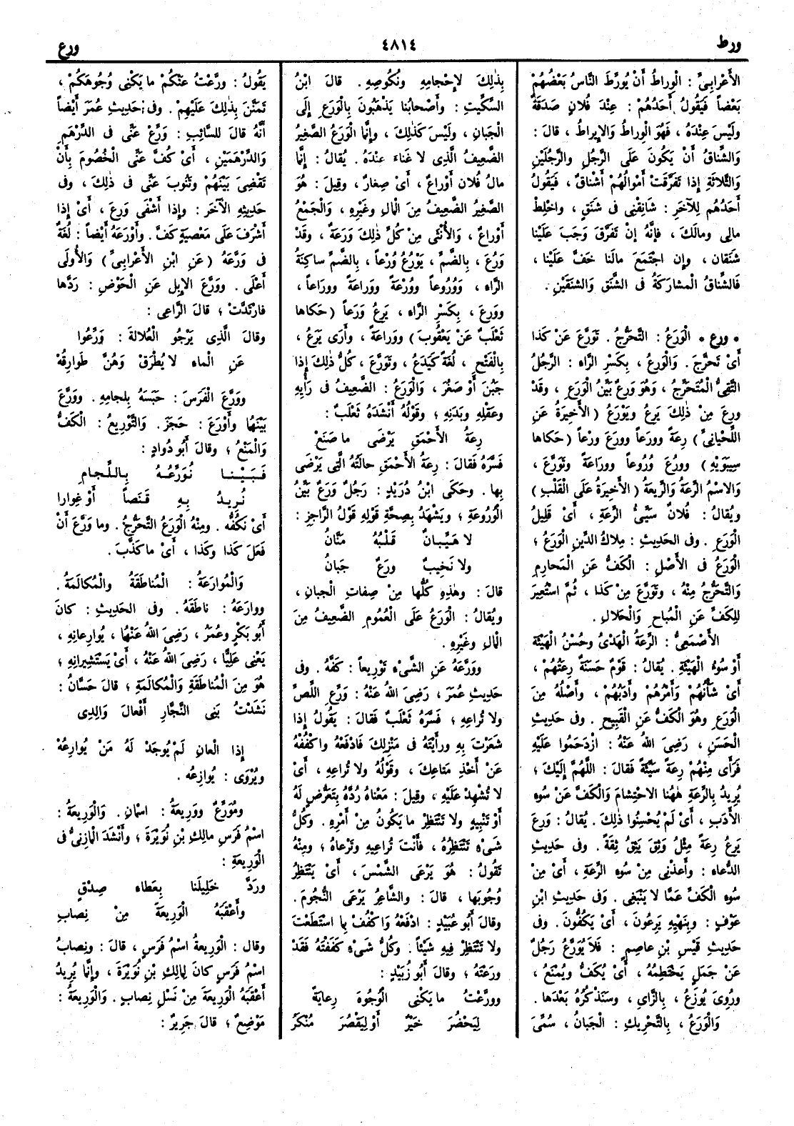 ( ورع ) الوَرَعُ التَّحَرُّجُ تَوَرَّعَ عن كذا أَي تحرَّج والوَرِعُ بكسر الراء الرجل التقي المُتَحَرِّجُ وهو وَرِعٌ بيِّن الورَعِ وقد ورِعَ من ذلك يَرِعُ ويَوْرَعُ الأَخيرة عن اللحياني رِعةً وورَعاً ورْعاً حكاها سيبويه وورُعَ ورُوعاً ووراعة وتَوَرَّعَ والاسم الرِّعةُ والرِّيعةُ الأَخِيرةُ على القلب ويقال فلان سَيءُ الرِّعةِ أَي قليل الورَعِ وفي الحديث مِلاكُ الدِّينِ الورَعُ الورَعُ في الأَصل الكَفّ عن المَحارِمِ والتحَرُّجُ منه وتَوَرَّعَ من كذا ثم استعير للكف عن المباح والحلال الأَصمعي الرِّعةُ الهَدْيُ وحُسْنُ الهيئةِ أَو سُوء الهيئة يقال قوم حَسَنةٌ رِعَتُهم أَي شأْنُهم وأَمْرُهم وأَدَبُهم وأَصله من الوَرَعِ وهو الكَفّ عن القبيح وفي حديث الحسن رضي الله عنه ازْدَحَمُوا عليه فرأَى منهم رِعةً سيِّئةً فقال اللهمّ إِلَيْكَ يريد بالرِّعةِ ههنا الاحْتِشامَ والكَفَّ عن سُوءِ الأَدَبِ أَي لم يُحْسِنُوا ذلك يقال وَرِعَ يَرِعُ رِعةً مثل وَثِقَ يَثِقُ ثِقَةً وفي حديث الدّعاء وأَعِذْني من سُوءِ الرِّعةِ أَي من سُوءِ الكفِّ عما لا يَنْبَغِي وفي حديث ابن عوف وبِنَهْيه يَرِعُون أَي يَكُفُّونَ وفي حديث قيس بن عاصم فلا يُوَرَّعُ رجل عن جمَل يَختطمه أَي يُكَفُّ ويُمْنعُ وروي يُوزَعُ بالزاي وسنذكره بعدها والوَرَعُ بالتحريك الجَبانُ سمي بذلك لإِحْجامِه ونُكُوصه قال ابن السكيت وأَصحابنا يذهبون بالورع إِلى الجبان وليس كذلك وإِنما الورع الصغير الضعيف الذي لا غَناءَ عنده يقال إِنما مال فلان أَوْراع أَي صغار وقيل هو الصغير الضعيف من المال وغيره والجمع أَوْراعٌ والأُنثى من كل ذلكَ وَرَعةٌ وقد وَرُعَ بالضم يَوْرُعُ وُرْعاً بالضم ساكنة الراء وَوُرُوعاً ووُرْعةً ووَراعةً ووَراعاً ووَرِعَ بكسر الراء يَرِعُ وَرَعاً حكاها ثعلب عن يعقوب ووَراعةً وأَرى يَرَعُ بالفتح لغة كَيَدَعُ وتَوَرَّعَ كل ذلك إِذا جَبُنَ أَو صغُر والورَع الضعيف في رأْيه وعقله وبدنه وقوله أَنشده ثعلب رِعةُ الأَحْمَقِ يَرْضَى ما صَنَعْ فسّره فقال رِعةُ الأَحمقِ حالَتُه التي يَرْضَى بها وحكى ابن دُريد رجل وَرَعٌ بَيِّنُ الوُرُوعة ويشهد بصحة قوله قول الراجز لا هَيِّبانٌ قَلْبُه مَنَّانُ ولا نَخِيبٌ ورَعٌ جَبانُ قال وهذه كلها من صفات الجبانِ ويقال الوَرَعُ على العموم الضعيف من المال وغيره وورَّعه عن الشيء تَوْرِيعاً كفَّه وفي حديث عمر رضي الله عنه وَرِّعِ اللِّصَّ ولا تُراعِه فسّره ثعلب فقال يقول إِذا شَعَرْتَ به ورأَيْتَه في مَنْزِلِكَ فادْفَعْه واكْفُفْه عن أَخذ متاعِك وقوله ولا تُراعِه أَي لا تُشْهِدْ عليه وقيل معناه رُدَّه بتعرُّض له أَو تَنْبيه ولا تَنتَظِر ما يكون من أَمره وكل شيء تنتظره فأَنت تراعيه وتَرْعاه ومنه تقول هو يَرْعَى الشمسَ أَي يَنتَظِرُ وُجُوبَها قال والشاعر يَرْعَى النجوم وقال أَبو عبيد ادْفَعْه واكْفُفْ بما اسْتَطَعْتَ ولا تنتظر فيه شيئاً وكل شيء كَفَفْتَه فقد ورعْتَه وقال أَبو زبيد وورَّعْتُ ما يكني الوُجُوهَ رِعايةً ليَحْضُرَ خَيرٌ أَو ليَقْصُرَ مُنْكَرُ يقول ورَّعْتُ عنكم ما يَكْني وجوهكم تَمَنَّنَ بذلك عليهم وفي حديث عمر أَيضاً أَنه قال للسائب وَرِّعْ عني في الدِّرْهَمِ والدِّرهمين أَي كُفَّ عني الخُصومَ بأَن تَقْضِيَ بينهم وتَنُوبَ عني في ذلك وفي حديثه الآخر وإِذا أَشْفَى وَرِعَ أَي إذا أَشْرَفَ على معصية كَفَّ وأَوْرَعَه أَيضاً لغة في وَرَّعَه عن ابن الأَعرابي والأُولى أَعْلى ووَرَّعَ الإِبلَ عن الحَوْضِ رِدَّها فارْتَدَّتْ قال الراعي وقال الذي يَرْجُو العُلالةَ وَرِّعوا عن الماء لا يُطْرَقْ وَهُنَّ طَوارِقُهْ ووَرَّعَ الفرَسَ حَبَسَه بلجامه ووَرَّعَ بينهما وأَوْرَعَ حَجَزَ والتوْرِيعُ الكَفُّ والمَنْعُ وقال أبو دواد فَبَيْنا نُوَرِّعُهُ باللِّجام نُرِيدُ به قَنَصاً أَو غِوارا أَي نَكُفُّه ومنه الوَرَعُ التحرُّجُ وما وَرَّعَ أَن فَعَ