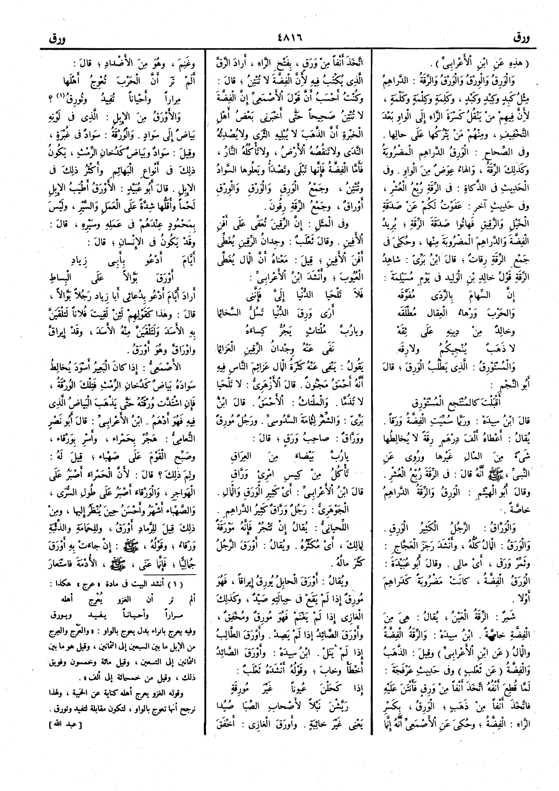 هذه عن ابن الأَعرابي والوَرِقُ والوِرْقُ والوَرْقُ والرِّقَةُ الدراهم مثل كَبِدٍ وكِبْدٍ وكَبْدٍ وكَلِمة وكِلْمة وكَلْمةٍ لأن فيهم من ينقل كسرة الراء إلى الواو بعد التخفيف ومنهم من يتركها على حالها وفي الصحاح الوَرِقُ الدراهم المضروبة وكذلك الرقةُ والهاء عوض من الواو وفي الحديث في الزكاة في الرِّقِة ربع العشر وفي حديث آخر عَفَوْتُ لكم عن صدقة الخيل والرقيق فهاتوا صدقة الرِّقَةِ يريد الفضة والدراهمَ المضروبة منها وحكي في جمع الرِّقة رِقَات قال ابن بري شاهد الرِّقة قول خالد بن الوليد في يوم مسيلمة إن السِّهام بالرَّدَى مُفَوَّقَه والحَرْب وَرْهاء العِقال مُطْلَقة وخالد من دينه على ثِقَهْ لا ذَهَبٌ يُنْجِيكُمُ ولا رِقَه والمُسْتَوْرِقُ الذي يطلب الوَرِقَ قال أَبو النجم أَقْبَلْت كالمُنْتَجِع المُسْتَوْرِق قال ابن سيده وربما سميت الفضة وَرَقاً يقال أَعطاه أَلف درهم رِقَة لا يخالطها شيءٌ من المال غيرها وروي عن النبي صلى الله عليه وسلم أنه قال في الرِّقِة ربع العشر وقال أَبو الهيثم الوَرِقُ والرِّقَةُ الدراهم خاصة والوَرَّاقُ الرجل الكثير الوَرِق والوَرَقُ المال كله وأَنشد رجز العجاج وثَمِّرْ وَرَقي أي مالي وقال أَبو عبيدة الوَرَقُ الفضة كانت مضروبة كدراهم أو لا شمر الرِّقةُ العين يقال هي من الفضة خاصةً ابن سيده والرِّقَةُ الفضة والمال عن ابن الأعرابي وقيل الذَّهَب والفضة عن ثعلب وفي حديث عَرْفجة لما قطع أنفه اتخذ أَنفاً من وَرِقٍ فأَنتن عليه فاتخذ أَنفاً من ذَهَب الوَرِقُ بكسر الراء الفضة وحكي عن الأَصمعي أنه إنما اتخذ أَنفاً من وَرَقٍ بفتح الراء أَراد الرَّقَّ الذي يكتب فيه لأن الفضة لا تنتن قال وكنت أَحسب أَن قول الأصمعي إن الفضة لا تنتن صحيحاً حتى أَخبرني بعض أَهل الخبرة أن الذهب لا يُبْلِيه الثَّرَى ولا يُصْدئه النَّدَى ولا تَنقُصُه الأرض ولا تأْكله النار فأَما الفضة فإنها تَبْلى وتَصْدَأُ ويعلوها السواد وتُنْتِنُ وجمع الوَرِقِ والوَرْق والوِرْقِ أَوْراق وجمْع الرِّقَة رِقُونَ وفي المثل إن الرِّقِين تُعَفِّي على أَفْنِ الأَفِينِ وقال ثعلب وِجْدانُ الرِّقِين يغطي أَفْن الأَفِينِ قيل معناه أَن المال يغطي العيوب وأَنشد ابن الأعرابي فلا تَلْحَيا الدنيا إليَّ فإنني أَرى ورق الدُّنْيا تَسُلُّ السَّخائما ويا رُبَّ مُلْتاثٍ يَجُرُّ كساءَه نَفَى عنه وِجْدان الرِّقين العَزائما يقول يَنْفِي عنه كثرةُ المال عزائمَ الناس فيه أَنه أَحمق مجنون قال الأَزهري لا تَلْحَيا لا تذمَّا والمُلْتاث الأحمق قال ابن بري والشعر لثمامة السَّدوسي ورجل مُورقٌ ووَرَّاق صاحب وَرَقٍ قال يا رُبَّ بَيْضاءَ من العِرَاقِ تأْكل من كِيس امْرئٍ وَرَّاقِ قال ابن الأَعرابي أَي كثير الوَرَقِ والمالِ الجوهري رجل وَرَّاق كثير الدراهم اللحياني يقال إن تَتْجُرْ فإنه مَوْرَقةٌ لمالك أي مُكَثِّره ويقال أَوْرَق الرجل كثر ماله ويقال أَوْرَقَ الحابلُ يُورِقُ إيراقاً فهو مورق إذا لم يقع في حِبالته صيد وكذلك الغازي إذا لم يَغْنَم فهو مُورِقٌ ومُخْفِقٌ وأَوْرَق الصائد إذا لم يَصِدْ وأَوْرَق الطالب إذا لم يَنَلْ ابن سيده وأَوْرَقَ الصائد أَخطأَ وخاب وقوله أَنشده ثعلب إذا كَحَلْنَ عيوناً غيرَ مُورِقةٍ رَيَّشْنَ نَبْلاً لأَصحاب الصِّبَا صُيُدا يعني غير خائة وأَورَقَ الغازِي أَخْفَقَ وغَنِمَ وهو من الأضداد قال ألم تَرَ أَنَّ الحَرْب تُعْوِجُ أَهْلَها مِراراً وأحياناً تُفِيدُ وتورقُ ؟ والأَوْرَقُ من الإبل الذي في لونه بياض إلى سواد والوُرْقَةُ سواد في غُبْرة وقيل سواد وبياض كدخان الرِّمْثِ يكون ذلك في أَنواع البهائم وأَكثر ذلك في الإبل قال أَبو عبيد الأوْرَقُ أطيب الإبل لحماً وأَقلها شدةً على العمل والسير وليس بمحمود عندهم في عمله وسيره قال وقد يكون في الإنسان قال أَيّامَ أَدعو بأَبِي زِياد أَوْرَقَ بَوَّالاً على البَِساط أَراد أَيام أدعو بدعائي أبا زياد رجلاً بَوَّال
