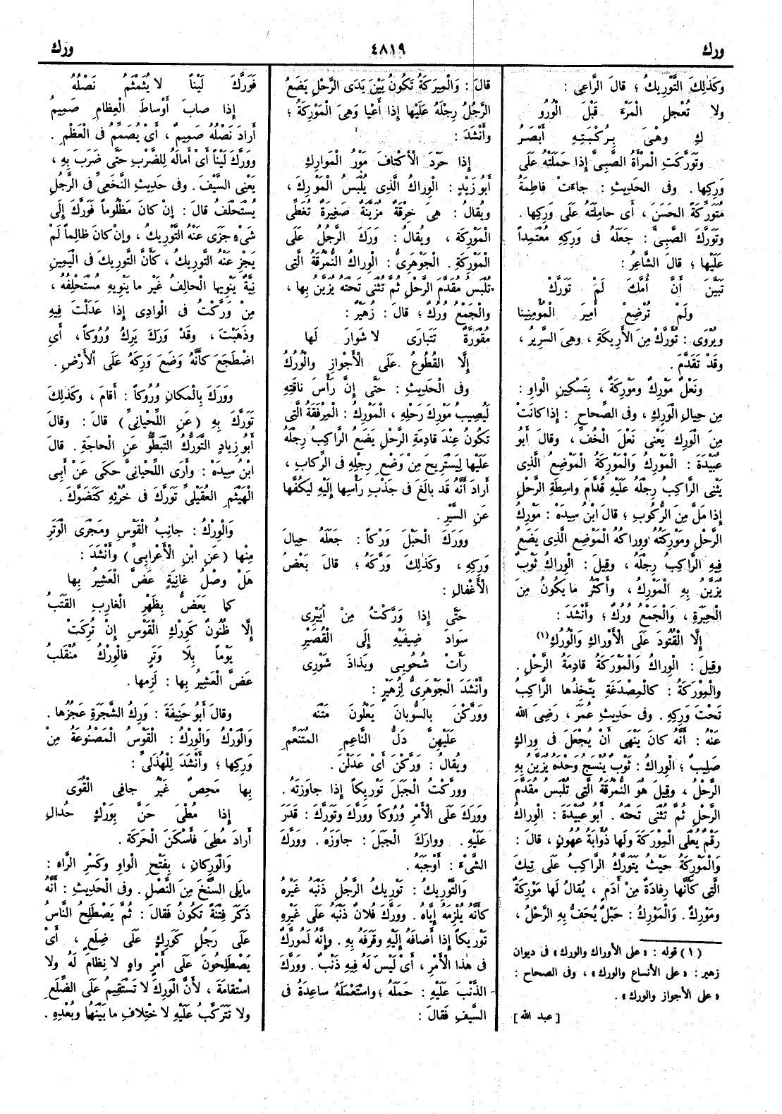 وفي الحديث حتى إِن رأْس ناقته لتُصِيبُ مَوْرِكَ رَحْله المَوْرِكُ المِرْفَقَة التي تكون عند قادِمةِ الرحل يَضعُ الراكب رجله عليها ليستريح من وضع رجله في الركاب أَراد أَنه قد بالغ في جذب رأْسها إِليه ليكفها عن السير ووَرَك الحَبْلَ وَرْكاً جعله حِيالَ وَرِكه وكذلك وَرَّكَه قال بعض الأَغْفال حتى إِذا وَرَّكْتُ من أُيَيْرِي سَوادَ ضِيفَيْهِ إِلى القُصَيْرِ رَأَتْ شُحوبي وبَذاذَ شَوْرِي وأَنشد الجوهري لزهير ووَرَّكْنَ بالسُّوبان يَعلونَ مَتْنَه عليهنَّ دَلُّ الناعِمِ المُتَنَعِّمِ ويقال وَرَّكْنَ أَي عَدَلْنَ وورَّكت الجبلَ توركاً إِذا جاوزته ووَرَكَ على الأَمر وُروكاً ووَرَّكَ وتَوَرَّك قَدَر عليه ووارَكَ الجبل جاوزه ووَرَّك الشيء أَوجبه والتَّوْرِيكُ تَوْرِيكُ الرجل ذنبه غيره كأَنه يُلْزِمُه إِياه ووَرَّكَ فلان ذنبه على غيره تَوْريكاً إِذا أَضافه إِليه وقَرَفَه به وإِنه لمُوَرِّكٌ في هذا الأَمر أَي ليس له فيه ذنب ووَرَّكَ الذنبَ عليه حَمَلَه واستعمله ساعدةُ في السيف فقال فَوَرَّكَ لَيْناً لا يُثَمْثَمُ نَصْلُه إِذا صابَ أَوساطَ العِظامِ صَميمُ أَراد نَصْلُه صميمٌ أَي يُصَمِّمُ في العظم ووَرَّكَ ليناً أَي أَماله للضرب حتى ضرب به يعني السيف وفي حديث النخعي في الرجل يُسْتَحْلَف قال إِن كان مظلوماً فَوَرَّكَ إِلى شيء جزى عنه التَّوْرِيك وإِن كان ظالماً لم يَجْز عنه التوريك كأَنَّ التوريكَ في اليمين نية ينويها الحالف غير ما ينويه مُسْتَحْلِفُه من وَرَّكْتُ في الوادي إِذا عدلت فيه وذهبت وقد وَرَكَ يَرِكُ وُروكاً أَي اضطجع كأَنه وضع وَرِكه على الأَرض ووَرَكَ بالمكان وُروكاً أَقام وكذلك تَوَرَّك به عن اللحياني قال وقال أَبو زياد التَّوَرُّك التّبَطُّؤُ عن الحاجة قال ابن سيده وأَرى اللحياني حكى عن أَبي الهيثم العُقَيْليّ تَوَرَّكَ في خُرْئِه كتَضَوَّكَ والوِرْكُ جانب القوس ومَجْرى الوَتَرِ منها عن ابن الأَعرابي وأَنشد هل وصَلُ غانيةٍ عَضَّ العَشيرُ بها كما يَعَضُّ بظَهْرِ الغارِبِ القَتَبُ إِلاَّ ظُنونٌ كوِرْكَ القَوْس إِن تُرِكت يوماً بلا وَتَرٍ فالوِرْكُ مُنْقَلبُ عَضَّ العشيرُ بها لزمها وقال أَبو حنيفة وَرِكُ الشجرة عَجُزها والوَرْكُ والوِرْك القَوْسُ المصنوعة من وَرِكها وأَنشد للهذلي بها مَحِصٌ غيرُ جافي القُوَى إِذا مُطْيَ حَنَّ بِوَرْكٍ حُدالْ أَراد مُطِيَ فأَسكن الحركة والوَرِكانِ بفتح الواو وكسر الراء ما يلي السِّنْخَ من النَّصْل وفي الحديث أَنه ذكر فتنة تكون فقال ثم يصطلح الناس على رجل كوَرِكٍ على ضِلع أَي يصطلحون على أَمر واهٍ لا نظام له ولا استقامة لأَن الوَرِكَ لا يستقيم على الضلع ولا يتركب عليه لاختلاف ما بينهما وبُعده