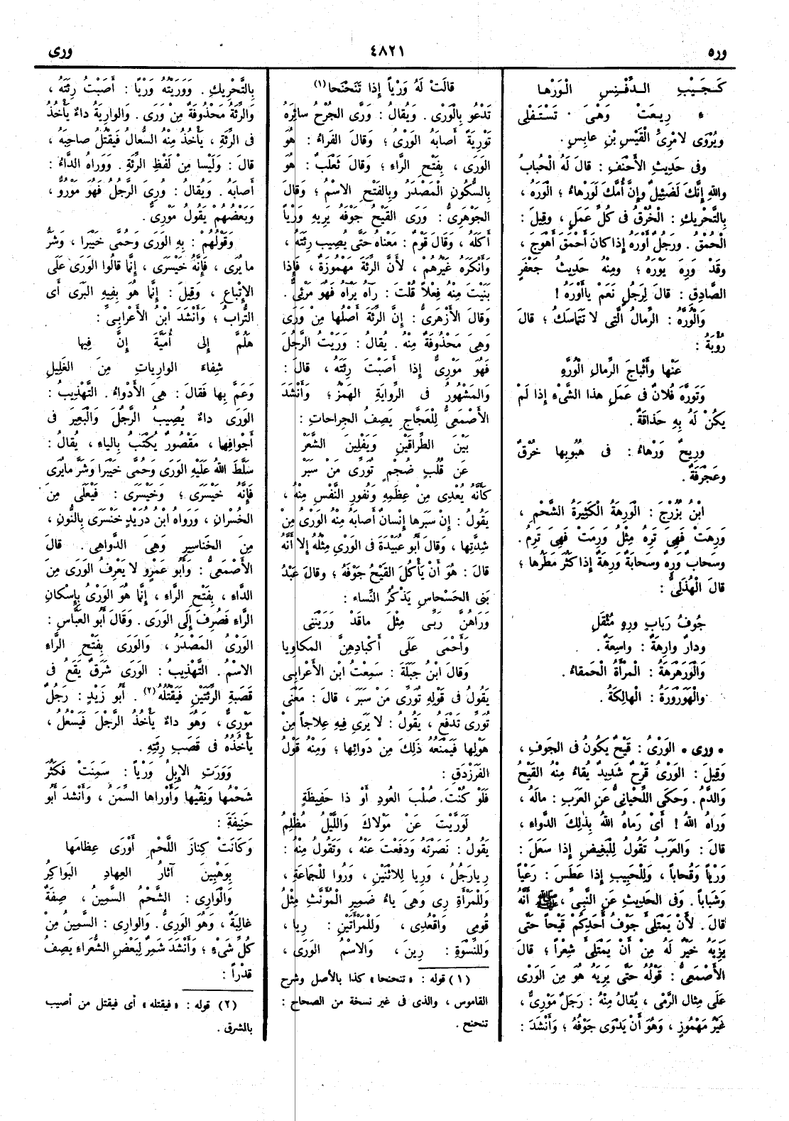 ( * قوله فيقتله أي فيقتل من أصيب بالشرق ) أَبو زيد رجل مَوْرِيٌّ وهو داء يأْخذ الرجل فيَسْعُلُ يأْخذه في قصب رِئته وَوَرَتِ الإِبلُ وَرْياً سَمِنَتْ فكثر شحمها ونِقْيها وأَوْراها السِّمَن وأَنشد أَبو حنيفة وكانَتْ كِنازَ اللحمِ أَورَى عِظامَها بِوَهْبِينَ آثارُ العِهادِ البَواكِر والواري الشحم السَّمينُ صفة غالبة وهو الوَرِيُّ والوارِي السمين من كل شيء وأَنشد شمر لبعض الشعراء يصف قِدْراً