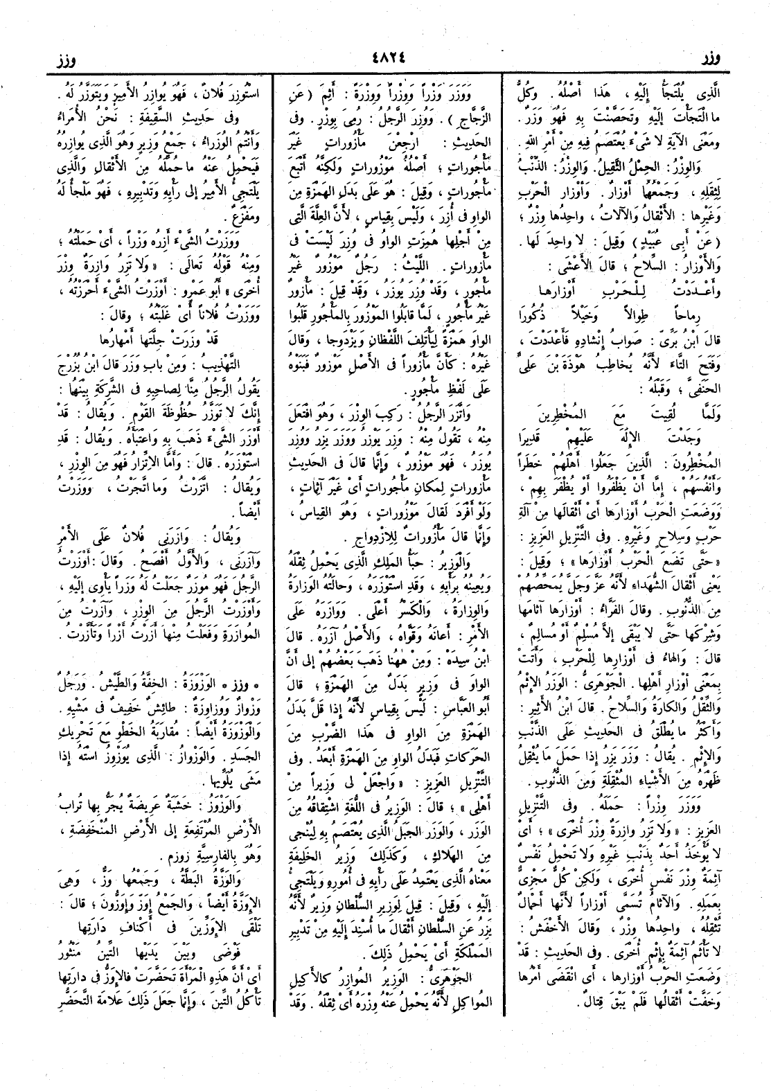 الذي يُلْتَجَأُ إِليه هذا أَصله وكل ما الْتَجَأْتَ إِليه وتحصنت به فهو وَزَرٌ ومعنى الآية لا شيء يعتصم فيه من أَمر الله والوِزْرُ الحِمْلُ الثقيل والوِزْرُ الذَّنْبُ لِثِقَلهِ وجمعهما أَوْزارٌ وأَوْزارُ الحرب وغيرها الأَثْقالُ والآلات واحدها وِزرٌ عن أَبي عبيد وقيل لا واحد لها والأَوْزارُ السلاح قال الأَعشى وأَعْدَدْت للحربِ أَوْزارَها رِماحاً طِوالاً وخَيْلاً ذُكُورَا قال ابن بري صواب إِنشاده فأَعددتَ وفتح التاء لأَنه يخاطب هَوْذةَ بن علي الحنفي وقبله ولما لُقِيتَ مع المُخْطِرِين وَجَدْتَ الإِلهَ عليهم قَدِيرَا المخطرون الذين جعلوا أَهلهم خَطَراً وأَنفسهم إِما أَن يظفروا أَو يظفر بهم ووضعت الحربُ أَوْزارَها أَي أَثقالها من آلة حرب وسلاح وغيره وفي التنزيل العزيز حتى تَضَعَ الحربُ أَوْزارَها وقيل يعني أَثقال الشهداء لأَنه عز وجل يُمَحِّصُهم من الذنوب وقال الفراء أَوزارها آثامها وشِرْكها حتى لا يبقى إِلا مُسْلم أَو مُسالم قال والهاء في أَوزارها للحرب وأَتت بمعنى أَوزار أَهلها الجوهري الوَزَرُ الإِثم والثِّقْلُ والكارَةُ والسلاحُ قال ابن الأَثير وأَكثر ما يطلق في الحديث على الذنب والإِثم يقال وَزَرَ يَزِرُ إِذا حمل ما يُثْقِلُ ظهرَه من الأَشياء المُثْقِلَةِ ومن الذنوب ووَزَرَ وِزْراً حمله وفي التنزيل العزيز ولا تَزِرُ وازرَةٌ وِزْرَ أُخرى أَي لا يؤخذ أَحد بذنب غيره ولا تحملُ نفسٌ آثمةٌ وِزْرَ نَفْسٍ أُخرى ولكن كلٌّ مَجْزِيٌّ بعلمه والآثام تسمى أَوْزاراً لأَنها أَحمال تُثْقِلُه واحدها وِزْرٌ وقال الأَخفش لا تأْثَمُ آثِمَةٌ بإِثم أُخرى وفي الحديث قد وضعت الحرب أَوزارها أَي انقى أَمرها وخفت أَثقالها فلم يبق قتال ووَزَرَ وَزْراً ووِزْراً وَوِزْرَةً أَثم عن الزجاج وَوُزِرَ الرجلُ رُمِيَ بِوِزْرٍ وفي الحديث ارْجِعْنَ مأْزُورات غير مأْجورات أَصله موْزورات ولكنه أَتبع مأْجورات وقيل هو على بدل الهمزة من الواو في أُزِرَ وليس بقياس لأَن العلة التي من أَجلها همزت الواو في وُزِرَ ليست في مأْزورات الليث رجل مَوْزُورٌ غير مأْجور وقد وُزِرَ يُوزَرُ وقد قيل مأْزور غير مأْجور لما قابلوا الموزور بالمأْجور قلبوا الواو همزة ليأْتلف اللفظان ويَزْدَوِجا وقال غيره كأَن مأْزوراً في الأَصل مَوْزُورٌ فَبَنَوْه على لفظ مأْجور واتَّزَرَ الرجلُ رَكِبَ الوِزْرَ وهو افْتَعَلَ منه تقول منه وَزِرَ يَوْزرُ ووَزَرَ يَزِرُ ووُزِرَ يُوزَرُ فهو موزورٌ وإِنما قال في الحديث مأْزورات لمكان مأْجورات أَي غير آثمات ولو أَفرد لقال موزورات وهو القياس وإِنما قال مأْزورات للازدواج والوَزِيرُ حَبَأُ المَلِكِ الذي يحمل ثِقْلَه ويعينه برأْيه وقد اسْتَوْزَرَه وحالَتُه الوَزارَةُ والوِزارَةُ والكسر أَعلى ووَازَرَه على الأَمر أَعانه وقوّاه والأَصل آزره قال ابن سيده ومن ههنا ذهب بعضهم إِلى أَن الواو في وزير بدل من الهمزة قال أَبو العباس ليس بقياس لأَنه إِذا قل بدل الهمزة من الواو في هذا الضرب من الحركات فبدل الواو من الهمزة أَبعد وفي التنزيل العزيز واجْعَلْ لي وَزيراً من أَهلي قال الوزير في اللغة استقاقه من الوَزَرِ والوَزَرُ الجبلُ الذي يعتصم به ليُنْجى من الهلاك وكذلك وَزِيرُ الخليفة معناه الذي يعتمد على رأْيه في أُموره ويلتجئ إِليه وقيل قيل لوزير السلطان وَزِيرٌ لأَنه يَزِرُ عن السلطان أَثْقال ما أُسند إِليه من تدبير المملكة أَي يحمل ذلك الجوهري الوَزِيرُ المُوازِرُ كالأَكِيلِ المُواكِلِ لأَنه يحمل عنه وِزْرَه أَي ثقله وقد اسْتُوزِرَ فلان فهو يُوازِرُ الأَمير ويَتَوَزَّرُ له وفي حديث السَّقِيفة نحن الأُمراء وأَنتم الوزراء جمع وزير وهو الذي يُوازِرُه فيحمل عنه ما حُمِّلَه من الأَثقال والذي يلتجئ الأَمير إِلى رأْيه وتدبيره فهو ملجأٌ له ومَفْزَعٌ ووَزَرْتُ الشيءَ أَزِرُه وزْراً أَي حملته ومنه قوله تعالى ولا تَزِرُ وازِرَةٌ وِزْرَ أُخرى أَبو عمرو أَوْزَرْتُ ا