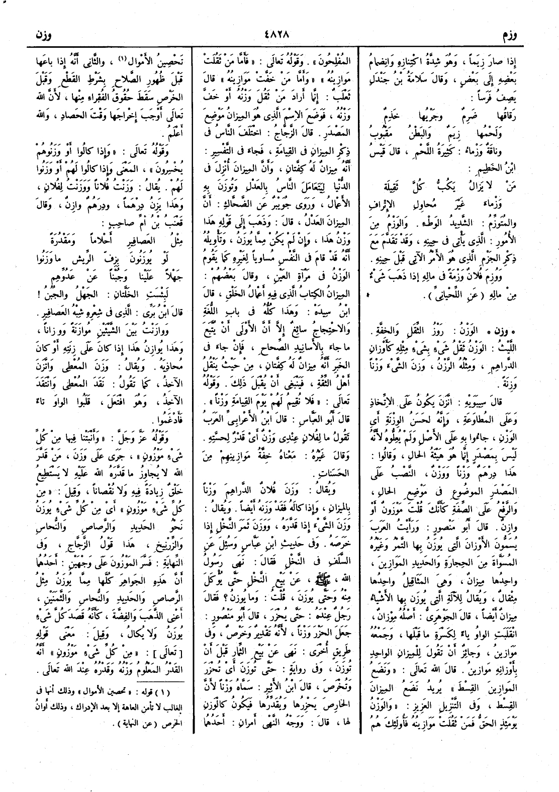 ( * قوله « تحصين الأموال » وذلك أنها في الغالب لا تأمن العاهة إلا بعد الادراك وذلك أوان الخرص ) والثاني أَنه إِذا باعها قبل ظهور الصَّلاح بشرط القطع وقبل الخَرْص سقط حقوق الفقراء منها لأَن الله تعالى أَوجب إِخراجها وقت الحصاد والله أَعلم وقوله تعالى وإِذا كالُوهُمْ أَو وَزَنُوهُمْ يُخْسِرُونَ المعنى وإِذا كالوا لهم أَو وَزَنُوا لهم يقال وَزَنْتُ فلاناً ووَزَنْتُ لفلان وهذا يَزِنُ درهماً ودرهمٌ وازِنٌ وقال قَعْنَبُ بن أُمِّ صاحب مثْل العَصافير أَحْلاماً ومَقْدُرَةً لو يُوزَنُون بِزِفّ الرِيش ما وَزَنُوا جَهْلاً علينا وجُبْناً عن عَدُوِّهِم لبِئْست الخَلَّتانِ الجَهْلُ والجُبُنُ قال ابن بري الذي في شعره شبه العصافير ووازَنْتُ بين الشيئين مُوَازَنَةً ووِزاناً وهذا يُوازِنُ هذا إِذا كان على زِنَتِه أَو كان مُحاذِيَهُ ويقال وَزَنع المُعْطِي واتَّزَنَ الآخِذُ كما تقول نَقَدَ المُعْطِي وانْتَقَد الآخذُ وهو افتعل قلبوا الواو تاء فأَدغموا وقوله عز وجل وأَنبتنا فيها من كل شيء مَوْزونٍ جرى على وَزَنَ مَنْ قَدّر اللهُ لا يجاوز ما قدَّره الله عليه لا يستطيع خَلْقٌ زيادةٌ فيه ولا نقصاناً وقيل من كل شيء مَوْزونٍ أَي من كل شيء يوزن نحو الحديد والرَّصاص والنحاس والزِّرْنيخ هذا قول الزجاج وفي النهاية فَسَّرَ المَوْزونَ على وجهين أَحدهما أَن هذه الجواهر كلَّها مما يوزَنُ مثل الرصاص والحديد والنُّحاس والثَّمَنَيْنِ أَعني الذهب والفضة كأَنه قصد كل شيء يُوزَنُ ولا يكال وقيل معنى قوله من كل شيء مَوْزُونٍ أَنه القَدْرُ المعلوم وَزْنُه وقَدْرُه عند الله تعالى