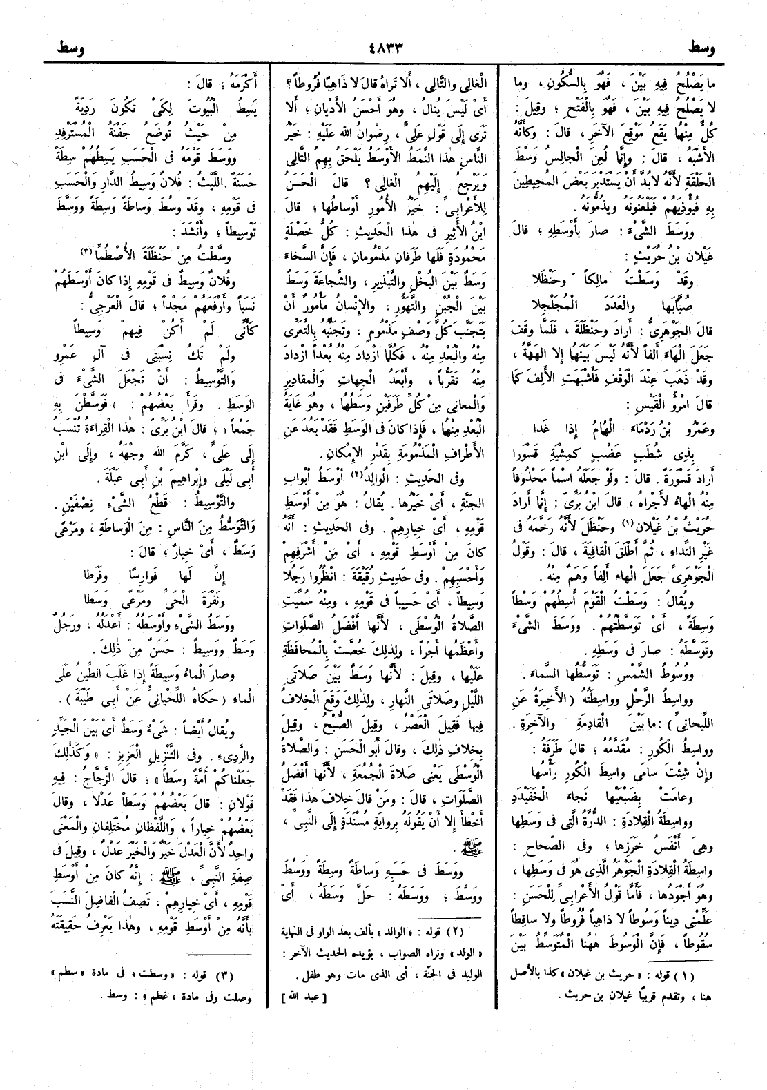 ( * قوله « حريث بن غيلان » كذا بالأصل هنا وتقدم قريباً غيلان ابن حريث ) وحنظل لأَنه رَخَّمه في غير النداء ثم أَطلق القافية قال وقول الجوهري جعل الهاء أَلِفاً وهمٌ منه ويقال وسَطْتُ القومَ أَسِطُهم وَسْطاً وسِطةً أَي تَوَسَّطْتُهم ووَسَطَ الشيءَ وتَوَسَّطَه صار في وسَطِه ووُسُوطُ الشمس توَسُّطُها السماء وواسِطُ الرَّحْل وواسِطَتُه الأَخيرة عن اللحياني ما بين القادِمةِ والآخِرة وواسِطُ الكُورِ مُقَدَّمُه قال طرفة وإِنْ شِئت سامى واسِطَ الكُورِ رأْسُها وعامَتْ بِضَبْعَيْها نَجاء الخَفَيْدَدِ وواسِطةُ القِلادة الدُّرَّة التي وسَطها وهي أَنْفَس خرزها وفي الصحاح واسِطةُ القلادة الجَوْهَرُ الذي هو في وَسطِها وهو أَجودها فأَما قول الأَعرابي للحسن عَلَّمني دِيناً وَسُوطاً لا ذاهِباً فُرُوطاً ولا ساقِطاً سُقُوطاً فإِن الوَسُوط ههنا المُتَوَسِّطُ بين الغالي والتَّالي أَلا تراه قال لا ذاهباً فُرُوطاً ؟ أَي ليس يُنال وهو أَحسن الأَديان أَلا ترى إِلى قول عليّ رضوان اللّه عليه خير الناس هذا النمَطُ الأَوْسَط يَلْحق بهم التَّالي ويرجع إِليهم الغالي ؟ قال الحسن للأَعرابي خيرُ الأُمور أَوْساطُها قال ابن الأَثير في هذا الحديث كلُّ خَصْلة محمودة فلها طَرَفانِ مَذْمُومان فإِن السَّخاء وسَطٌ بين البُخل والتبذير والشجاعةَ وسَط بين الجُبن والتهوُّر والإِنسانُ مأْمور أَن يتجنب كل وصْف مَذْمُوم وتجنُّبُه بالتعَرِّي منه والبُعد منه فكلَّما ازداد منه بُعْداً ازداد منه تقرُّباً وأَبعدُ الجهات والمقادير والمعاني من كل طرفين وسَطُهما وهو غاية البعد منهما فإِذا كان في الوسَط فقد بَعُد عن الأَطراف المذمومة بقدر الإِمكان وفي الحديث الوالِد أَوْسَطُ أَبواب الجنة أَي خيرُها يقال هو من أَوسَطِ قومِه أَي خيارِهم وفي الحديث أَنه كان من أَوْسَطِ قومه أَي من أَشْرَفِهم وأَحْسَبِهم وفي حديث رُقَيْقةَ انظُروا رجلاً وسِيطاً أَي حَسِيباً في قومه ومنه سميت الصلاة الوُسْطَى لأَنها أَفضلُ الصلوات وأَعظمها أَجْراً ولذلك خُصت بالمُحافَظةِ عليها وقيل لأَنها وسَط بين صلاتَيِ الليل وصلاتَيِ النهار ولذلك وقع الخلاف فيها فقيل العصر وقيل الصبح وقيل بخلاف ذلك وقال أَبو الحسن والصلاة الوسطى يعني صلاة الجمعة لأَنها أَفضلُ الصلواتِ قال ومن قال خلافَ هذا فقد أَخْطأَ إِلا أَن يقوله برواية مُسنَدة إِلى النبي صلّى اللّه عليه وسلّم ووَسَطَ في حَسَبِه وَساطة وسِطةً ووَسُطَ ووسَّط ووَسَطَه حَلَّ وَسَطَه أَي أَكْرَمَه قال يَسِطُ البُيوتَ لِكي تكون رَدِيّةً من حيثُ تُوضَعُ جَفْنةُ المُسْتَرْفِدِ ووَسَطَ قومَه في الحسَبِ يَسِطُهم سِطةً حسنَة الليث فلان وَسِيطُ الدارِ والحسَبِ في قومه وقد وسُطَ وَساطةً وسِطةً ووَسَّطَ توْسِيطاً وأَنشد وسَّطْت من حَنْظَلةَ الأُصْطُمّا وفلان وسِيطٌ في قومه إِذا كان أَوسطَهم نسَباً وأَرْفعَهم مَجْداً قال العَرْجِيُّ كأَنِّي لم أَكُنْ فيهم وسِيطاً ولم تَكُ نِسْبَتي في آلِ عَمْرِ والتوْسِيطُ أَن تجعل الشيء في الوَسَط وقرأَ بعضهم فوَسَّطْنَ به جمعاً قال ابن بري هذه القراءة تُنسب إِلى عليّ كرّم اللّه وجهه وإِلى ابن أَبي ليلى وإِبراهيم بن أَبي عَبْلَةَ والتوْسِيطُ قَطْعُ الشيء نصفين والتَّوَسُّطُ من الناس من الوَساطةِ ومَرْعىً وسَطٌ أَي خِيار قال إِنَّ لها فَوارِساً وفَرَطا ونَفْرَةَ الحَيِّ ومَرْعىً وَسَطا ووَسَطُ الشيءِ وأَوْسَطُه أَعْدَلُه ورجل وَسَطٌ ووَسِيطٌ حسَنٌ من ذلك وصار الماءُ وَسِيطةً إِذا غلَب الطينُ على الماء حكاه اللحياني عن أَبي طَيْبة ويقال أَيضاً شيءٌ وَسَطٌ أَي بين الجَيِّدِ والرَّدِيء وفي التنزيل العزيز وكذلك جَعَلْناكم أُمّة وسَطاً قال الزجاج فيه قولان قال بعضهم وسَطاً عَدْلاً وقال بعضهم خِياراً واللفظان مختلفان والمعنى واحد لأَن العَدْل خَيْر والخير عَدْلٌ وقيل في صفة النبي صلّى اللّه عليه وسلّم إِنه كان من أَوْسَطِ قوم