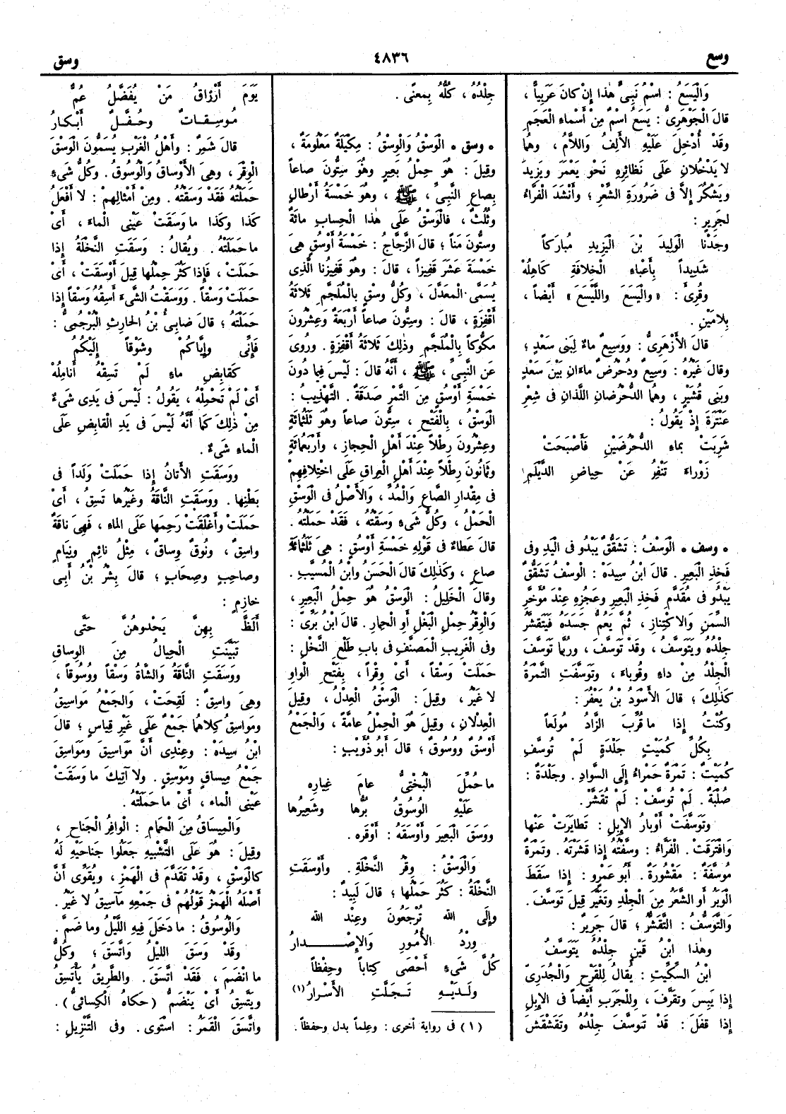 ( وسق ) الوَسْقُ والوِسْقُ مِكْيَلَة معلومة وقيل هو حمل بعير وهو ستون صاعاً بصاع النبي صلى الله عليه وسلم وهو خمسة أَرطال وثلث فالوسْقُ على هذا الحساب مائة وستون مَناً قال الزجاج خمسة أَوسق هي خمسة عشر قَفِيزاً قال وهو قَفِيزُنا الذي يسمى المعدّل وكل وَسْق بالمُلَجَّم ثلاثة أَقْفِزَةٍ قال وستون صاعاً أَربعة وعشرون مكُّوكاً بالمُلَجَّم وذلك ثلاثة أَقفِزَةٍ وروي عن النبي صلى الله عليه وسلم أَنه قال ليس فيما دون خمسة أَو سُقٍ من التمر صدقة التهذيب الوَسْقُ بالفتح ستون صاعاً وهو ثلاثمائة وعشرون رطلاً عند أهل الحجاز وأَربعمائة وثمانون رطلاً عند أَهل العراق على اختلافهم في مقدار الصاع والمُدِّ والأَصل في الوَسْق الحَمْل وكل شيء وسَقَتْه فقد حملته قال عطاء في قوله خمسة أَوْسُقٍ هي ثلاثمائة صاع كذلك قال الحسن وابن المسيب وقال الخليل الوَسْق هو حِمْل البعير والوِقْرُ حمل البغل أَو الحمار قال ابن بري وفي الغريب المصنف في باب طلع النخل حَمَلت وَسْقاً أَي وِقْراً بفتح الواو لا غير وقيل الوَسْق العِدْل وقيل العِدْلان وقيل هو الحِملُ عامة والجمع أوْسُقٌ ووُسوق قال أَبو ذؤيب ما حُمِّلَ البُخْتِيُّ عامَ غِيارِه عليه الوُسُوقُ بُرُّها وشَعِيرُها ووَسَقَ البعيرَ وأَوْسَقه أَوْقَره والوَسْقُ وَقْر النخلة وأَوْسَقَت النخلةُ كثر حَمْلها قال لبيد وإلى الله تُرْجَعون وعند الْ لمَه وِرْدُ الأُمور والإصدارُ كلَّ شيء أَحْصَى كتاباً وحِفْظاً ولَدَيْهِ تَجَلَّت الأَسْرارُ
