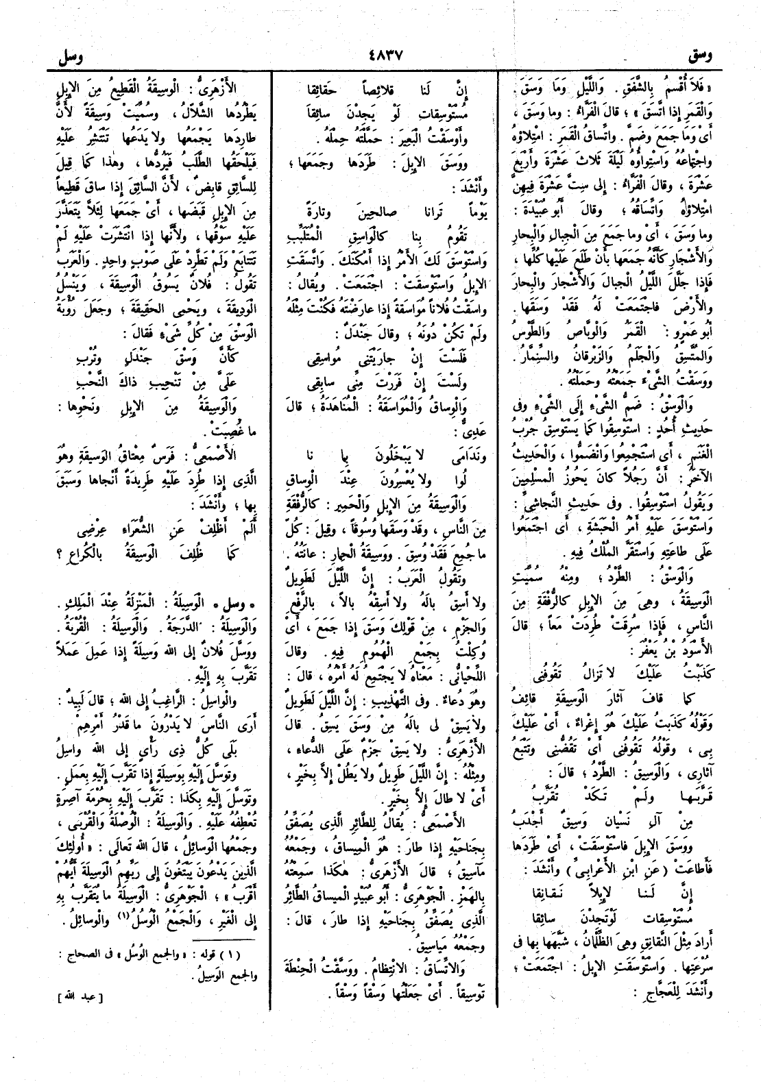 فلا أُقسم بالشَّفَق والليل وما وَسَق والقمر إذا اتَّسَق قال الفراء وما وسَقَ أَي وما جمع وضم واتَّساقُ القمر امتلاؤه واجتماعه واستواؤه ليلة ثلاث عشرة وأَربع عشرة وقال الفراء إلى ست عشرة فيهن امتلاؤه واتِّسَاقه وقال أَبو عبيدة وما وَسَقَ أَي وما جمع من الجبال والبحار والأشجار كأنه جمعها بأَن طلع عليها كلِّها فإذا جَلَّلَ الليلُ الجبال والأَشجار والبحار والأَرض فاجتمعت له فقد وَسَقَها أَبو عمرو القمر والوَبَّاص والطَّوْس والمُتَّسِق والجَلَمُ والزِّبْرقان والسِّنِمَّارُ ووَسَقْت الشيءَ جمعته وحملته والوَسْق ضم الشيء إلى الشيء وفي حديث أُحُد اسْتَوسِقُوا كما يَسْتَوْسِق جُرْبُ الغنم أَي استجمعوا وانضموا والحديث الآخر أَن رجلاً كان يَجوز المسلمين ويقول اسْتَوسِقُوا وفي حديث النجاشي واسْتَوْسَقَ عليه أَمْرُ الحَبَشة أَي اجتمعوا على طاعته واستقر الملك فيه والوَسْقُ الطرد ومنه سميت الوَسِيقةُ وهي من الإبل كالرُّفْقة من الناس فإذا سُرِقَتْ طُرِدت معاً قال الأَسود بن يَعْفُر كَذَبْت عَلَيْكَ لا تزال تَقُوفُني كما قافَ آثارَ الوَسيقةِ قائفُ وقوله كذبت عليك هو إغراء أَي عليك بي وقوله تقوفني أَي تَقُضُّني وتتبع آثاري والوَسِيقُ الطَّرْد قال قَرَّبها ولم تَكَدْ تُقَرَّب من آل نَسْيان وَسِيقٌ أَجدب ووَسَق الإبلَ فاسْتَوْسقت أَي طردها فأَطاعت عن ابن الأَعرابي وأَنشد إنَّ لنا لإبلاً نَقانِقا مُسْتَوسْقاتٍ لو تجدْنَ سائقا أَراد مثل النَّقانِق وهي الظِّلْمانُ شبهها بها في سرعتها واسْتَوْسَقت الإبل اجتمعت وأَنشد للعجاج إنَّ لنا قلائصاً حقَائقا مُسْتَوْسقات لو تجدْنَ سائقا وأَوْسَقْتُ البعير حَمّلته حمْله ووَسَقَ الإبل طردها وجمعها وأَنشد يوماً تَرانا صالحينَ وتارةً تَقومُ بنا كالوَِاسِقِ المُتَلَبِّبِ واسْتَوْسَقَ لك الأَمرُ إذا أَمكنك واتَّسَقت الإبل واسْتَوْسقَت اجتمعت ويقال واسَقْتُ فلاناً مُوَاسقةً إذا عارضته فكنت مثله ولم تكن دونه وقال جندل فلسْتَ إنْ جارَيْتني مُوَاسِقِي ولسْتَ إن فَرَرْتَ مِنِّي سابِقي والوِساقُ والمُوَاسقة المُنَاهدة قال عدي ونَدَامَى لا يَبْخَلُون بما نا لوا ولا يُعْسِرون عند الوِساقِ والوَسِيقةُ من الإبل والحمير كالرُّفْقة من الناس وقد وَسَقها وُسُوقاً وقيل كل ما جُمِع فقد وُسِقَ ووَسِيقهُ الحمار عانته وتقول العرب إن الليل لطويل ولا أَسِقُ بالَهُ ولا أَسِقْهُ بالاً بالرفع والجزم من قولك وَسَق إذا جَمَع أَي وُكِلت بجمع الهموم فيه وقال اللحياني معناه لا يجتمع له أمره قال وهو دعاء وفي التهذيب إن الليل لطويل ولا تَسِقْ جزم على الدعاء ومثله إن الليل طويل ولا يَطُلْ إلا بخير أَي لا طال إلا بخير الأَصمعي يقال للطائر الذي يُصَفِّقُ بجناحيه إذا طار هو المِيساقُ وجمعه مَآسِيق قال الأَزهري هكذا سمعته بالهمز الجوهري أَبو عبيد المِيساقُ الطائر الذي يُصَفِّقُ بجناحيه إذا طار قال وجمعه مَياسِيقُ والاتّساقُ الإنتظام ووَسَّقْتُ الحِنطة تَوْسيقاً أَي جعلتها وَسْقاً وَسْقاً الأَزهري الوَسِيقةُ القطيع من الإبل يطردها الشَّلاَّل وسميت وَسيقةً لأن طاردها يجمعها ولا يَدَعُها تنتشر عليه فيلحَقُها الطلبُ فيردها وهذا كما قيل للسائق قابض لأَن السائق إذا ساق قطيعاً من الإبل قبضها أَي جمعها لئلا يتعذر عليه سوقها ولأَنها إذا انتشرت عليه لم تتابع ولم تَطْرِدْ على صَوبٍ واحد والعرب تقول فلان يسوق الوَسِيقة وينسُل الوَدِيقة ويحمي الحَقيقة وجعل رؤبة الوَسْق من كل شيء فقال كأَنَّ وَسْقَ جَنْدَلٍ وتُرْبِ عليَّ من تَنْحيب ذاك النَّحْبِ والوَسِيقةُ من الإبل ونحوها ما غصبت الأَصمعي فرس مِعْتاق الوَسِيقة وهو الذي إذا طُرِدَ عليه طرِيدةٌ أنجاها وسبق بها وأَنشد أَلم أَظْلِفْ عن الشعراء عِرْضي كما ظُلِفَ الوَسِيقةُ بالكُراعِ ؟ ( وسل ) الوَسِيلةُ المَنْزِلة عند المَلِك والوَسِيلة الدَّرَجة والوَسِيلة القُرْبة ووَسَّل فلانٌ إِلى ال