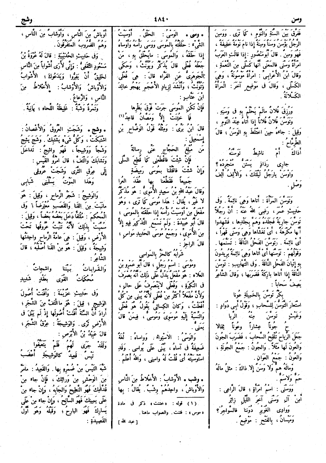 ففرق بين السِّنَةِ والنوم كما ترى ووَسِنَ الرجلُ يَوْسَنُ وَسَناً وسِنَةً إِذا نام نومة خفيفة فهو وسِنٌ قال أَبو منصور إِذا قالت العرب امرأَة وَسْنَى فالمعنى أَنها كَسْلَى من النَّعْمة وقال ابن الأَعرابي امرأَة مَوْسُونةٌ وهي الكَسْلَى وقال في موضع آخر المرأَة الكسلانة ورُزِقَ فلانٌ ما لم يَحْلُمْ به في وسَنِهِ وتوَسَّنَ فلان فلاناً إِذا أَتاه عند النوم وقيل جاءه حين اختلط به الوَسَنُ قال الطرمّاحُ أَذاك أَم ناشِطٌ تَوَسَّنَهُ جاري رَذاذٍ يَسْتَنُّ مُنْجرِدُهْ ؟ واوْسَنْ يا رجلُ ليلتك والأَلف أَلف وصل وتَوَسَّن المرأَة أَتاها وهي نائمة وفي حديث عمر رضي الله عنه أَن رجلاً تَوسَّنَ جارية فجَلَدَهُ وهَمَّ بجَلْدها فشهدنا أَنها مكرهة أَي تغشَّاها وهي وَسْنَى قهراً أَي نائمة وتوَسَّنَ الفحلُ الناقةَ تسَنَّمَها وقولهم توَسَّنَها أَي أَتاها وهي نائمة يريدون به إِتيان الفحل الناقة وفي التهذيب توَسَّنَ الناقة إِذا أَتاها باركة فضربها وقال الشاعر يصف سحاباً بِكْر توَسَّن بالخَمِيلَةِ عُوناً استعار التَّوَسُّنَ للسحاب وقول أَبي دُوَاد وغَيْث توَسَّنَ منه الرِّيا حُ جُوناً عِشاراً وعُوناً ثِقالاً جعل الرِّياحَ تُلْقِحُ السحابَ فضرب الجُونَ والعُون لها مثلاً والجُونُ جمع الجُونةِ والعُونُ جمع العَوَانِ وما لم هَمٌّ ولا وَسَنٌ إِلا ذاك مثل ما له حَمٌّ ولا سَمٌّ ووَسْنَى اسم امرأَة قال الراعي أَمِنْ آلِ وَسْنَى آخرَ الليلِ زائرُ ووادي الغُوَيْر دوننا فالسَّواجِرُ ؟ ومَيْسانُ بالفتح موضع ( وسي ) الوَسْيُ الحَلْق أَوْسَيتُ الشيءَ حَلَقْته بالمُوسى ووَشَى رأْسَه وأَوْساه إِذا حَلَقَه والمُوسَى ما يُحْلَقُ به مَن جعله فُعْلى قال يُذَكَّر ويؤَنث وحكى الجوهري عن الفراء قال هي فْعْلى وتؤنث وأَنشد لزياد الأَعجم يهجو خالد بن عَتَّاب فإِن تَكُنِ الموسى جَرَتْ فوقَ بَظْرِها فما خُتِنَتْ إِلا ومَصَّانُ قاعِدُ