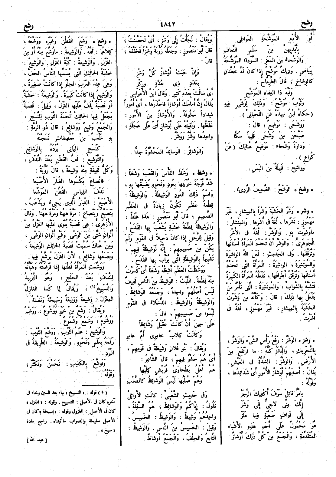 ( وشع ) وشَعَ القُطْنَ وغيرَه وَوشَّعَه كِلاهما لَفَّه والوَشِيعةُ ما وُشِّعَ منه أَو من الغَزْل والوَشِيعةُ كُبَّةُ الغَزْلِ والوَشِيعُ خشَبةُ الحائِكِ التي يُسَمِّيها الناسُ الحَفَّ وهي عند العرب الحِلْوُ إِذا كانت صغيرة والوَشِيعُ إِذا كانت كبيرة والوَّشِيعةُ خشَبةٌ أَو قصَبةٌ يُلَفُّ عليها الغَزْلُ وقيل قصبة يَجْعلُ فيها الحائِك لُحْمةَ الثوبِ للنسْجِ والجمع وَشِيعٌ ووَشائِعُ قال ذو الرمة به مَلْعَبٌ من مُعْصِفاتٍ نَسَجْنَه كَنَسْجِ اليَماني بُرْدَه بالوَشائِعِ والتوْشِيعُ لَفُّ القُطْنِ بعد النَّدْفِ وكلُّ لَفِيفةٍ منه وَشِيعةٌ قال رؤْبة فانْصاعَ يَكْسُوها الغُبارَ الأَصْيَعا نَدْفَ القِياسِ القُطنَ المُوَشَّعا الأَصْيَعُ الغُبارُ الذي يجيءُ ويذهب يَتَصَيَّع ويَنْصاعُ مرة ههنا ومرة ههنا وقال الأَزهري هي قصبة يُلْوى عليها الغزلُ من أَلوان شَتى من الوَشْيِ وغير أَلوان الوشي ومن هناك سميت قصَبةُ الحائِكِ الوَشِيعة وجمعها وشائع لأَن الغزل يُوشَّعُ فيها ووَشَّعَتِ المرأَةُ قُطنها إِذا قَرَضَتْه وهَيَّأَتْه للندْفِ بعد الحَلْجِ وهو التَّزبِيدُ والتَّسْيِيحُ ويقال لما كسا الغازِلُ المَغْزُولَ وشِيعةٌ ووَلِيعةٌ وسَلِيخةٌ ونَضْلةٌ ويقال وَشْعٌ من خير ووُشُوعٌ ووَشْمٌ ووُشُومٌ وشَمْعٌ وشُموعٌ والوَشِيعُ عَلَمُ الثوْبِ ووَشَّعَ الثوبَ رَقَمَه بعَلَم ونحوه والوشِيعةُ الطريقةُ في البُرْدِ وتَوَشَّعَ بالكذِبِ تَحَسَّنَ وتَكَثَّرَ وقوله