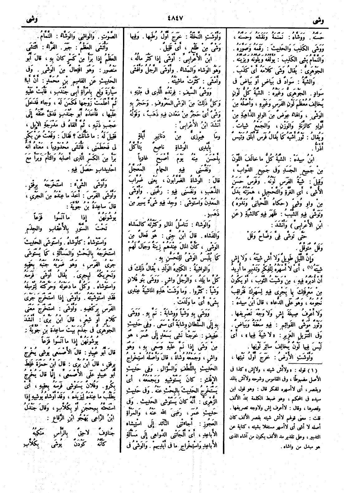 حَسَّنَه ووَشَّاه نَمْنَمَه ونَقَشَه وحَسَّنه ووَشى الكَذِبَ والحديثَ رَقَمَه وصَوَّرَه والنَّمَّامُ يَشي الكذبَ يُؤَلِّفُه ويُلَوِّنه ويُزَيِّنه الجوهري يقال وَشى كلامَه أَي كذب والشِّيةُ اسودٌ في بياض أَو بياض في سواد الجوهري وغيره الشِّيةُ كلُّ لون يخالف مُعظم لون الفرس وغيره وأَصله من الوَشْي والهاء عوض من الواو الذاهبة من أَوله كالزِّنة والوزن والجمع شِياتٌ ويقال ثَوْرٌ أَشْيَهُ كما يقال فرس أَبْلَقُ وتَيْسٌ أَذْرَأُ ابن سيده الشِّيةُ كلُّ ما خالَف اللَّوْنَ من جميع الجسد وفي جميع الدواب وقيل شِيةُ الفرس لوْنُه وفرس حَسَنُ الأُشِيِّ أَي الغُرَّة والتحجيل همزته بدل من واوِ وُشِيٍّ حكاه اللحياني ونَدَّرَه وتَوَشَّى فيه الشَّيْبُ ظَهرَ فيه كالشِّيةِ عن ابن الأَعرابي وأَنشد حتى تَوَشَّى فِيَّ وَضَّاحٌ وَقَلْ وقَلٌ مُتَوَقِّلٌ وإِن الليل طَويلٌ ولا أَشِ شِيَتَه ولا إِشِ شيته أَي لا أَسهره للفكر وتدبير ما أُريد أَن أُدبره فيه من وشَيْتُ الثوب أَو يكون من معرفتك بما يجري فيه لسهرك فتراقب نجومه وهو على الدعاء قال ابن سيده ولا أَعرف صيغة إِشِ ولا وجه تصريفها وثور مُوَشَّى القوائِم فيه سُعْفةٌ وبياض وفي التنزيل العزيز لا شِيةَ فيها أَي ليس فيها لوْنٌ يُخالِفُ سائر لونها وأَوْشَتِ الأَرْضُ خرج أَولُ نبتها وأَوْشَتِ النخلة خرج أَولُ رُطبَها وفيها وَشْيٌ من طَلْعٍ أَي قليل ابن الأَعرابي أَوْشَى إِذا كَثُرَ ماله وهو الوَشاءُ والمَشاء وأَوْشَى الرجلُ وأَفْشى وأَمْشى كثرت ماشِيَتُه ووَشْيُ السِّيفِ فِرِنْدُه الذي في متنه وكلُّ ذلك من الوَشْي المعروف وحَجَرٌ به وَشَيٌ أَي حجر من معدن فيه ذهب وقوله أَنشده ابن الأَعرابي وما هِبْرِزيٌّ من دَنانير أَيْلةٍ بأَيدي الوُشاةِ ناصِعٌ يَتأَكَّلُ بأَحْسَن منه يَوْمَ أَصْبَحَ غادِياً ونَفَّسَني فيه الحِمامُ المُعَجَّلُ قال الوُشاةُ الضَّرَّابونَ يعني ضُرَّاب الذهب ونَفَّسني فيه رَغَّبني وأَوْشى المَعْدِنُ واسْتَوْشى وُجد فيه شيء يسير من ذهب والوَشاء تَناسل المالِ وكثرته كالمَشاء والفَشاء قال ابن جني هو فَعالٌ من الوَشْيِ كأَن المال عندهم زِينةٌ وجَمال لهم كما يُلْبَس الوَشْي للتحسن به والواشِيةُ الكثيرةُ الولد يقال ذلك في كل ما يَلِد والرجل واشٍ ووَشى بنو فلان وَشْياً كثروا وما وَشَتْ هذه الماشِيةُ عندي بشيء أَي ما وَلدَت ووَشى به وَشْياً ووِشايةً نَمَّ به وَوَشى به إِلى السلطان وِشايةً أَي سَعى وفي حديث عفِيف خَرَجْنا نَشي بسعدٍ إِلى عُمَرَ هو من وَشى إِذا نَمَّ عليه وَسَعى به وهو واشٍ وجمعه وُشاةٌ قال وأَصله اسْتِخْراج الحديثِ باللُّطْفِ والسؤال وفي حديث الإِفك كان يَسْتَوْشِيه ويَجْمَعُه أَي يستخرج الحديث بالبحث عنه وفي حديث الزهري أَنه كان يَسْتَوْشي الحديث وفي حديث عُمَر رضي الله عنه والمرأَةِ العجوز أَجاءَتْني النَّآئِدُ إِلى اسْتِيشاء الأَباعِد أَي أَلجأَتْني الدواهي إِلى مسأَلةِ الأَباعِدِ واستخراج ما في أَيديهم والوَشْيُ في الصوت والواشي والوَشاءُ النَّمَّام وأْتشى العظمُ جَبَرَ الفراء ائْتَشى العظم إِذا بَرأَ من كَسْر كان به قال أَبو منصور وهو افْتِعال من الوَشْي وفي الحديث عن القاسم بن محمد أَن أَبا سَيَّارة وَلِعَ بامرأَة أَبي جُنْدَبٍ فأَبت عليه ثم أَعلمت زوجها فكَمَنَ له وجاء فدخل عليها فأَخذه أَبو جُنْدَب فدَقَّ عُنُقَه إِلى عَجْب ذَنبه ثم أَلقاه في مَدْرَجةِ الإِبل فقيل له ما شأْنك ؟ فقال وقَعْتُ عن بكر لي فحَطَمَني فَأْتَشى مُحْدَوْدِباً معناه أَنه بَرَأَ من الكسر الذي أَصابه والتأَمَ وَبرَأَ مع احْديداب حَصَل فيه وأَوْشى الشيءَ استخرجه برِفْق وأَوشى الفَرَسَ أَخذ ما عنده من الجَرْيِ قال ساعدة بن جؤية يُوشُونَهُنَّ إِذا ما آنَسُوا فَزَعاً تحْتَ السَّنَوَّرِ بالأَعْقابِ والجِذَمِ واسْتَوْشاه كأَوْشاه واسْتَوْشى الحديثَ استخرجه بالبحث والمسأَلة كما يُسْتَوْش