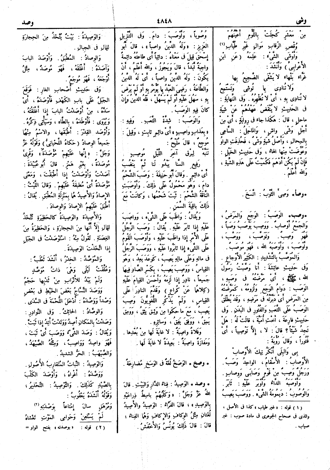 أَي دائم وقال أَبو حنيفة وَصَبَ الشحمُ دام وهو محمول على ذلك وأَوْصَبَتِ الناقةُ الشحم ثَبَتَ شَحمُها وكانت مع ذلك باقيةَ السِّمَن ويقال واظَبَ على الشيءِ وواصَبَ عليه إِذا ثابَرَ عليه يقال وَصَبَ الرجلُ على الأَمْر إِذا واظب عليه وأَوْصَبَ القومُ على الشيءِ إِذا ثابَروا عليه ووَصَبَ الرجلُ في مالِه وعلى مالِه يَصِبُ كوَعَدَ يَعِدُ وهو القياس ووَصِبَ يَصِبُ بكسر الصاد فيهما جميعاً نادرٌ إِذا لَزِمَه وأَحْسَنَ القيامَ عليه كلاهما عن كُراع وقدَّمَ النادِرَ على القياس ولم يذكر اللغويون وَصِبَ يَصِبُ مع ما حَكَوا من وَثِق يَثِقُ ووَمِقَ يَمِقُ ووَفِقَ يَفِقُ وسائره وفَلاةٌ واصِبةٌ لا غاية لها مِن بُعْدها ومَفازة واصِبَة بعيدةٌ لا غاية لها ( وصخ ) الوَصَخ لغة في الوَسَخ مضارعة ( وصد ) الوَصِيدُ فِناءُ الدار والبيت قال الله عز وجل وكلبهم باسط ذِراعَيْهِ بالوَصِيدِ قال الفراء الوَصِيدُ والأَصيدُ لغتان مثل الوِكافِ والإِكافِ وهما الفِناءُ قال قال ذلك يونس والأَخفش والوَصِيدةُ بيتٌ يُتخذ من الحجارة للمال في الجبال والوِصادُ المُطْبَقُ وأَوْصَدَ البابَ وآصَدَه أَغْلَقَه فهو مُوصَدٌ مثل أَوجَعَه فهو موجَع وفي حديث أَصحاب الغار فوقع الجبل على باب الكَف فأَوْصَدَه أَي سَدَّه من أَوْصَدْت الباب إِذا أَغلَقْتَه ويروى فأَوْطَدَه بالطاء وسيأْتي ذكره وأَوصَد القِدْرَ أَطْبَقَها والاسم منهما جميعاً الوِصادُ حكاه اللحياني وقوله عز وجل إِنها عليهم مُؤْصَدةٌ وقرئ مُوصَدة بغير همز قال أَبو عبيدة آصَدْتُ مُوصَدة بغير همز قال أَبو عبيدة آصَدْتُ وأَوْصَدْتُ إِذا أَطْبَقْتَ ومعنى مُؤْصَدةٌ أَي مُطْبَقَةٌ عليهم وقال الليث الإِصادُ والأَصِيدُ هما بمنزلة المُطْبَق يقال أَطْبَقَ عليهم الإِصادَ والوِصادَ والأَصِيدةُ والوَصِيدة كالحظيرةِ تُتَّخَذُ للمال إِلا أَنها من الحجارة والحَظِيرةُ من الغِصنَة تقول منه اسْتَوْصَدْتُ في الجبل إِذا اتخذت الوَصيدة والمُوَصَّدُ الخِدْرُ أَنشد ثعلب وعُلِّقْتُ لَيْلَى وهْيَ ذاتُ مُوَصَّدٍ ولم يَبْدُ لِلأَتْرابِ مِن ثَدْيِها حَجْمُ وَوَصَدَ النَّسَّاجُ بعضَ الخَيْطِ في بعض وَصْداً وَوَصَّدَه أَدْخَلَ اللُّحْمَةَ في السَّدَى الوصَّادُ الحائِكُ وفي النوادر وَصَدْتُ بالمكان أَصِدُ ووَتَدْتُ أَتِدُ إِذا ثَبَتَّ ويقال وَصَدَ الشيءُ ووَصَبَ أَي ثَبَتَ فهو واصِدٌ ووَاصِبٌ ومثله الصَّهْيَدُ والصَّيْهَبُ الحرُّ الشديدُ والوصيدُ النباتُ المتقاربُ الأُصولِ ووَصَّدَه أَغراه وأَوصَدَ الكلب بالصَّيْدِ كذلك والتوصِيدُ التحذيرُ وقوله أَنشده يعقوب ومُرْهَقٍ سالَ إِمْتاعاً بِوَصْدِته لم يَسْتَعِنْ وحَوامِي المَوْتِ تَغْشاه
