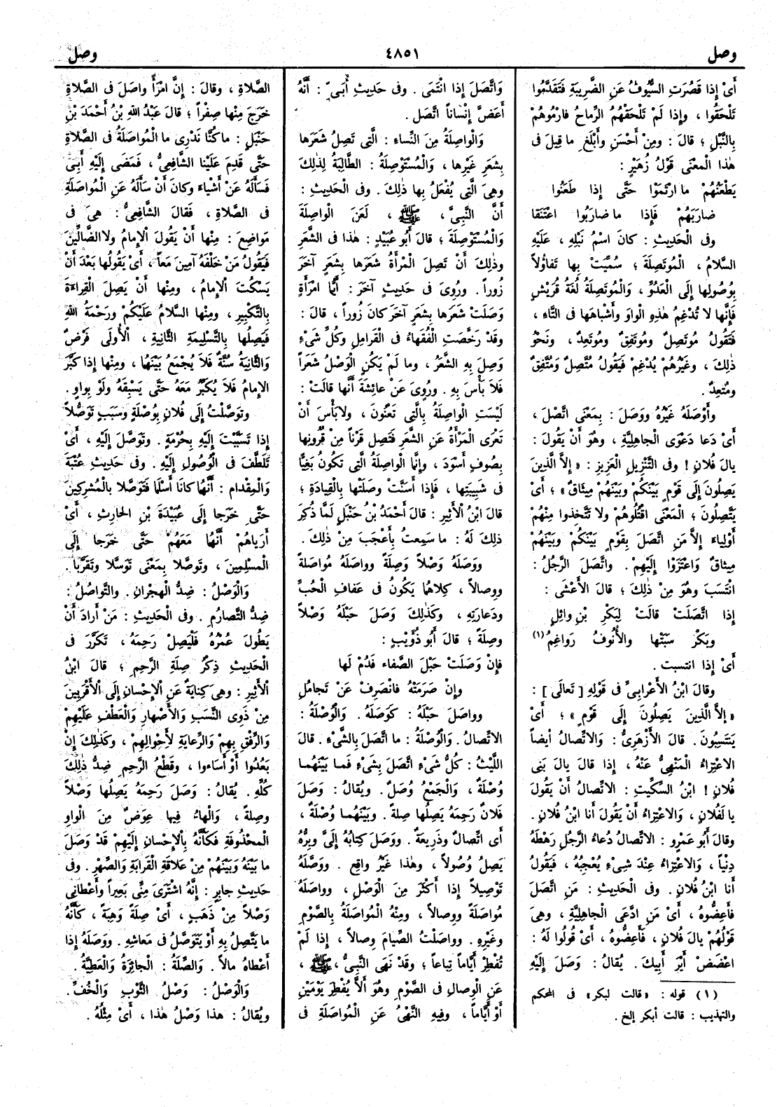 ( * قوله « وما لم يكن الوصل » أي الموصول به شعراً إلخ ) شعراً فلا بأْس به وروي عن عائشة أَنها قالت ليست الواصِلةُ بالتي تَعْنون ولا بأْسَ أَنْ تَعْرَى المرأَةُ عن الشعَر فتَصُِل قَرْناً من قرُونها بصُوفٍ أَسوَد وإِنما الواصِلة التي تكون بغيّاً في شَبيبَتِها فإِذا أَسَنَّتْ وصَلَتْها بالقِيادة قال ابن الأَثير قال أَحمد بن حنبل لمَّا ذُكِر ذلك له ما سمعت بأَعْجَب من ذلك ووَصَله وَصْلاً وصِلة وواصَلَهُ مُواصَلةً ووِصالاً كلاهما يكون في عَفاف الحبّ ودَعارَتِه وكذلك وَصَل حَبْله وَصْلاً وصِلةً قال أَبو ذؤيب فإِن وَصَلَتْ حَبْلَ الصَّفاء فَدُمْ لها وإِن صَرَمَتْه فانْصَرِف عن تَجامُل وواصَلَ حَبْله كوَصَله والوُصْلة الاتِّصال والوُصْلة ما اتَّصل بالشيء قال الليث كلُّ شيء اتَّصَل بشيء فما بينهما وُصْلة والجمع وُصَل ويقال وَصَل فلان رَحِمَه يَصِلها صِلةً وبينهما وُصْلة أَي اتِّصال وذَرِيعة ووَصَل كتابُه إِليّ وبِرُّه يَصِل وُصولاً وهذا غير واقع ووَصَّله تَوْصيلاً إِذا أَكثر من الوَصْل وواصَله مُواصَلةً ووِصالاً ومنه المُواصَلةُ بالصوم وغيره وواصَلْت الصِّيام وِصالاً إِذا لم تُفْطِر أَياماً تِباعاً وقد نهى النبي صلى الله عليه وسلم عن الوِصال في الصوم وهو أَن لا يُفْطِر يومين أَو أَياماً وفيه النهي عن المُواصَلة في الصَّلاة وقال إِنَّ امْرَأً واصَلَ في الصلاة خرج منها صِفْراً قال عبد الله بن أَحمد بن حنبل ما كُنَّا نَدْري ما المُواصَلة في الصلاة حتى قَدِم علينا الشافعيُّ فمضى إِليه أَبي فسأَله عن أَشياء وكان فيما سأَله عن المُواصَلة في الصلاة فقال الشافعي هي في مواضع منها أَن يقول الإِمامُ ولا الضّالِّين فيقول مَن خلفه آمين معاً أَي يقولها بعد أَن يسكُت الإِمام ومنها أَن يَصِل القراءة بالتكبير ومنها السلامُ عليكم ورحمةُ الله فيَصِلها بالتسليمة الثانية الأُولى فرض والثانية سُنَّة فلا يُجْمَع بينهما ومنها إِذا كبَّر الإِمام فلا يُكَبِّر معه حتى يسبقه ولو بواو وتَوَصَّلْت إِلى فلان بوُصْلة وسبب توَصُّلاً إِذا تسبَّبت إِليه بحُرْمة وتوصَّل إِليه أَي تلطَّف في الوُصول إِليه وفي حديث عُتْبة والمقدام أَنهما كانا أَسْلَما فَتَوَصَّلا بالمشركين حتى خَرجا إِلى عُبيدة بن الحرث أَي أَرَياهم أَنهما مَعَهم حتى خرجا إِلى المسلمين وتوصَّلا بمعنى توسَّلا وتقرَّبا والوَصْل ضد الهجران والتَّواصُل ضد التَّصارُم وفي الحديث مَن أَراد أَن يَطول عُمْره فَلْيَصِلْ رَحِمَه تكرّر في الحديث ذكر صِلة الرَّحِم قال ابن الأَثير وهي كِناية عن الإِحسان إِلى الأَقرَبين من ذوي النسَب والأَصْهار والعَطف عليهم والرِّفْق بهم والرِّعاية لأَحْوالهم وكذلك إِن بَعُدُوا أَو أَساؤوا وقَطْع الرَّحِم ضدُّ ذلك كلِّه يقال وَصَل رَحِمَه يَصِلُها وَصْلاً وصِلةً والهاء فيها عِوَض من الواو المحذوفة فكأَنه بالإِحسان إِليهم قد وَصَل ما بينه وبينهم من عَلاقة القَرابة والصِّهْر وفي حديث جابرٍ إِنه اشترى مِنِّي بَعيراً وأَعطاني وَصْلاً من ذهَب أَي صِلةً وهِبةً كأَنه ما يَتَّصِل به أَو يَتَوَصَّل في مَعاشه ووَصَله إِذا أَعطاه مالاً والصِّلة الجائزة والعطيَّة والوَصْل وَصْل الثوب والخُفّ ويقال هذا وَصْل هذا أَي مثله
