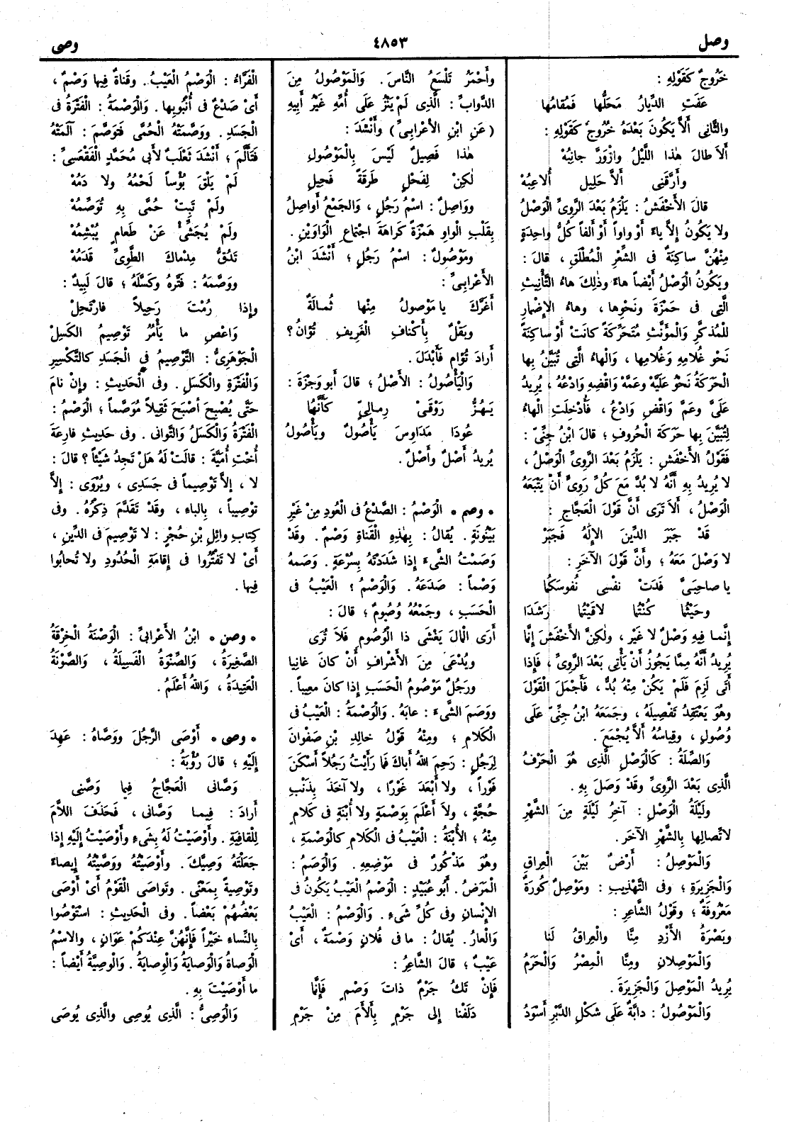 خروج كقوله عفَتِ الدِّيارُ مَحَلُّها فَمُقامُها والثاني أَن لا يكون بعده خروجٌ كقوله أَلا طالَ هذا الليلُ وازْوَرَّ جانِبُهْ وأَرَّقَني أَن لا حَليلٌ أُلاعِبُهْ قال الأَخفش يلزم بعد الرَّوِيِّ الوَصْل ولا يكون إِلا ياءً أَو واواً أَو أَلِفاً كل واحدة منهنّ ساكنة في الشعر المُطْلَق قال ويكون الوَصْل أَيضاً هاءً الإِضْمار وذلك هاءُ التأْنيث التي في حَمْزة ونحوها وهاءُ للمُذكَّر والمؤَنث متحرِّكة كانت أَو ساكنة نحو غُلامِه وغُلامِها والهاء التي تُبَيَّن بها الحركة نحو عَلَيَّهْ وعَمَّهْ واقْضِهِ وادْعُهُ يريد عَلَيَّ وعَمَّ واقضِ وادعُ فأُدخلت الهاء لتُبَيَّن بها حركة الحروف قال ابن جني فقول الأَخفش يلزم بعد الرَّوِيِّ الوَصْل لا يريد به أَنه لا بُدَّ مع كل رَويّ أَن يَتْبَعه الوَصْل أَلا ترى أَن قول العجاج قد جَبَر الدِّينَ الإِلَهُ فجَبَرْ لا وَصْل معه وأَن قول الآخر يا صاحِبَيَّ فَدَتْ نفْسي نُفوسَكما وحيْثُما كُنْتُما لاقَيْتُما رَشَدَا إِنما فيه وَصْل لا غير ولكن الأَخفش إِنما يريد أَنه مما يجوز أَن يأْتي بعد الرَّوِيٍّ فإِذا أَتَى لَزِم فلم يكن منه بُدٌّ فأَجْمَل القَوْلَ وهو يعتقد تفصِيله وجمعه ابن جني على وُصُول وقياسُه أَن لا يُجْمَع والصِّلةُ كالوَصْل الذي هو الحرف الذي بعد الرَّوِيّ وقد وَصَل به وليلة الوَصْل آخر ليلة من الشهر لاتِّصالها بالشهر الآخَرَ والمَوْصِل أَرض بين العِراق والجزيرة وفي التهذيب ومَوْصِل كُورة معروفة وقول الشاعر وبَصْرَة الأَزْدِ مِنَّا والعِراقُ لنا والمَوْصِلانِ ومِنَّا المِصْرُ والحَرَمُ يريد المَوْصِل والجزيرة والمَوْصولُ دابَّة على شكل الدَّبْرِ أَسْوَد وأَحْمَر تَلْسَع الناسَ والمَوْصول من الدوابّ الذي لم يَنْزُ على أُمِّه غيرُ أَبيه عن ابن الأَعرابي وأَنشد هذا فَصِيلٌ ليس بالمَوْصولِ لكِنْ لِفَحْلٍ طرقة فَحِيلِ ووَاصِل اسم رجل والجمع أَواصِل بقلْب الواو همزة كراهة اجتماع الواوين ومَوْصول اسم رجل أَنشد ابن الأَعرابي أَغَرَّكَ يا مَوْصولُ منها ثُمالةٌ وبَقْلٌ بأَكْنافِ الغَرِيفِ تُؤانُ ؟ أَراد تُؤام فأَبدل واليَأْصُول الأَصْلُ قال أَبو وجزة يَهُزُّ رَوْقَيْ رِماليٍّ كأَنَّهما عُودَا مَدَاوِسَ يَأْصولٌ ويأْصولُ يريد أَصْلٌ وأَصْلٌ