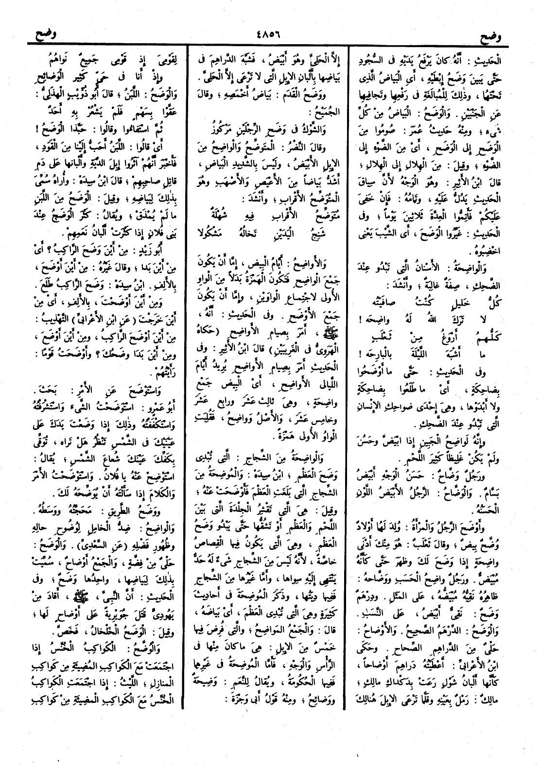 الحديث أَنه كان يرفع يديه في السجود حتى يَبينَ وَضَحُ إبْطَيْهِ أَي البياضُ الذي تحتهما وذلك للمبالغة في رفعهما وتجافيهما عن الجنبين والوَضَحُ البياضُ من كل شيء ومنه حديث عمر صوموا من الوَضَح إِلى الوَضَحِ أَي من الضَّوء إِلى الضوء وقيل من الهلال إِلى الهلال قال ابن الأَثير وهو الوجه لأَن سياق الحديث يدل عليه وتمامه فإِن خَفِيَ عليكم فأَتِمُّوا العِدَّة ثلاثين يوماً وفي الحديث غَيِّرُوا الوَضَحَ أَي الشَّيْب يعني اخْضِبُوه والواضحةُ الأَسْنانُ التي تبدو عند الضحك صفة غالبة وأَنشد كلُّ خَليلٍ كنتُ صافَيْتُه لا تَرَكَ الله له واضِحه كلُّهمُ أَرْوَغُ من ثَعْلَبٍ ما أَشْبَه الليلةَ بالبارِحه وفي الحديث حتى ما أَوضَحُوا بضاحكة أَي ما طَلَعوا بضاحكة ولا أَبْدَوْها وهي إِحدى ضواحِكِ الإِنسان التي تبدو عند الضحك وإِنه لواضح الجَبينِ إِذا ابيضَّ وحَسُنَ ولم يكن غليظاً كثير اللحم ورجل وَضَّاحٌ حَسَنُ الوجه أَبيضُ بَسَّامٌ والوَضَّاحُ الرجلُ الأَبيضُ اللون الحَسَنُه وأَوضَحَ الرجلُ والمرأَة وُلِدَ لَهما أَولادٌ وُضَّحٌ بيضٌ وقال ثعلب هو منكَ أَدنى واضحةٍ إِذا وَضَحَ لك وظهر حتى كأَنه مُبْيَضُّ ورجل واضحُ الحَسَبِ ووَضَّاحُه ظاهره نَقِيُّه مبيضه على المثل ودرهم وَضَحٌ نَقِيّ أَبيض على النسب والوَضَحُ الدِّرْهم الضحيح والأَوضاحُ حَلْيٌ من الدراهم الصحاح وحكى ابن الأَعرابي أَعطيته دراهم أَوضاحاً كأَنها أَلبانُ شَوْلٍ رَعَتْ بدَكْداكِ مالكٍ مالك رمل بعينه وقلما ترعى الإِبل هنالك إِلا الحَلِيَّ وهو أَبيض فشبه الدراهم في بياضها بأَلبان الإِبل التي لا ترعى إِلا الحَلِيِّ ووَضَحُ القَدَم بياضُ أَخْمَصِه وقال الجُمَيْحُ والشَّوْكُ في وَضَحِ الرجلينِ مَرْكُوزُ وقال النضر المتوضِّحُ والواضح من الإِبل الأَبيض وليس بالشديد البياض أَشدُّ بياضاً من الأَعْيَصِ والأَصْهَبِ وهو المتوضِّحُ الأَقْراب وأَنشد مُتَوَضِّحُ الأَقْرابِ فيه شُهْلَةٌ شَنِجُ اليدين تَخالُه مَشْكُولا والأَواضِحُ الأَيامُ البيض إِما أَن يكون جمعَ الواضح فتكون الهمزة بدلاً من الواو الأُولى لاجتماع الواوين وإِما أَن يكون جمع الأَوْضَح وفي الحديث أَنه صلى الله عليه وسلم أَمر بصيام الأَواضِحِ حكاه الهروي في الغريبين قال ابن الأَثير وفي الحديث أَمر بصيام الأَوْضاحِ يريد أَيامَ الليالي الأَواضِح أَي البيض جمع واضحة وهي ثالث عشر ورابع عشر وخامس عشر والأَصل وَواضِح فقلبت الواو الأُولى همزة والواضِحة من الشِّجاج التي تُبْدي وَضَحَ العظم ابن سيده والمُوضِحةُ من الشِّجاج التي بلغت العظم فأَوضَحَتْ عنه وقيل هي التي تَقْشِر الجلدةَ التي بين اللحم والعظم أَو تشقها حتى يبدو وَضَحُ العظم وهي التي يكون فيها القصاص خاصة لأَنه ليس من الشجاج شيء له حدَّ ينتهي إِليه سواها وأَما غيرها من الشجاج ففيها ديتها وذكر المُوضِحة في أَحاديث كثيرة وهي التي تبدي العظم أَي بَياضَه قال والجمع المَواضِح والتي فُرِضَ فيها خمس من الإِبل هي ما كان منها في الرأْس والوجه فأَما المُوضِحة في غيرهما ففيها الحكومة ويقال للنَّعَم وَضِيحةٌ ووَضائِحُ ومنه قول أَبي وَجْزَة لقَوْمِيَ إِذ قَوْمي جميعٌ نَواهُمُ وإِذ أَنا في حَيٍّ كثير الوَضائِح والوَضَحُ اللبنُ قال أَبو ذؤيب الهذلي عَقَّوْا بسَهْمٍ فلم يَشْعُرْ به أَحدٌ ثم اسْتَفاؤوا وقالوا حَبَّذا الوَضَحُ أَي قالوا اللبنُ أَحبُّ إِلينا من القَوَد فأَخبر أَنهم آثَرُوا إِبل الدية وأَلبانها على دم قاتل صاحبهم قال ابن سيده وأُراه سمي بذلك لبياضه وقيل الوَضَحُ من اللبن ما لم يُمْذَقْ ويقال كثر الوَضَحُ عند بني فلان إِذا كَثُرَت أَلبانُ نَعَمِهم أَبو زيد من أَين وَضَحَ الراكبُ ؟ أَي من أَين بدا وقال غيره من أَين أَوضَح بالأَلف ابن سيده وَضَحَ الراكبُ طَلَع ومن أَين أَوضَحْتَ بالأَلف أَي من أَين خرجت عن ابن الأَعرابي التهذيب من أَين أَوضَح الراكبُ ومن أَين أَوضَعَ وم