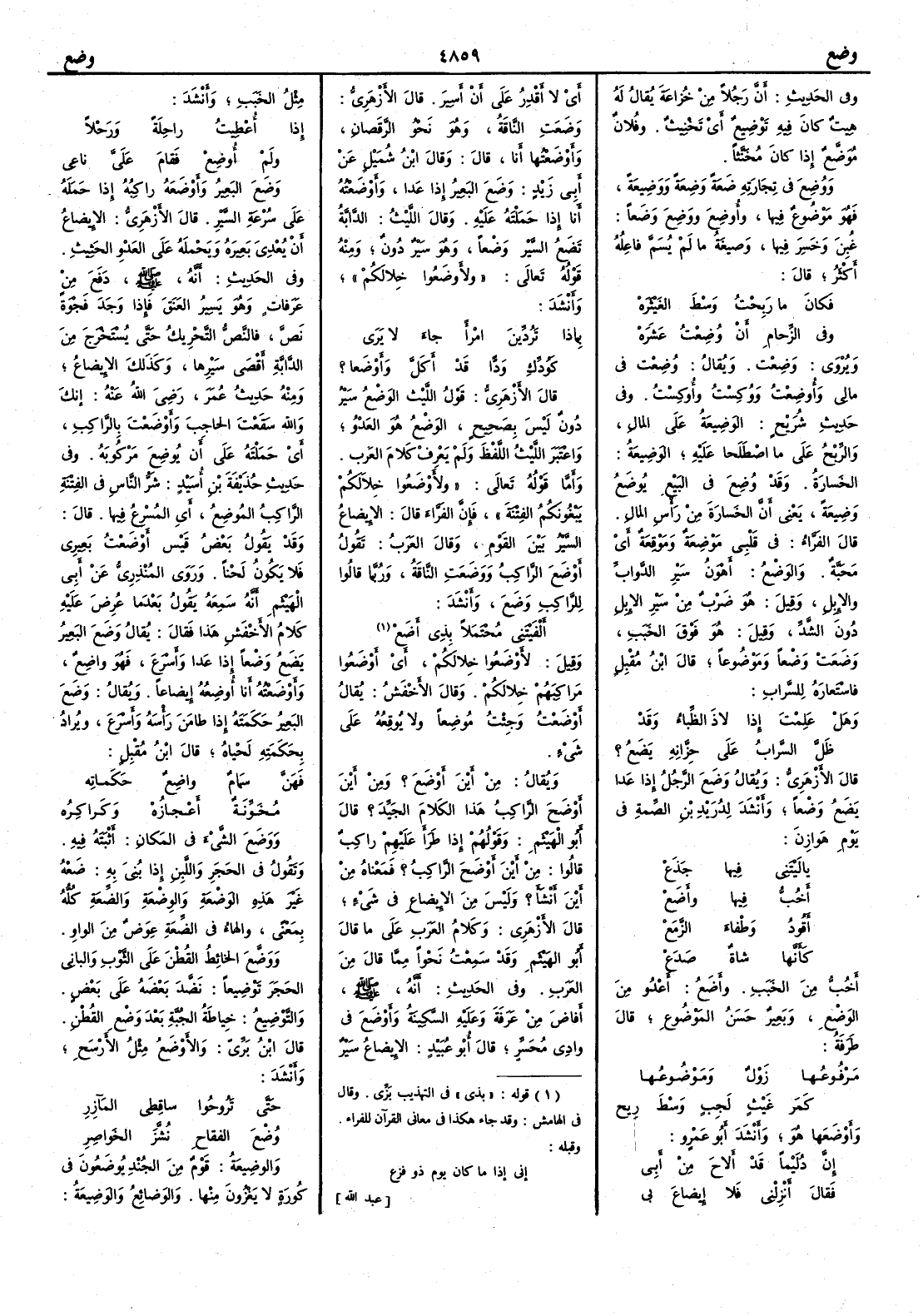 وفي الحديث أَن رجلاً من خُزاعةَ يقال له هِيثٌ كان فيه تَوْضِعٌ أو تخْنيتٌ وفلان مُوَضَّعٌ إِذا كان مُخَنَّثاً ووضِعَ في تِجارتِه ضَعةً وضِعةً ووَضِيعةً فهو مَوْضُوعٌ فيها وأُوضِعَ ووَضِعَ وَضَعاً غُبِنَ وخَسِرَ فيها وصِيغةُ ما لم يسم فاعله أَكثر قال فكان ما رَبِحْت وَسْطَ العَيْثَرَهْ وفي الزِّحامِ أَنْ وُضِعْت عَشَرَهْ ويروى وَضِعْت ويقال وُضِعْت في مالي وأُوضِعْتُ ووُكِسْتُ وأُوكِسْتُ وفي حديث شريح الوَضِيعةُ على المال والريح على ما اصطلحا عليه الوَضِيعةُ الخَسارة وقد وُضِعَ في البَيْعِ يُوضَعُ وَضِيعةً يعني أضنَّ الخَسارةَ من رأْس المال قال الفراء في قلبي مَوْضِعةٌ وموْقِعةٌ أَي مَحَبّةٌ والوَضْعُ أَهْوَنُ سَيْرِ الدوابِّ والإِبل وقيل هو ضَرْبٌ من سير الإِبل دون الشدّ وقيل هو فَوْقَ الخَبَب وضَعَتْ وَضْعاً وموْضُوعاً قال ابنُ مُقْبِلٍ فاستعاره للسّراب وهَلْ عَلِمْت إِذا لاذَ الظِّباءِ وقَدْ ظَلَّ السَّرابُ على حِزَّانهِ يَضَعُ ؟ قال الأَزهري ويقال وَضَعَ الرجلُ إِذا عَدا يَضَعُ وَضْعاً وأَنشد لدريد بن الصّمة في يوم هَوازِنَ يا لَيْتَني فيها جذَعْ أَخُبُّ فيها وأَضَعْ أَقُودُ وَطْفاءَ الزَّمَعْ كأَنها شاةٌ صَدَعْ أَخُبُّ من الخَبَبِ وأَضَعُ أَعْدُو من الوَضْعِ وبعير حَسَنُ الموضوعِ قال طرَفةُ مَرْفُوعُها زَوْلٌ ومَوْضُوعُها كَمَرِّ غَيْثٍ لَجِبٍ وَسْطَ رِيح وأَوْضَعَها هو وأَنشد أَبو عمرو إِنَّ دُلَيْماً قد أَلاحَ من أَبي فقال أَنْزِلْني فلا إِيضاعَ بي أَي لا أَقْدِرُ على أَن أَسير قال الأَزهري وضَعَتِ الناقةُ وهو نحو الرَّقَصانِ وأَوْضَعْتُها أَنا قال وقال ابن شميل عن أَبي زيد وَضَعَ البعير إِذا عَدا وأَوْضَعْتُه أنا إِذا حملته عليه وقال الليث الدابّةُ تَضَعُ السير وَضْعاً وهو سير دُونٌ ومنه قوله تعالى لأَوضَعُوا خِلالَكم وأَنشد بماذا تَرُدِّينَ امْراً جاءَ لا يَرَى كَوُدِّكِ وُدًّا قد أَكَلَّ وأَوْضَعا ؟ قال الأَزهري قول الليث الوَضْعُ سَير دُونٌ ليس بصحيح والوَضْعُ هو العَدْوُ واعتبر الليثُ اللفظَ ولم يعرف كلام العرب وأَما قوله تعالى ولأَوْضَعُوا خِلالَكم يَبْغُونَم الفتنةَ فإِنَّ الفراء قال الإِيضاعُ السير بين القوم وقال العرب تقول أَوْضَعَ الراكِبُ ووَضَعَتِ الناقةُ وربما قالوا للراكب وَضَعَ وأَنشد أَلْفَيْتَني مُحْتَمَلاً بِذِي أَضَعْ وقيل لأَوْضَعُوا خِلالَكم أَي أَوْضَعُوا مَراكِبَهم خِلالَكم وقال الأَخفش يقال أَوْضَعْتُ وجئت مُوضِعاً ولا يوقِعُه على شيء ويقال من أَيْنَ أوْضَعَ ومن أَين أَوْضَحَ الراكِبُ هذا الكلام الجيّدفقال أَبو الهيثم وقولهم إِذا طرأَ عليهم راكب قالوا من أَين أَوْضَحَ الراكِبُ فمعناه من أَين أَنشأَ وليس من الإِيضاعِ في شيء قال الأَزهريّ وكلام العرب على ما قال أَبو الهيثم وقد سمعتُ نحواً مما قال من العرب وفي الحديث أَنه صلى الله عليه وسلم أَفاض من عَرفةَ وعليه السكينةُ وأَوْضَعَ في وادِي مُحَسِّرٍ قال أَبو عبيد الإِيضاعُ سَيْرٌ مثل الخَبَبِ وأَنشد إِذا أُعْطِيتُ راحِلةً ورَحْلاً ولم أُوضِعْ فقامَ عليَّ ناعِي وضَعَ البعيرُ وأَوْضَعه راكِبُه إِذا حَملَه على سُرْعةِ السيْرِ قال الأَزهري الإِيضاعُ أَن يُعْدِيَ بعيرَه ويَحْمِلَه على العَدْوِ الحَثِيثِ وفي الحديث أَنه صلى الله عليه وسلم دَفَعَ عن عرفات وهو يَسِيرُ العَنَقَ فإِذا وجَدَ فَجْوةً نَصَّ فالنصُّ التحريك حتى يُسْتَخْرَجَ من الدابة أَقْصَى سيْرِها وكذلك الإِيضاعُ ومنه حديث عمرو رضي الله عنه إِنك واللهِ سَقَعْتَ الحاجِب وأَوْضَعْتَ بالراكِب أَي حملْته على أَن يُوضِعَ مَرْكُوبَه وفي حديث حذيفة بن أُسَيْدٍ شَرُّ الناسِ في الفتنةِ الراكِبُ المُوضِعُ أي المُسْرِعُ فيها قال وقد يقول بعض قيس أَوْضَعْتُ بعِيري فلا يكون لَحْناً وروى المنذريُّ عن أَبي الهيثم أَنه سمعه يقول بعدما عُرِضَ عليه كلامُ الأَخفش هذا فقال يقال وضَ