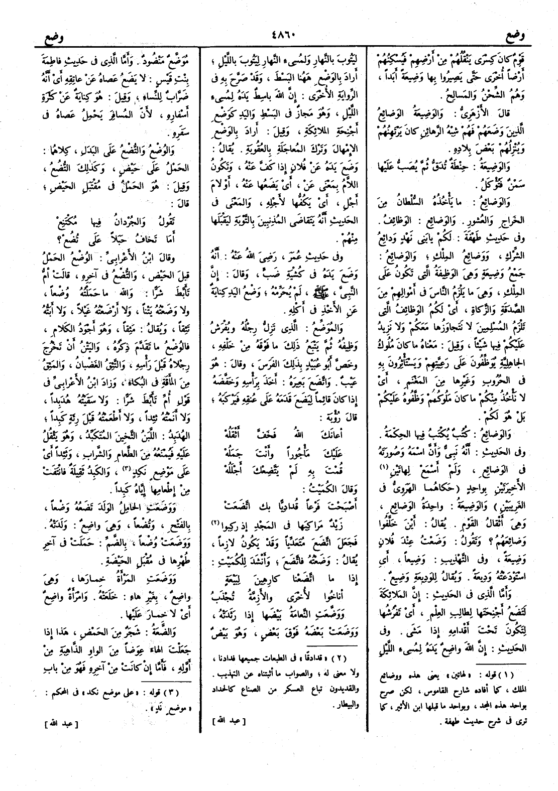 قوم كان كِسْرى ينقلهم من أَرضهم فَيُسْكِنُهم أَرضاً أُخرى حتى يصيروا بها وَضِيعةً أَبداً وهم الشِّحْنُ والمَسالِحُ قال الأَزهري والوَضِيعةُ الوَضائِعُ الذين وضَعَهم فهم شبه الرَّهائِنِ كان يَرْتَهِنُهم وينزلهم بعض بلاده والوَضِيعةُ حِنْطةٌ تُدَقُّ ثم يُصَبُّ عليها سمن فتؤكل والوَضائعُ ما يأْخذه السلطان من الخَراج والعُشور والوَضائِعُ الوَظائِفُ وفي حديث طَهْفَةَ لكم يا بَني نَهْدٍ ودائِعُ الشِّرْكِ ووضائِعُ المِلْكِ والوَضائِعُ جمع وَضيعةٍ وهي الوَظِيفةُ التي تكون على المِلك وهي ما يلزم الناسَ في أَموالهم من الصدَقةِ والزكاةِ أَي لكم الوظائِفُ التي تلزم المسلمين لا نَتجاوزها معكم ولا نَزِيدُ عليكم فيها شيئاً وقيل معناه ما كان ملوك الجاهليةُ يُوَظِّفُون على رعيتهم ويستأْثرون به في الحروب وغيرها من المَغْنَمِ أَي لا نأْخذ منكم ما كان ملوككم وضفوه عليكم بل هو لكم والوَضائِعُ كُتُبٌ يُكْتَبُ فيها الحِكمةُ وفي الحديث أَنه نبيّ وأَن اسْمه وصورَتَه في الوَضائِعِ ولم أَسمع لهاتين الأَخيرتين بواحد حكاهما الهروي في الغريبين والوَضِيعةُ واحدة الوَضائع وهي أَثقالُ القوم يقال أَين خَلَّفُوا وضائِعَهم وتقول وضَعْتُ عند فلان وَضِيعةً وفي التهذيب وَضِيعاً أَي اسْتَوْدَعْتُه ودِيعةً ويقال للوَدِيعةِ وضِيعٌ وأَما الذي في الحديث إِنّ الملائكةَ لَتَضَعُ أَجْنِحَتها لطالب العلم أَي تَفْرُشُها لتكون تحت أَقدامه إِذا مشى وفي الحديث إِن الله واضِعٌ يده لِمُسيء الليلِ لِيَتُوبَ بالنهارِ ولمُسِيء النهار ليتوب بالليل أَراد بالوَضْعِ ههنا البَسْطَ وقد صرح به في الرواية الأُخرى إِن الله باسِطٌ يده لمسيء الليل وهو مجاز في البسط واليد كوضع أَجنحة الملائكة وقيل أَراد بالوضع الإِمْهالَ وتَرْكَ المُعاجَلةِ بالعُقوبة يقال وضَعَ يده عن فلان إِذا كفّ عنه وتكون اللام بمعنى عن أَي يَضَعُها عنه أَو لام الأَجل أَي يكفّها لأَجله والمعنى في الحديث أَنه يَتَقاضَى المذنبين بالتوبة ليَقْبَلَها منهم وفي حديث عمر رضي الله عنه أَنه وضَعَ يدَه في كُشْيةِ ضَبٍّ وقال إِن النبي صلى الله عليه وسلم لم يُحَرِّمه وضعُ اليد كناية عن الأَخذ في أَكله والمُوَضِّعُ الذي تَزِلُّ رِجْلهُ ويُفْرَشُ وظِيفُه ثم يَتْبَعُ ذلك ما فوقه من خلفه وخصّ أَبو عبيد بذلك الفرس وقال هو عيب واتَّضَعَ بعيرَه أَخذ برأْسه وخَفَّضَه إِذا كان قائماً لِيَضَعَ قدمه على عنقه فيركبه قال رؤبة أَعانَكَ اللهُ فَخَفَّ أَثْقَلُهْ عليكَ مأْجُوراً وأَنْتَ جَملُهْ قُمْتَ به لم يَتَّضِحْكَ أَجْلَلُهْ وقال الكميت أَصْبَحْتَ فَرْعا قداد نابك اتَّضَعَتْ زيْدٌ مراكِبَها في المَجْدِ إِذ رَكِبوا
