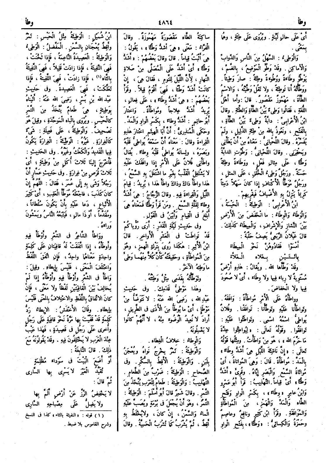 وقد وَطَّأَها اللّهُ ويقال هذه أَرضٌ مُسْتَوِيةٌ لا رِباءَ فيها ولا وِطَاءَ أَي لا صُعُودَ فيها ولا انْخفاضَ [ ص 199 ] وواطَأَه على الأَمر مُواطأَةً وافَقَه وتَواطَأْنا عليه وتَوطَّأْنا تَوافَقْنا وفلان يُواطِئُ اسمُه اسْمِي وتَواطَؤُوا عليه تَوافَقُوا وقوله تعالى ليُواطِئُوا عِدَّةَ مَا حَرَّمَ اللّهُ هو من وَاطَأْتُ ومثلها قوله تعالى إِنّ ناشِئةَ الليلِ هِيَ أَشَدُّ وِطَاءً بالمدّ مُواطأَةً قال وهي المُواتاةُ أَي مُواتاةُ السمعِ والبصرِ ايَّاه وقُرئَ أَشَدُّ وَطْأً أَي قِياماً التهذيب قرأَ أَبو عمرو وابن عامرٍ وِطَاءً بكسر الواو وفتح الطاء والمدّ والهمز من المُواطأَةِ والمُوافقةِ وقرأَ ابن كثير ونافع وعاصم وحمزة والكسائي وَطْأً بفتح الواو ساكنة الطاء مقصورة مهموزة وقال الفرَّاءُ معنى هي أشدُّ وَطْأً يقول هي أَثْبَتُ قِياماً قال وقال بعضهم أَشَدُّ وَطْأً أَي أَشَدُّ على المُصَلِّي من صلاةِ النهار لأَنَّ الليلَ للنوم فقال هي وإِن كانت أَشَدَّ وَطْأً فهي أَقْوَمُ قِيلاً وقرأَ بعضُهم هي أَشَدُّ وِطَاءً على فِعالٍ يريد أَشَدُّ عِلاجاً ومُواطَأَةً واختار أَبو حاتم أَشَدُّ وِطاءً بكسر الواو والمدّ وحكى المنذري أَنَّ أَبا الهيثم اختار هذه القراءة وقال معناه أَنَّ سَمْعَه يُواطِئُ قَلْبَه وبَصَرَه ولِسانُه يُواطِئُ قَلْبَه وِطاءً يقال واطَأَني فلان على الأَمرِ إِذا وافَقَكَ عليه لا يشتغل القلبُ بغير ما اشْتَغَلَ به السمع هذا واطَأَ ذاكَ وذاكَ واطَأَ هذا يريد قِيامَ الليلِ والقراءة فيه وقال الزجاج هي أَشدُّ وِطاءً لقلة السمع ومنْ قَرأً وَطْأً فمعناه هي أَبْلغُ في القِيام وأَبْيَنُ في القول وفي حديثِ ليلةِ القَدْرِ أَرَى رُؤْياكم قد تَواطَتْ في العَشْرِ الأَواخِر قال ابن الأَثير هكذا روي بترك الهمز وهو من المُواطأَةِ وحقيقتُه كأَنّ كُلاً منهما وَطِئَ ما وَطِئَه الآخَرُ وتَوَطَّأْتُهُ بقَدَمِي مثل وَطِئْتُه وهذا مَوْطِئُ قَدَمِك وفي حديث عبداللّه رضي اللّه عنه لا نَتَوَضَّأُ من مَوْطَإٍ أَي ما يُوطَأُ من الأَذَى في الطريق أَراد لا نُعِيدُ الوُضوءَ منه لا أَنهم كانوا لا يَغْسِلُونه والوِطاءُ خلافُ الغِطاء والوَطِيئَةُ تَمْرٌ يُخْرَجُ نَواه ويُعْجَنُ بلَبَنٍ والوَطِيئَةُ الأَقِطُ بالسُّكَّرِ وفي الصحاح الوَطِيئَةُ ضَرْب من الطَّعام التهذيب والوَطِيئةُ طعام للعرب يُتَّخَذُ من التمر وقال شمر قال أَبو أَسْلَمَ الوَطِيئةُ التمر وهو أَن يُجْعَلَ في بُرْمةٍ ويُصَبَّ عليه الماءُ والسَّمْنُ إِن كان ولا يُخْلَطُ به أَقِطٌ ثم يُشْرَبُ كما تُشْرَبُ الحَسِيَّةُ وقال ابن شميل الوَطِيئةُ مثل الحَيْسِ تَمرٌ وأَقِطٌ يُعْجنانِ بالسمن المفضل الوَطِيءُ والوَطيئةُ
