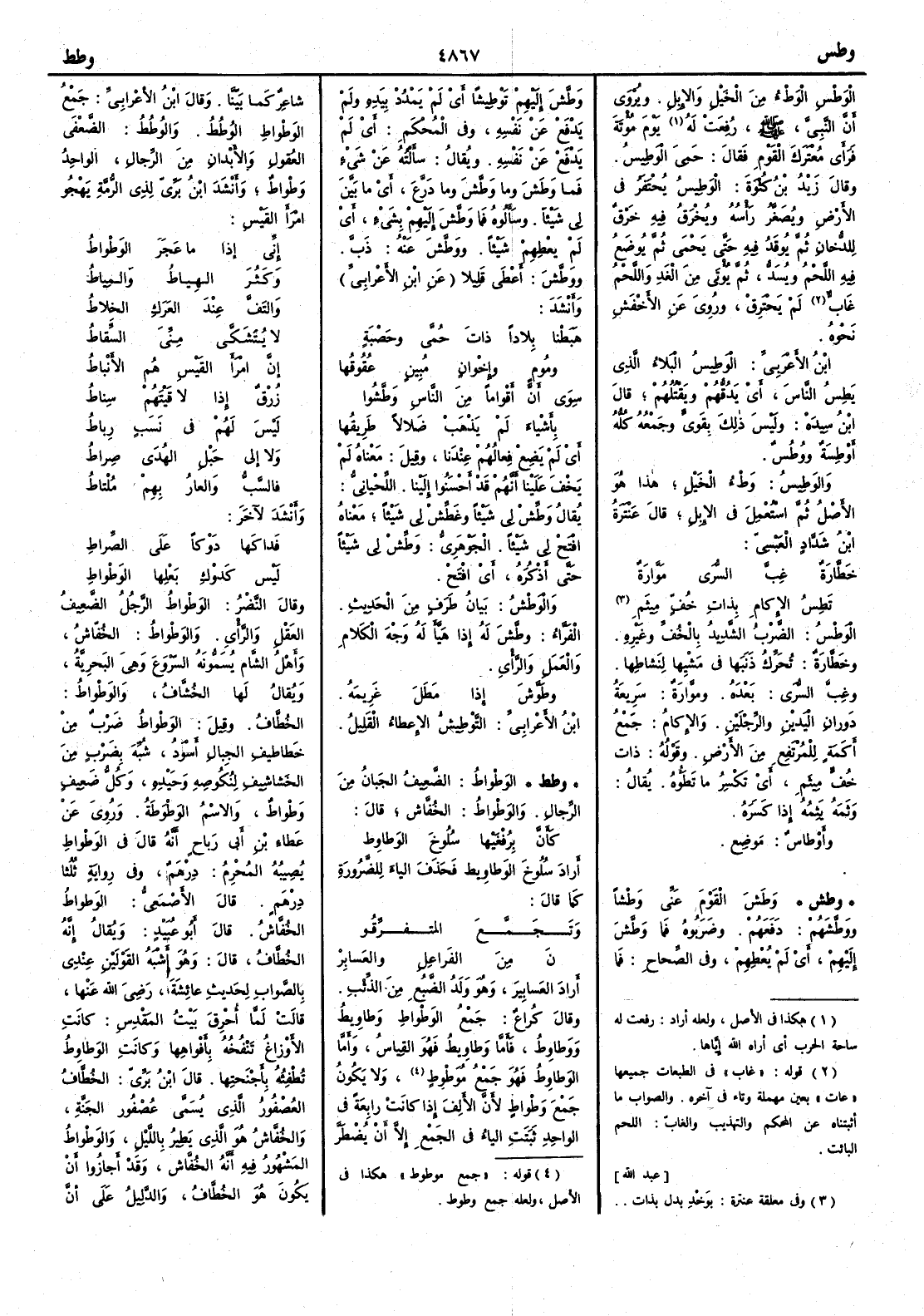 ( * هكذا في الأصل ولعله أَراد رفعت له ساحة الحرب أَو رفعت له المعركة أَي أَبصرها عن بُعد ) يوم مُؤْتَةَ فرأَى معتَرَك القوم فقال حمي الوطيس وقال زيد بن كُثْوة الوَطِيسُ يحتفر في الأَرض ويُصَغَّر رأْسه ويُخْرق فيه خَرْق للدخان ثم يوقد فيه حتى يَحْمى ثم يوضع فيه اللحم ويُسَدّ ثم يؤتى من الغد واللحم عاتٍ لم يحترق وروي عن الأَخفش نحوه ابن الأَعرابي الوَطِيس البلاء الذي يَطِسُ الناس أَي يدقهم ويقتلهم قال ابن سيده وليس ذلك بقويّ وجمعه كله أَوْطِسَة ووُطُسٌ والوَطِيس وطء الخيل هذا هو الأَصل ثم استعمل في الإِبل قال عنترة بن شدَّاد العبسي خَطَّارَة غِبَّ السُّرَى مَوَّارة تَطِسُ الإِكام بذاتِ خُفٍّ مِيْثَم