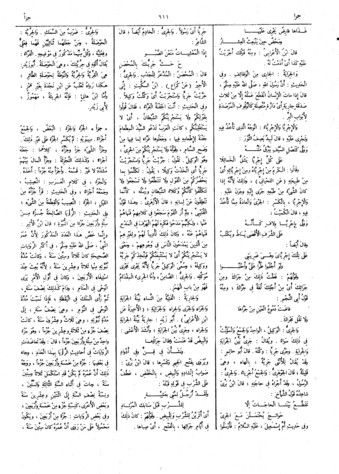 غَذَاها فارِضٌ يَجْرِي عليها ومَحْضٌ حينَ يَنْبَعِثُ العِشارُ قال ابن الأَعرابي ومنه قولك أَجْرَيْتُ عليه كذا أَي أَدَمْتُ له والجِرَايةُ الجارِي من الوظائف وفي الحديث أَن رسول الله صلى الله عليه وسلم قال إذا ماتَ الإنسانُ انْقَطَعَ عَمَلُه إلا من ثلاثٍ صَدَقةٍ جاريةٍ أَي دارَّة متصلة كالوُقُوفِ المُرْصَدَةِ لأَبواب البِرِّ والإجْرِيَّا والإجْرِيَّاءُ الوَجْهُ الذي تأَخذ فيه وتَجْرِي عليه قال لبيد يصف الثور ووَلَّى كنَصْلِ السَّيْفِ يَبْرُقُ مَتْنُه على كلِّ إجْرِيَّا يَشُقُّ الخَمائلا وقالوا الكَرَمُ من إجْرِيَّاهُ ومن إجْرِيَّائه أَي من طَبيعته عن اللحياني وذلك لأَنه إذا كان الشيء من طبعه جَرَى إليه وجَرَنَ عليه والإجْرِيَّا بالكسر الجَرْيُ والعادة مما تأْخذ فيه قال الكميت ووَلَّى بإجْرِيَّا وِلافٍ كأَنه على الشَّرَفِ الأَقْصَى يُساطُ ويُكْلَبُ وقال أَيضاً على تِلْكَ إجْرِيَّايَ وهي ضَريبَتي ولو أَجْلَبُوا طُرّاً عَلَيَّ وأَحْلَبُوا وقولهم فعلتُ ذلك من جَرَاكَ ومن جَرَائِكَ أَي من أَجلك لغة في جَرَّاكَ ومنه قول أَبي النجم فاضَتْ دُمُوعُ العينِ من جَرَّاها ولا تقل مَجْراكَ والجَرِيُّ الوكيلُ الواحد والجمع والمؤنث في ذلك سواء ويقال جَرِيُّ بَيِّنُ الجَرَايةِ والجِرايةِ وجَرَّى جَرِيّاً وكَّلَه قال أَبو حاتم وقد يقال للأُنثى جَرِيَّة بالهاء وهي قليلة قال الجوهري والجمع أَجْرِياءُ والجَرِيُّ الرسول وقد أَجْراه في حاجته قال ابن بري شاهده قول الشماخ تقَطَّعُ بيننا الحاجاتُ إلاَّ حَوائجَ يُحْتَمَلْنَ مع الجَريّ وفي حديث أُم إسمعيل عليه السلام فأَرْسَلُوا جَرِيّاً أَي رسولاً والجَرِيُّ الخادِمُ أَيضاً قال الشاعر إذا المُعْشِياتُ مَنَعْنَ الصَّبُو حَ حَثَّ جَرِيُّكَ بالمُحْصَنِ قال المُحْصَنُ المُدَّخَرُ للجَدْب والجَرِيُّ الأَجير عن كراع ابن السكيت إنِّي جَرَّيْتُ جَرِيّاً واسْتَجْرَيْتُ أَي وكلت وكيلاً وفي الحديث أَنتَ الجَفْنةُ الغَرّاء فقال قُولوا بقَوْلكم ولا يَسْتَجْرِيَنَّكُم الشيطانُ أَي لا يَسْتَغْلِبَنَّكُم كانت العرب تَدْعُو السيدَ المِطْعامَ جَفْنةً لإِطعامه فيها وجعلوها غَرَّاءَ لما فيها من وَضَحِ السَّنامِ وقوله ولا يستجرينكم من الجَرِيِّ وهو الوكيل تقول جَرَّيْتُ جَرِيّاً واستجريتُ جَرِيّاً أَي اتخذت وكيلاً يقول تَكَلَّموا بما يَحْضُركم من القول ولا تتَنَطَّعُوا ولا تَسْجَعُوا ولا تتكلفوا كأَنكم وكلاء الشيطان ورُسُلُه كأَنما تنطقون عن لسانه قال الأَزهري وهذا قول القتيبي ولم أَر القوم سَجَعُوا في كلامهم فنهاهم عنها ولكنهم مَدَحُوا فكَرِهَ لهم الهَرْفَ في المَدْحِ فنهاهم عنه وكان ذلك تأْديباً لهم ولغيرهم من الذين يمدحون الناس في وجوههم ومعنى لا يستجرينكم أَي لا يَسْتتبعنكم فيتخذكم جَرِيَّه ووكِيلَه وسمي الوكيلُ جَرِيّاً لأَنه يَجْري مَجْرَى مُوَكِّله والجَرِيُّ الضامنُ وأَما الجَرِيءُ المِقْدامُ فهو من باب الهمز والجارِيَةُ الفَتِيَّةُ من النساء بيِّنةُ الجَرَاية والجَرَاءِ والجَرَى والجِراء والجَرَائِيَةِ الأَخيرة عن ابن الأَعرابي أَبو زيد جاريةٌ بَبِّنة الجَرايةِ والجَراء وجَرِيّ بيِّنُ الجَرَايَةِ وأَنشد الأَعشى والبِيضُ قد عَنَسَتْ وطالَ جِرَاؤُها ونَشَأْنَ في قِنٍّ وفي أَذْوادِ ويروى بفتح الجيم وكسرها قال ابن بري صواب إِنشاده والبيضِ بالخفضِ عطف على الشَّرْبِ في قوله قبله ولقد أُرَجِّلُ لِمَّتي بعَشِيَّةٍ للشَّرْبِ قبل سَنابِك المُرْتادِ أَي أَتزين للشَّرْبِ وللبِيضِ وقولهم كان ذلك في أَيام جَرَائها بالفتح أَي صِباها والجِرِّيُّ ضرب من السمك والجِرِّيَّة الحَوْصَلة ومن جعلهما ثنائيين فهما فِعْلِيٌّ وفِعْلِيَّة وكل منهما مذكور في موضعه الفراء يقال أَلْقِه في جِرِّيَّتِكَ وهي الحَوْصلة أَبو زيد هي القِرِّيَّةُ والجِرِّيَّةُ والنَّوْطَةُ لحوصلة الطائر هكذا رواه ثعلب ع