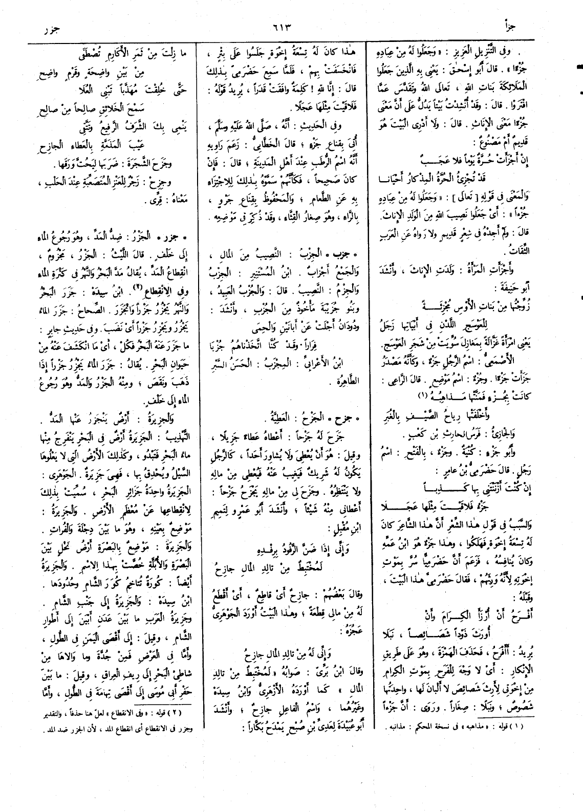 ( * قوله « وفي الانقطاع » لعل هنا خذفاً والتقدير وجزر في الانقطاع أَي اِنقطاع المد لان الجزر ضد المد ) ابن سيده جَزَرَ البحرُ والنهر يَجْزِرُ جَزْراً انْجَزَرَ الصحاح جزر الماءُ يَجْزُرُ ويَجْزِرُ جَزْراً أَي نَضَب وفي حديث جابر ما جَزَرَ عنه البحرُ فَكُلْ أَي ما انكشف عنه من حيوان البحر يقال جَزَرَ الماءُ يَجْزُِرُ جَزْراً إِذا ذهب ونقص ومنه الجَزْر والمَدُّ وهو رجوع الماء إِلى خَلْف والجزِيرةُ أَرضٌ يَنْجَزِرُ عنها المدُّ التهذيب الجزِيرةُ أَرض في البحر يَنُفَرِجُ منها ماء البحر فتبدو وكذلك الأَرض التي لا يعلوها السيل ويُحْدقُ بها فهي جزيرة الجوهري الجزيرة واحدة جزائر البحر سميت بذلك لانقطاعها عن معظم الأَرض والجزيرة موضع بعينه وهو ا بين دِجْلَة والفُرات والجزيرة موضع بالبصرة أَرض نخل بين البصرة والأُبُلَّة خصت بهذا الاسم والجزيرة أَيضاً كُورَةٌ تتاخم كُوَرَ الشام وحدودها ابن سيده والجزيرة إِلى جَنْبِ الشام وجزيرة العرب ما بين عَدَنِ أَبْيَنَ إِلى أَطوارِ الشام وقيل إِلى أَقصى اليمن في الطُّول وأَما في العَرْضِ فمن جُدَّةَ وما والاها من شاطئ البحر إِلى رِيفه العراق وقيل ما بين حفر أَبي موسى إِلى أَقصى تهامة في الطول وأَما