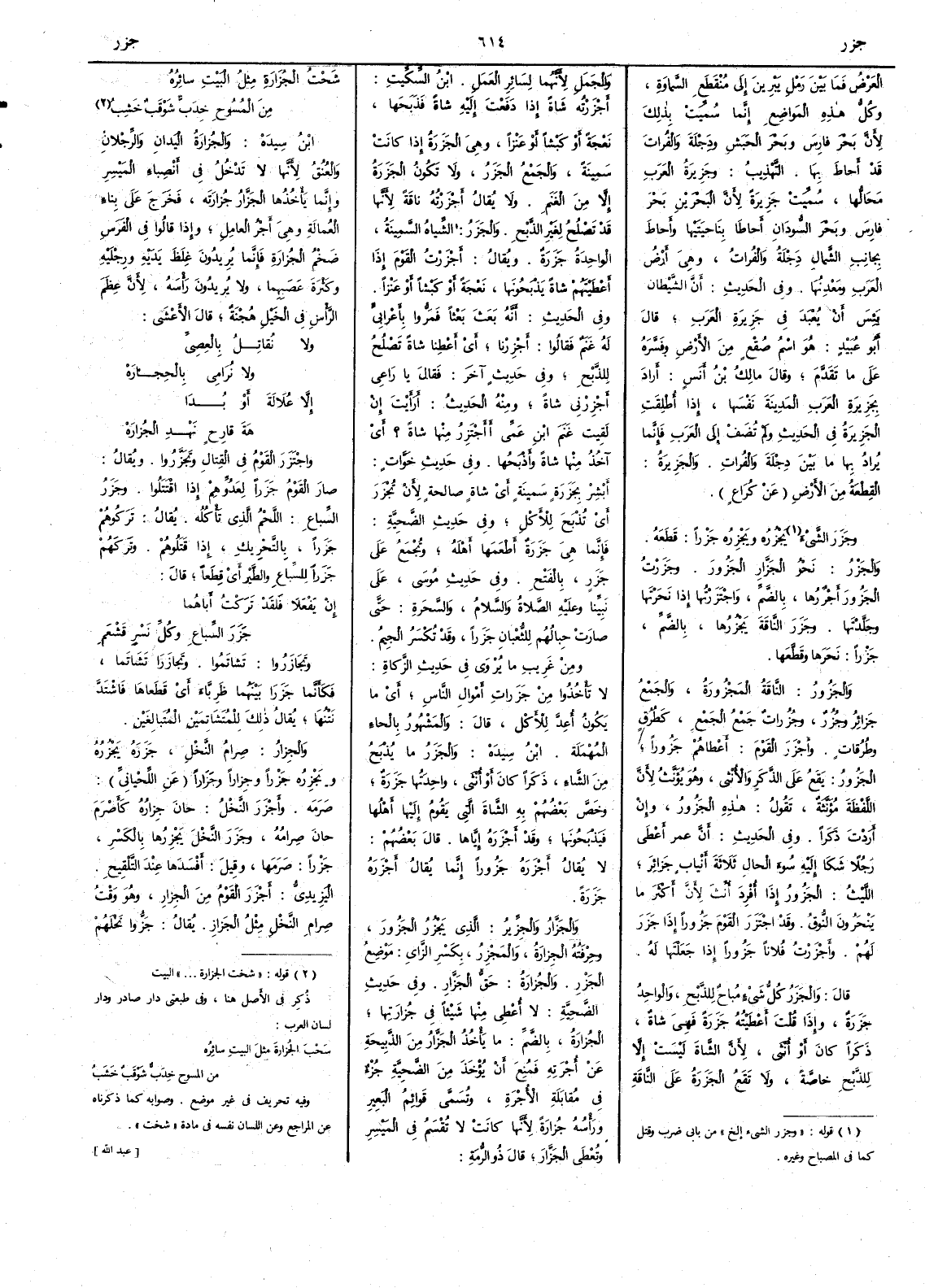 ( * قوله « وجزر الشيء إلخ » من بابي ضرب وقتل كما في المصباح وغيره ) يَجْزُرُه ويَجْزِرُه جَزراً قطعة والجَزْرُ نَحْرُ الجَزَّارِ الجَزُورَ وجَزَرْتُ الجَزُورَ أَجْزُرُها بالضم واجْتَزَرْتُها إِذا نحرتها وجَلَّدْتَها وجَزَرَ الناقة يَجْزُرها بالضم جَزْراً نحرها وقطعها والجَزُورُ الناقة المَجْزُورَةُ والجمع جزائر وجُزُرٌ وجُزُرات جمع الجمع كطُرُق وطُرُقات وأَجْزَرَ القومَ أَعطاهم جَزُوراً الجَزُورُ يقع على الذكر والأُنثى وهو يؤنث لأَن اللفظة مؤنثة تقول هذه الجزور وإِن أَردت ذكراً وفي الحديث أَن عمر أَعطى رجلاً شكا إِليه سُوءَ الحال ثلاثة أَنْيابٍ جَزائرَ الليث الجَزُورُ إِذا أُفرد أُنث لأَن أَكثر ما ينحرون النُّوقُ وقد اجْتَزَرَ القومَ جَزُوراً إِذا جَزَرَ لهم وأَجْزَرْتُ فلاناً جَزُوراً إِذا جعلتها له قال والجَزَرُ كل شيء مباح للذبح والواحد حَزَرَةٌ وإِذا قلت أَعطيته جَزَرَةً فهي شاة ذكراً كان أَو أُنثى لأَن الشاة ليست إِلاَّ للذبح خاصة ولا تقع الجَزَرَةُ على الناقة والجمل لأَنهما لسائر العمل ابن السكيت أَجْزَرْتُه شاةً إِذا دفعت إِليه شاة فذبحها نعجةً أَو كبشاً أَو عنزاً وهي الجَزَرَةُ إِذا كانت سمينة والجمع الجَزَرُ ولا تكون الجَزَرَةُ إِلاَّ من الغنم ولا يقال أَجْزَرْتُه ناقة لأَنها قد تصلح لغير الذبح والجَزَرُ الشياه السمينة الواحدة جَزَرَةٌ ويقال أَجزرت القومَ إِذا أَعطيتهم شاة يذبحونها نعجةً أَو كبشاً أَو عنزاً وفي الحديث أَنه بعث بعثاً فمروا بأَعرابي له غنم فقالوا أَجْزِرْنا أَي أَعطنا شاة تصلح للذبح وفي حديث آخر فقال يا راعي أَجْزِرْني شاةً ومنه الحديث أَرأَيتَ إِن لَقِيتُ غَنَمَ ابن عمي أَأَجْتَزِرُ منها شاةً ؟ أَي آخذ منها شاة وأَذبحها وفي حديث خَوَّاتٍ أَبْشِرْ بِجزَرَةٍ سمينة أَي شاة صالحة لأَنْ تُجْزَرَ أَي تذبح للأَكل وفي حديث الضحية فإِنما هي جَزَرَةٌ أَطَعَمَها أَهله وتجمع على جَزَرٍ بالفتح وفي حديث موسى على نبينا وعليه الصلاة والسلام والسحَرةِ حتى صارت حبالهم للثُّعبان جَزَراً وقد تكسر الجيم ومن غريب ما يروى في حديث الزكاة لا تأْخذوا من جَزَراتِ أَموال الناس أَي ما يكون أُعدّ للأَكل قال والمشهور بالحاء المهملة ابن سيده والجَزَرُ ما يذبح من الشاء ذكراً كان أَو أُنثى جَزَرَةٌ وخص بعضهم به الشاة التي يقوم إِليها أَهلها فيذبحونها وقد أَجْزَرَه إِياها قال بعضهم لا يقال أَجْزَرَه جَزُوراً إِنما يقال أَجْزَرَه جَزَرَةً والجَزَّارُ والجِزِّيرُ الذي يَجْزُر الجَزورَ وحرفته الجِزارَةُ والمَجْزِرُ بكسر الزاي موضع الجَزْر والجُزارَةُ حَقُّ الجَزَّار وفي حديث الضحية لا أُعطي منها شيئاً في جُزارَتها الجزارة بالضم ما يأْخذ الجَزَّارُ من الذبيحة عن أُجرته فمنع أَن يؤْخذ من الضحية جزء في مقابلة الأُجرة وتسمى قوائم البعير ورأْسه جُزارَةً لأَنها كانت لا تقسم في الميسر وتُعْطَى الجَزَّارَ قال ذو الرمّة سَحْبَ الجُزارَة مِثلَ البَيْتِ سائرُهُ مِنَ المُسُوح خِدَبٌّ شَوْقَبٌ خَشَبُ ابن سيده والجُزارَةُ اليدان والرجلان والعنق لأَنها لا تدخل في أَنصباء الميسر وإِنما يأْخذها الجَزَّارُ جُزارَتَه فخرج على بناء العُمالة وهي أَجْرُ العامل وإِذا قالوا في الفرس ضَخْمُ الجُزارَةِ فإِنما يريدون غلظ يديه ورجليه وكَثْرَةَ عَصَبهما ولا يريدون رأْسه لأَن عِظَمَ الرأْس في الخيل هُجْنَةٌ قال الأَعشى ولا نُقاتِلُ بالعِصِيِّ ولا نُرامِي بالحجارَه إِلاَّ عُلالَةَ أَو بُدَا هَةَ قارِحٍ نَهْدِ الجُزارَه واجْتَزَر القومُ في القتال وتَجَزَّرُوا ويقال صار القَوم جَزَراً لعدوّهم إِذا اقتتلوا وجَزَرَ السِّباعِ اللحمُ الذي تأْكله يقال تركوهم جَزَراً بالتحريك إِذا قتلوهم وتركهم جَزَراً للسباع والطير أَي قِطَعاً قال إِنْ يَفْعَلا فلَقَدْ تَرَكْتُ أَباهُما جَزَرَ السِّباعِ وكُلِّ نَسْرٍ قَشْعَمِ وتَجَازَرُوا تشاتموا وتجازرا تشاتماً
