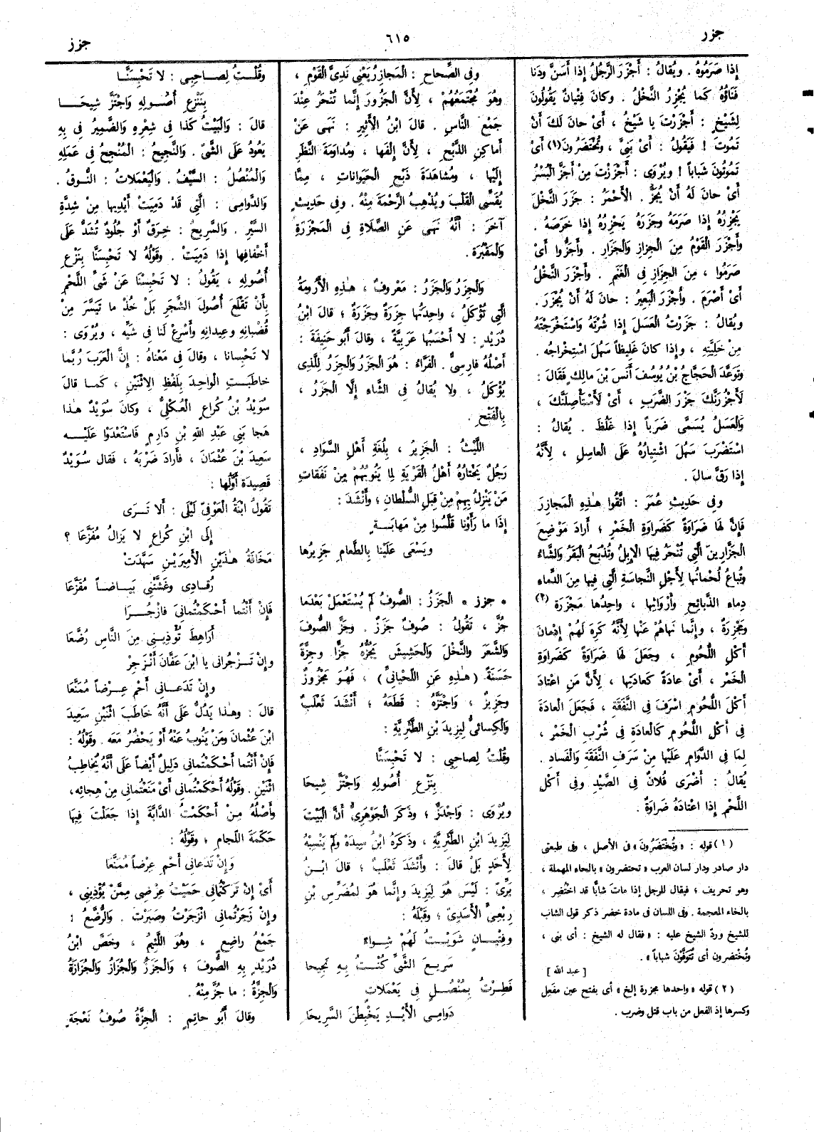 ( * قوله « واحدها مجزرة إلخ » أي بفتح عين مفعل وكسرها إِذ الفعل من باب قتل وضرب ) ومَجْزِرَةٌ وإِنما نهاهم عنها لأَنه كَرِهَ لهم إِدْمانَ أَكل اللحوم وجعلَ لها ضَراوَةً كضراوة الخمر أَي عادة كعادتها لأَن من اعتاد أَكل اللحوم أَسرف في النفقة فجعل العادة في أَكل اللحوم كالعادة في شرب الخمر لما في الدوام عليها من سَرَفِ النفقة والفساد يقال أَضْرَى فلان في الصيد وفي أَكل اللحم إِذا اعتاده ضراوة وفي الصحاح المَجازِرُ يعني نَدِيَّ القوم وهو مُجْتَمَعَهُم لأَن الجَزُورَ إِنما تنحر عند جمع الناس قال ابن الأَثير نهى عن أَماكن الذبح لأَن إِلْفَها ومُداوَمَةَ النظر إِليها ومشاهدة ذبح الحيوانات مما يقسي القلب ويذهب الرحمة منه وفي حديث آخر أَنه نهى عن الصلاة في المَجْزَرَةِ والمَقْبُرَة والجِزَرُ والجَزَرُ معروف هذه الأَرُومَةُ التي تؤكل واحدتها جِزَرَةٌ وجَزَرَةٌ قال ابن دريد لا أَحسبها عربية وقال أَبو حنيفة أَصله فارسي الفرّاء هو الجَزَرُ والجِزَرُ للذي يؤكل ولا يقال في الشاء إِلا الجَزَرُ بالفتح الليث الجَزيرُ بلغة أَهل السواد رجل يختاره أَهل القرية لما ينوبهم من نفقات من ينزل به من قِبَل السلطان وأَنشد إِذا ما رأَونا قَلَّسوا من مَهابَةٍ ويَسْعى علينا بالطعامِ جَزِيرُها