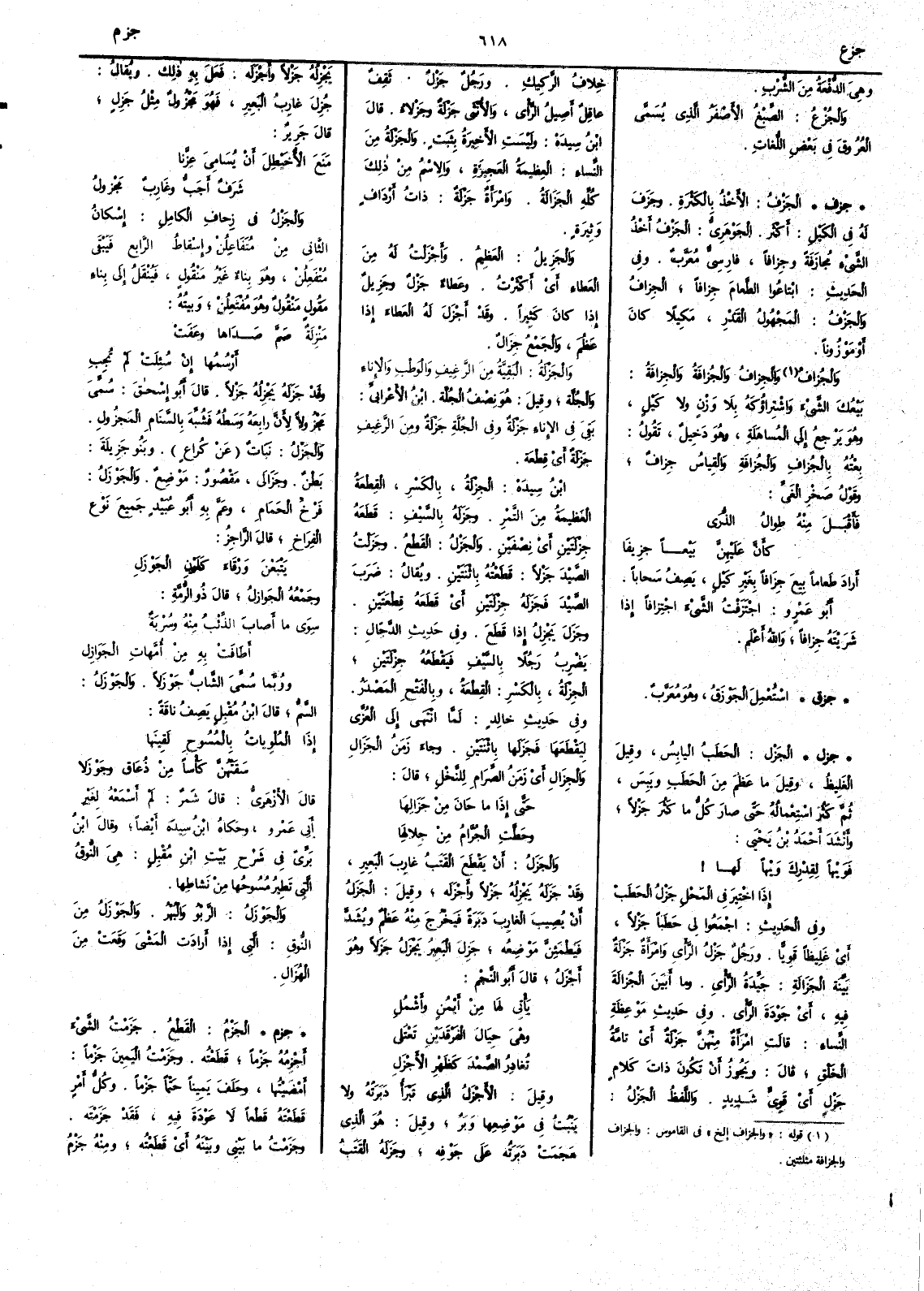 ( جزل ) الجَزْل الحَطَب اليابس وقيل الغَلِيظ وقيل ما عَظُم من الحَطَب ويَبِس ثم كَثُر استعماله حتى صار كُلُّ ما كَثُر جَزْلاً وأَنشد أَحمد بن يحيى فَوَيْهاً لِقِدْرِكَ وَيْهاً لَها إِذا اخْتِيرَ في المَحْل جَزْلُ الحَطَب وفي الحديث اجمعوا لي حَطَباً جَزْلاً أَي غَليظاً قَويًّا ورجل جَزْل الرأْي وامرأَة جَزْلة بَيِّنة الجَزَالة جَيّدة الرأْي وما أَبْيَنَ الجَزالَة فيه أَي جَوْدَةَ الرأْي وفي حديث مَوْعِظة النساء قالت امرأَة منهن جَزْلة أَي تامَّة الخَلْق قال ويجوز أَن تكون ذاتَ كلام جَزْل أَي قَويّ شديد واللفظ الجَزْل خلاف الرَّكِيك ورَجُل جَزْل ثَقِفٌ عاقل أَصيل الرَّأْي والأُنثى جَزْلة وجَزْلاء قال ابن سيده وليست الأَخيرة بِثَبَت والجَزْلة من النساء العَظيمةُ العَجِيزة والاسم من ذلك كلِّه الجَزَالة وامرأَة جَزْلة ذات أَرداف وَثِيرةٍ والجَزِيل العَظِيم وأَجْزَلْت له من العطاء أَي أَكثرت وعطاء جَزْلٌ وجَزيل إِذا كان كثيراً وقد أَجْزَلَ له العطاء إِذا عَظُم والجمع جِزَالٌ والجَزْلة البَقِيَّة من الرَّغيف والوَطْب والإِناء والجُلَّة وقيل هو نِصْفُ الجُلَّة ابن الأَعرابي بَقِي في الإِناء جَزْلة وفي الجُلَّة جَزْلة ومن الرغيف جَزْلة أَي قِطْعَة ابن سيده الجِزْلة بالكسر القِطْعَة العظيمة من التَّمْر وجَزَلَه بالسيف قَطَعه جِزْلَتَيْن أَي نِصْفين والجَزْل القَطْع وجَزَلْت الصَّيْدَ جَزْلاً قطعته باثنتين ويقال ضَرَب الصيد فَجَزله جِزْلتين أَي قَطَعه قِطْعتين وجَزَل يَجْزِل إِذا قَطَع وفي حديث الدجال يَضْرِبُ رجلاً بالسيف فيقطعه جِزْلتين الجِزْلة بالكسر القِطْعة وبالفتح المصدر وفي حديث خالد لما انتهى إِلى العُزَّى ليقطعها فَجَزَلَها باثنتين وجاء زَمَنُ الجَزالِ والجِزَال أَي زمن الصِّرَام للنَّخْل قال حتى إِذا ما حانَ من جَِزَالِها وحَطَّتِ الجُرَّامُ من جِلالها والجَزَل أَن يَقْطَع القَتَبُ غارِبَ البَعِير وقد جَزَله يَجْزِله جَزْلاً وأَجْزَله وقيل الجَزَل أَن يصيب الغاربَ دَبَرَةٌ فيخرجَ منه عَظْمٌ ويُشَدّ فيطمئن مَوْضِعُه جَزِل البَعِيرُ يَجْزَل جَزَلاً وهو أَجْزَل قال أَبو النجم يأْتِي لها مِنْ أَيْمُنٍ وأَشْمُلِ وهْيَ حِيالَ الفَرْقَدَيْن تَعْتَلي تُغَادِرُ الصَّمْدَ كظَهْرِ الأَجْزَل وقيل الأَجْزَل الذي تَبْرأُ دَبَرَته ولا يَنْبُت في موضعها وَبَر وقيل هو الذي هَجَمَت دَبَرته على جَوْفه وجَزَله القَتَبُ يَجْزِله جَزْلاً وأَجزله فعل به ذلك ويقال جُزِل غاربُ البَعير فهو مَجْزول مثل جَزِل قال جرير مَنَعَ الأَخَيْطِلَ أَنْ يُسَامِيَ عِزَّنا شَرَفٌ أَجَبُّ وغَارِبٌ مَجْزولُ والجَزْل في زِحاف الكامل إِسكانُ الثاني من مُتَفَاعِلُن وإِسقاطُ الرابع فيبقى مُتْفَعِلُنْ وهو بناء غير منقول فينقل إِلى بناء مَقُول مَنْقُول وهو مُفْتَعلُن وبيتُه مَنْزِلة صَمَّ صَدَاها وعَفَتْ أَرْسُمُها إِن سُئِلَتْ لم تُجِبِ وقد جَزَله يَجْزِله جَزْلاً قال أَبو إِسحق سُمِّي مَجْزولاً لأَن رابعه وَسَطُه فشُبِّه بالسَّنَام المَجْزول والجَزْل نَبَات عن كراع وبَنُو جَزِيلة بَطنٌ وجَزَالى مَقْصور مَوْضع والجَوْزَل فَرْخُ الحَمَام وعَمَّ به أَبو عبيد جميعَ نوع الفِرَاخ قال الراجز يَتْبَعْنَ وَرْقَاء كَلَوْنِ الجَوْزَلِ وجَمْعُه الجوازل قال ذو الرمة سِوَى ما أَصاب الذّئبُ منه وسُرْبَةٌ أَطافت به من أُمَّهاتِ الجَوَازل وبما سُمِّي الشَّابُّ جَوْزَلاً والجَوْزَل السَّمُّ قال ابن مقبل يَصِف ناقة إِذا المُلْوِيات بالمُسُوح لَقِينَها سَقَتْهُنَّ كأْساً من ذُغَاقٍ وجَوْزَلا قال الأَزهري قال شمر لم أَسمعه لغير أَبي عمرو وحكاه ابن سيده أَيضاً وقال ابن بري في شرح بيت ابن مقبل هي النوق التي تطير مسوحها من نشاطها والجَوْزَل الرَّبْو والبُهْر والجَوْزَل من النُّوق التي إِذا أَرادت المَشْي وَقَعَت من الهُزَال