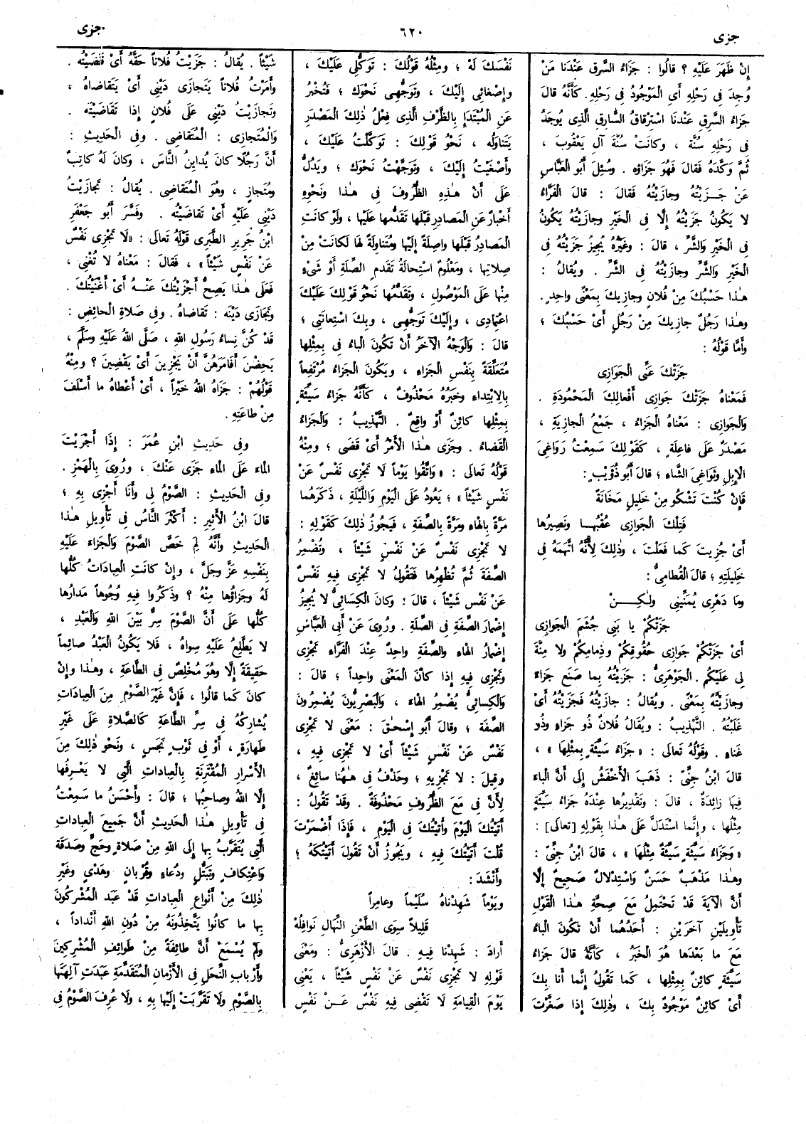 إِن ظَهَر عليه ؟ قالوا جزاء السَّرِقِ عندنا مَنْ وُجِدَ في رَحْله أَي الموجود في رحله كأَنه قال جَزاء السَّرِقِ عندنا استرقاق السارِقِ الذي يوجد في رَحْله سُنَّة وكانت سُنَّة آل يعقوب ثم وَكَّده فقال فهو جَزاؤه وسئل أَبو العباس عن جَزَيْته وجازَيْته فقال قال الفراء لا يكون جَزَيْتُه إِلاَّ في الخير وجازَيْته يكون في الخير والشر قال وغيره يُجِيزُ جَزَيْتُه في الخير والشر وجازَيْتُه في الشَّرّ ويقال هذا حَسْبُك من فلان وجازِيكَ بمعنىً واحد وهذا رجلٌ جازِيكَ من رجل أَي حَسْبُك وأَما قوله جَزَتْكَ عني الجَوَازي فمعناه جَزتْكَ جَوازي أَفعالِك المحمودة والجَوازي معناه الجَزاء جمع الجازِية مصدر على فاعِلةٍ كقولك سمعت رَوَاغِيَ الإِبل وثَوَاغِيَ الشاءِ قال أَبو ذؤَيب فإِنْ كنتَ تَشْكُو من خَليلٍ مَخانَةً فتلك الجَوازي عُقْبُها ونَصِيرُها أَي جُزِيتَ كما فعَلْتَ وذلك لأَنه اتَّهَمه في خليلتِه قال القُطاميُّ وما دَهْري يُمَنِّيني ولكنْ جَزتْكُمْ يا بَني جُشَمَ الجوازي أَي جَزَتْكُم جَوازي حُقُوقكم وذِمامِكم ولا مِنَّةَ لي عليكم الجوهري جَزَيْتُه بما صنَعَ جَزاءً وجازَيْتُه بمعنىً ويقال جازَيْتُه فجَزَيْتُه أَي غَلَبْتُه التهذيب ويقال فلانٌ ذو جَزاءٍ وذو غَناءٍ وقوله تعالى جَزاء سيئة بمثلها قال ابن جني ذهب الأَخفش إِلى أَن الباء فيها زائدة قال وتقديرها عنده جَزاءُ سيئة مثلُها وإِنما استدل على هذا بقوله وجَزاءُ سيئةٍ سيئةٌ مِثْلُها قال ابن جني وهذا مذهب حسن واستدلال صحيح إِلا أَن الآية قد تحتمل مع صحة هذا القول تأْويلين آخرين أَحدهما أَن تكون الباء مع ما بعدها هو الخبر كأَنه قال جزاءُ سيئة كائنٌ بمثلها كما تقول إِنما أَنا بك أَي كائنٌ موجود بك وذلك إِذا صَغَّرت نفسك له ومثله قولك توكلي عليك وإِصغائي إِليك وتوَجُّهي نحوَك فتخبر عن المبتدإِ بالظرف الذي فِعْلُ ذلك المصدر يتَناوَلُه نحو قولك توكلت عليك وأَصغيت إِليك وتوجهت نحوك ويدل على أَنَّ هذه الظروفَ في هذا ونحوه أَخبار عن المصادر قبلها تَقَدُّمها عليها ولو كانت المصادر قبلها واصلة إِليها ومتناولة لها لكانت من صلاتها ومعلوم استحالة تقدُّم الصِّلة أَو شيءٍ منها على الموصول وتقدُّمُها نحوُ قولك عليك اعتمادي وإِليك توجهي وبك استعانتي قال والوجه الآخر أَن تكون الباء في بمثلها متعلقة بنفس الجزاء ويكون الجزاء مرتفعاً بالابتداء وخبرة محذوف كأَنه جزاءُ سيئة بمثلها كائن أَو واقع التهذيب والجَزاء القَضاء وجَزَى هذا الأَمرُ أَي قَضَى ومنه قوله تعالى واتَّقُوا يوماً لا تَجْزي نفسٌ عن نفس شيئاً يعود على اليوم والليلة ذكرهما مرة بالهاء ومرة بالصفة فيجوز ذلك كقوله لا تَجْزي نفسٌ عن نفس شيئاً وتُضْمِرُ الصفةَ ثم تُظْهرها فتقول لا تَجْزي فيه نفسٌ عن نفس شيئاً قال وكان الكسائي لا يُجِيزُ إِضمار الصفة في الصلة وروي عن أَبي العباس إِضمارُ الهاء والصفةِ واحدٌ عند الفراء تَجْزي وتَجْزي فيه إِذا كان المعنى واحداً قال والكسائي يضمر الهاء والبصريون يضمرون الصفة وقال أَبو إِسحق معنى لا تَجْزي نفس عن نفس شيئاً أَي لا تَجْزي فيه وقيل لا تَجْزيه وحذف في ههنا سائغٌ لأَن في مع الظروف محذوفة وقد تقول أَتيتُك اليومَ وأَتيتُك في اليوم فإِذا أَضمرت قلتَ أَتيتك فيه ويجوز أَن تقول أَتَيْتُكه وأَنشد ويوماً شَهِدْناه سُلَيْماً وعامِراً قَليلاً سِوَى الطَّعْنِ النِّهَالِ نَوافِلُهْ أَراد شهدنا فيه قال الأَزهري ومعنى قوله لا تَجْزي نفسٌ عن نفس شيئاً يعني يوم القيامة لا تَقْضِي فيه نفْسٌ شيئاً جَزَيْتُ فلاناً حَقَّه أَي قضيته وأَمرت فلاناً يَتَجازَى دَيْني أَي يتقاضاه وتَجازَيْتُ دَيْني على فلان إِذا تقاضَيْتَه والمُتَجازي المُتَقاضي وفي الحديث أَن رجلاً كان يُدايِنُ الناس وكان له كاتبٌ ومُتَجازٍ وهو المُتَقاضي يقال تَجازَيْتُ دَيْني عليه أَي تقاضَيْته وفسر أَبو جعفر بن جرير الطَّبَرِيُّ قوله تعالى لا تَجْزي نفْسٌ