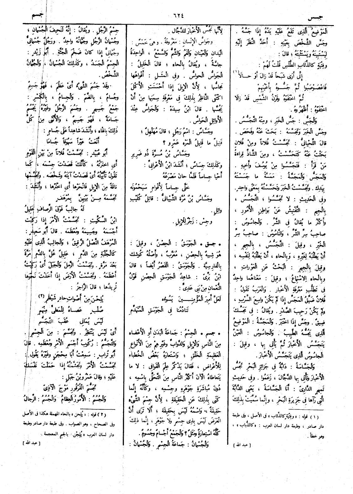 ( جسم ) الجِسْمُ جماعة البَدَنِ أو الأعضاء من الناس والإبل والدواب وغيرهم من الأنواع العظيمة الخَلْق واستعاره بعض الخطباء للأعراض فقال يذكر عِلْم القَوافي لا ما يتعاطاه الآن أَكثر الناس من التَّحَلي باسمه دون مباشرة جَوْهَره وجِسْمه وكأَنه إنما كَنى بذلك عن الحقيقة لأن جِسْم الشيء حقيقةٌ واسْمه ليس بحقيقة ألا ترى أن العَرَض ليس بذي جِسْمٍ ولا جَوْهَرٍ إنما ذلك كله استعارة ومَثَلٌ ؟ والجمع أَجْسامٌ وجُسومٌ والجُسْمانُ جماعة الجِسْمِ والجُسْمانُ جِسْمُ الرجل ويقال إنه لنَحيفُ الجُسْمان وجُسمانُ الرجلُ وجُثْمانُه واحد ورجُل جُسْمانيٌّ وجثْمانيٌّ إذا كان ضَخْم الجُثَّة أبو زيد الجِسْمُ الجَسَدُ وكذلك الجُسْمانُ والجُثْمانُ الشخص وقد جَسُمَ الشيءُ أَي عَظُمَ فهو جَسِيمٌ وجُسام بالضم والجِسامُ بالكسر جمع جَسيمٍ وجَسُمَ الرجلُ وغيره يَجْسُمُ جَسامةً فهو جَسِيمٌ والأُنثى من كل ذلك بالهاء وأَنشد شاهداً على جُسامٍ أَنْعَتُ عَيْراً سَهُوَقاً جُساما أبو عبيد تجَسَّمْتُ فلاناً من بين القوم أي اخترته كأَنك قصدت جِسْمَه كما تقول تأَيَّيْتُه أي قصدت آيَتَه وشخصه وتَجَسَّمْها ناقةً من الإبل فانْحَرْها أي اخْتَرْها وأَنشد تَجَسَّمَه من بَينِهِنَّ بمُرْهَفٍ له جالِبٌ فوق الرِّصاف عَلِيلُ ابن السكيت تَجَسَّمْتُ الأَمْرَ إذا ركبت أَجْسَمَه وجَسِيمَه ومُعْظَمه قال أَبو سعيد المُرْهَفُ النَّصْلُ الرقيق والجالب الذي عليه كالجُلْبَةِ من الدم عَليلٌ عُلَّ بالدم مرةً بعد مرة وتَجَسَّمْتُ الرملَ والجبل أي ركبت أَعظمه وتَجَسَّمْتُ الأرضَ إذا أَخذتَ نحوَها تريدها قال الراجز يُلِجْنَ من أصواتِ حادٍ شَيْظَمِ صُلْبٍ عَصاهُ للمَطيّ مِنْهَمِ ليس يُماني عُقَبَ التَّجَسُّم أي ليس يَنْتَظر وتَجَسَّمَ من الجِسْم والتَّجَسُّمُ ركوب أَجْسمِ الأمرِ ومُعْظَمِه قال أبو تراب سمِعت أبا مِحْجَنٍ وغيرهَ يقول تَجَسَّمْتُ الأَمر وتَجشَّمْتُهُ إذا حَمَلْت نفسك عليه وقال عمرو بن جَبَلٍ تَجَسَّمَ القُرْقُور مَوْجَ الآذيّ والجُسُم الأُمور العظام والجُسُمُ الرجال
