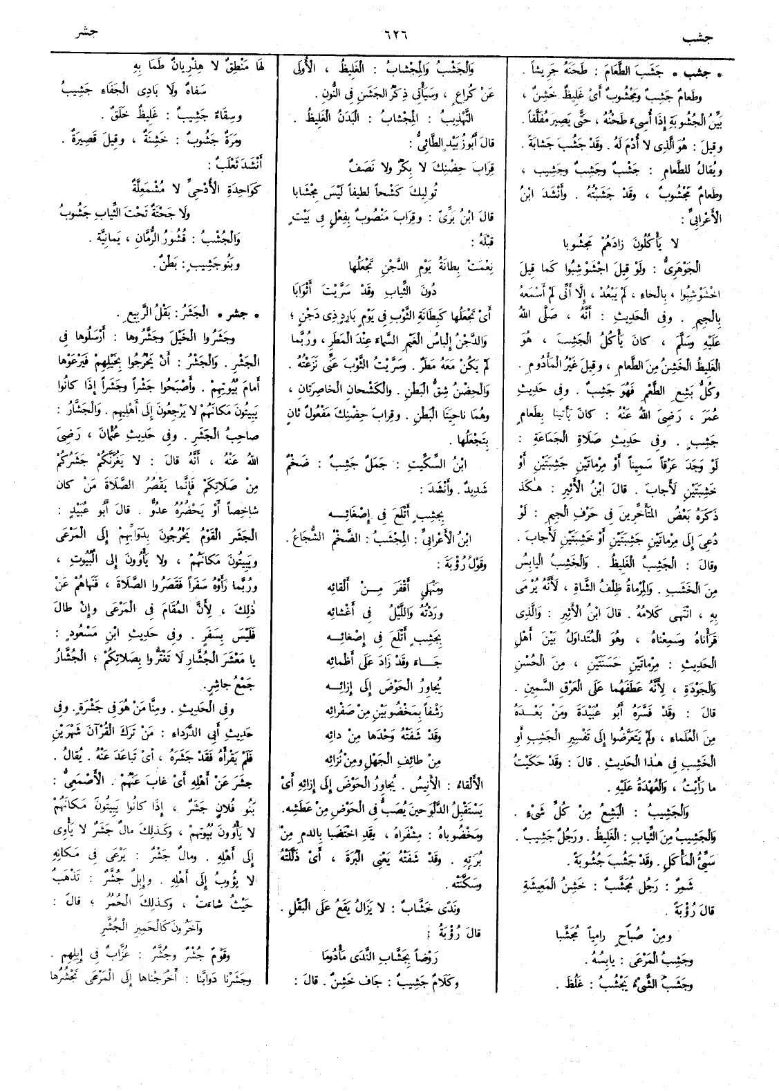 ( جشب ) جَشَبَ الطعامَ طَحَنه جَريشاً وطَعامٌ جَشِبٌ ومَجْشُوبٌ أَي غليظ خَشِنٌ بَيِّنُ الجُشُوبةِ إِذا أُسِيءَ طَحْنُه حتى يَصير مُفَلَّقاً وقيل هو الذي لا أُدْمَ له وقد جَشُبَ جَشابةً ويقال للطعام جَشْبٌ وجَشِبٌ وجَشِيبٌ وطَعامٌ مَجْشُوبٌ وقد جَشَبْتُه وأَنشد ابن الأَعرابي لا يَأْكُلُونَ زادَهُمْ مَجْشُوبا الجوهري ولو قيل اجْشَوْشِبُوا كما قيل اخْشَوْشِبُوا بالخاء لم يبعد إِلا أَني لم أَسمعه بالجيم وفي الحديث أَنه صلى اللّه عليه وسلم كان يأْكل الجَشِبَ هو [ ص 266 ] الغَلِيظُ الخَشِنُ من الطَّعامِ وقيل غيرُ المأْدوم وكلُّ بَشِعِ الطَّعْم فهو جَشِبٌ وفي حديث عمر رضي اللّه عنه كان يأْتينا بطعام جَشِبٍ وفي حديث صلاة الجماعة لو وَجَد عَرْقاً سَمِيناً أَو مِرْماتَيْنِ جَشِبَتَيْنِ أَو خَشِبَتَيْنِ لأَجاب قال ابن الأَثير هكذا ذكره بعض المتأَخرين في حرف الجيم لو دُعِيَ إِلى مِرْماتَيْنِ جَشِبَتَيْنِ أَو خَشِبَتَيْنِ لأَجاب وقال الجَشِبُ الغليظ والخَشِبُ اليابس من الخَشَبِ والمِرْماةُ ظِلْفُ الشاةِ لأَنه يُرْمى به انتهى كلامه قال ابن الأَثير والذي قرأْناه وسمعناه وهو المُتداوَل بين أَهل الحديث مِرْماتَين حَسَنَتَيْن من الحُسْنِ والجَوْدة لأَنه عطفهما على العَرْقِ السَّمِين قال وقد فسره أَبو عبيدة ومَنْ بعده من العلماء ولم يتعرّضوا إِلى تفسير الجَشِب أَو الخَشِب في هذا الحديث قال وقد حكيت ما رأَيت والعُهدة عليه والجَشِيبُ البَشِعُ من كلِّ شيءٍ والجَشِيبُ من الثياب الغليظ ورجلٌ جَشِيبٌ سَيِّئُ المَأْكلِ وقد جَشُبَ جُشُوبةً شمر رَجُلٌ مُجَشَّبٌ خَشِنُ المَعيشةِ قال رؤبة ومن صُباحٍ رامِياً مُجَشَّبا وجَشِبُ المَرْعى يابِسُه وجَشَبَ الشيءُ يَجْشُبُ غَلُظَ والجَشْبُ والمِجْشابُ الغليظُ الأُولى عن كراع وسيأْتي ذكر الجَشَنِ في النون التهذيب المِجْشابُ البَدَنُ الغَلِيظُ قال أَبو زُبَيْد الطائي